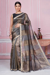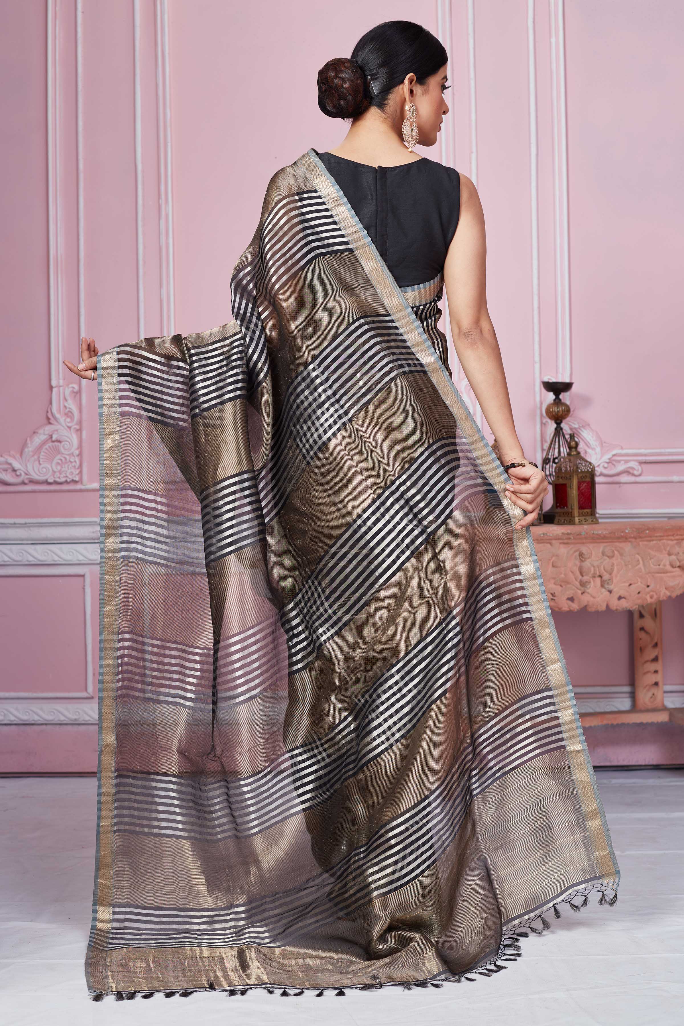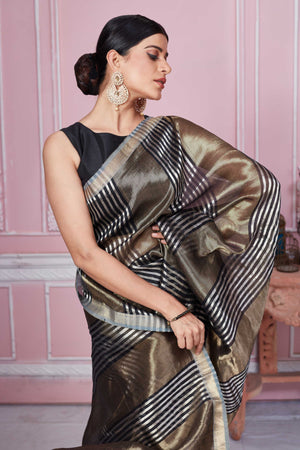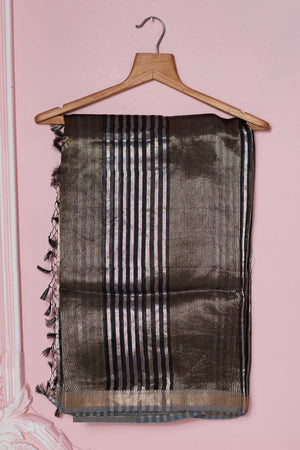 Beautiful antique golden and striped Banarasi saree with is a perfect choice for festive occasions. It comes with a matching blouse piece.