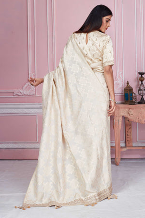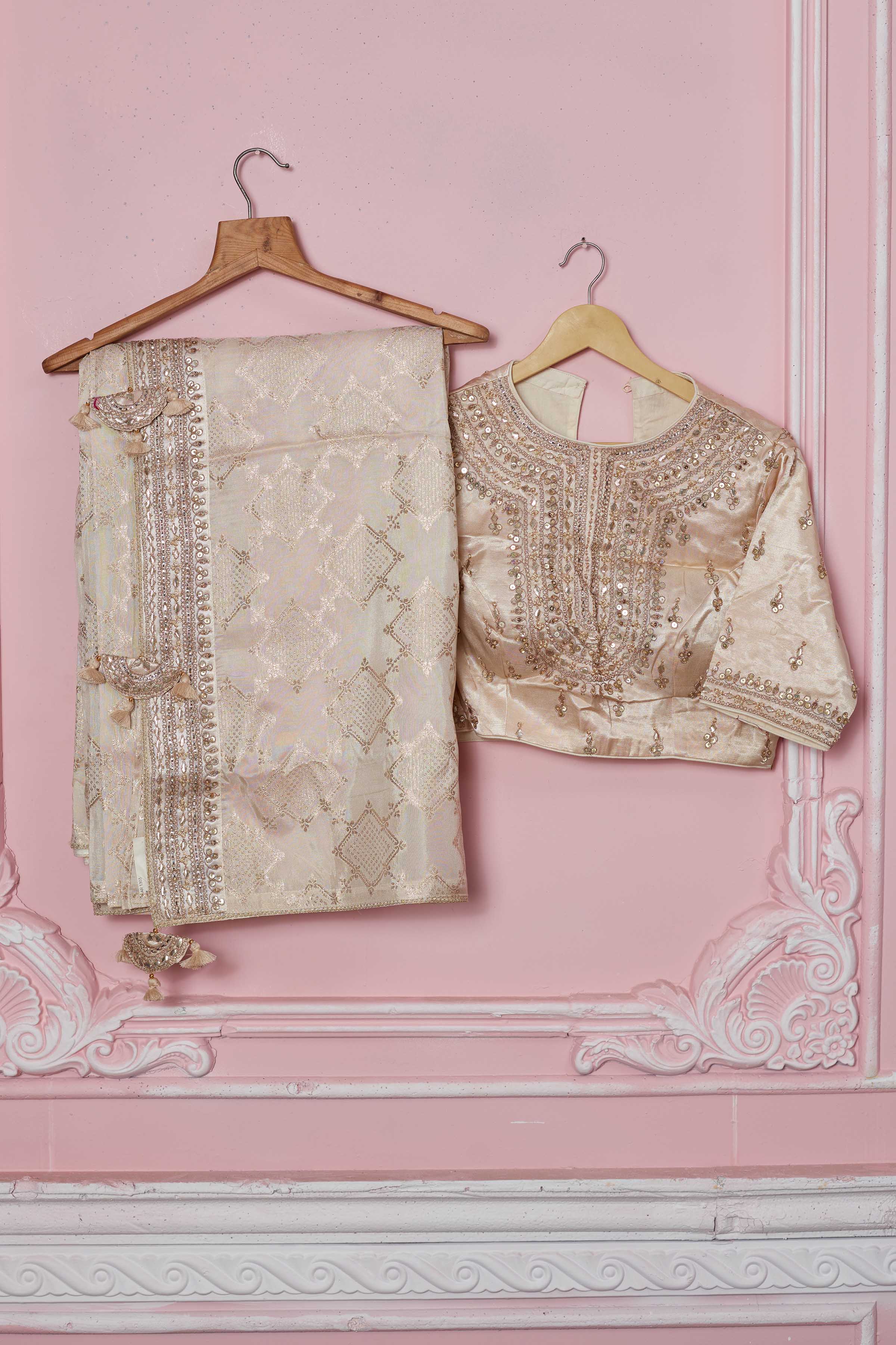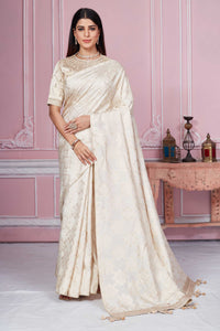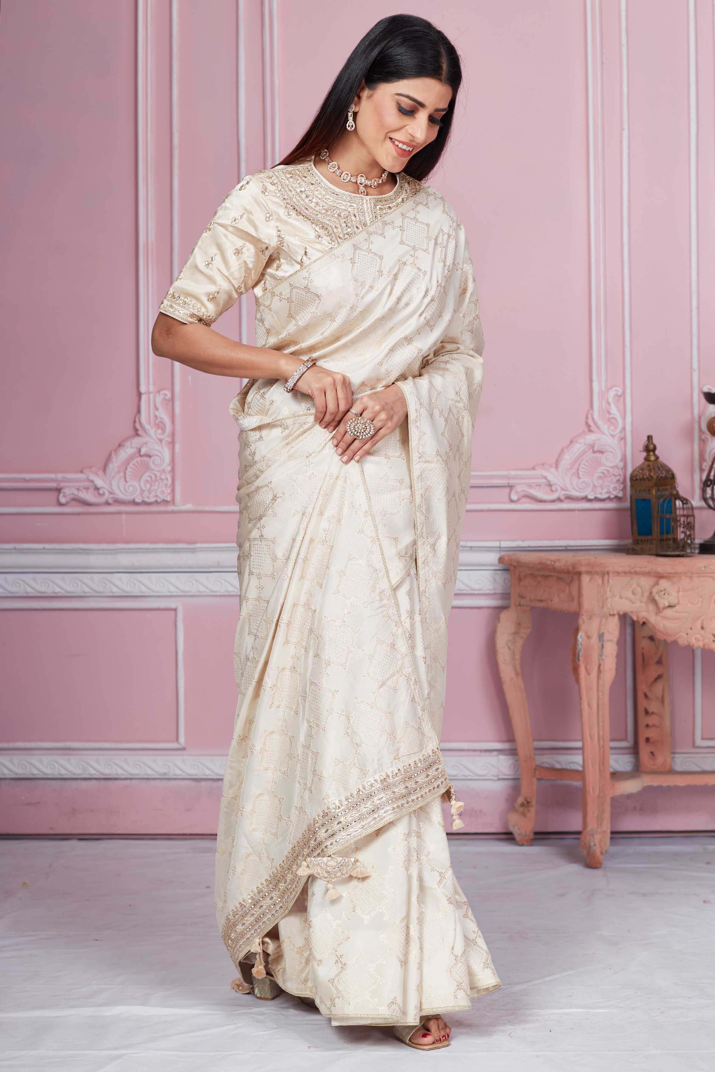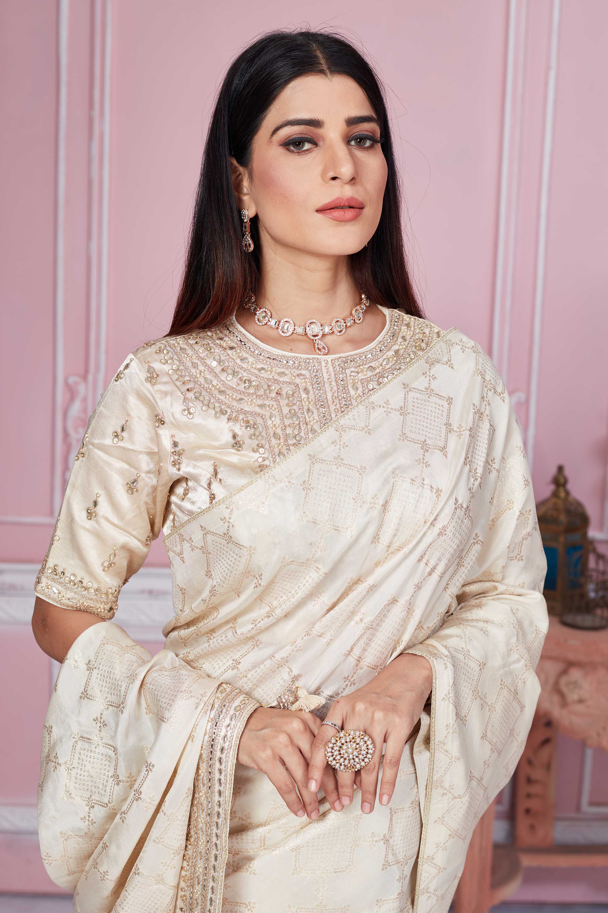 Flaunt your elegant style on festive occasions in this cream embroidered silk saree. It comes with an embroidered saree blouse