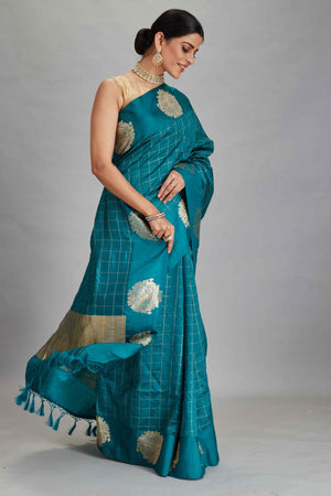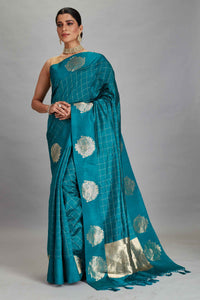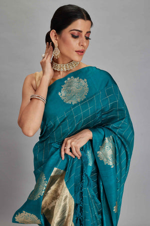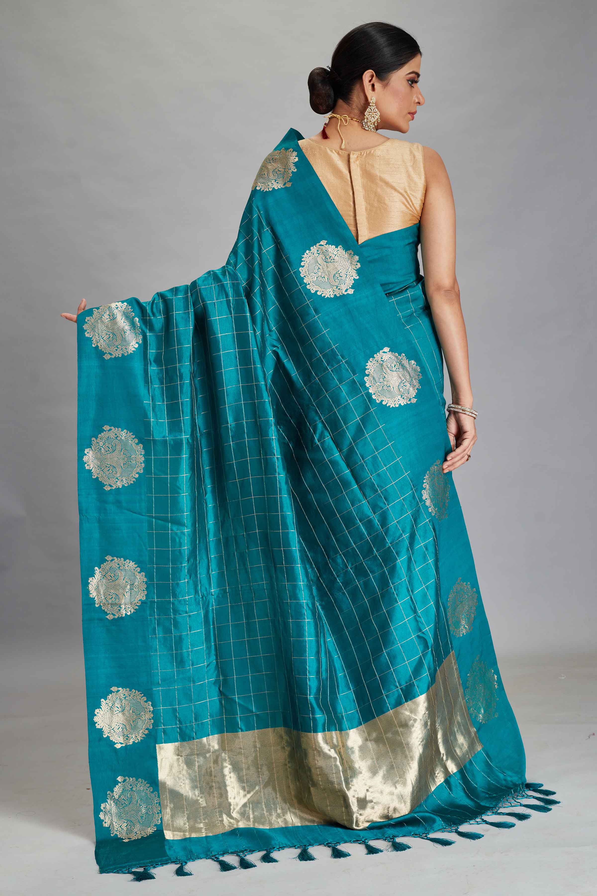 The charm of this sea green silk Banarasi saree is sure to leave everyone awestruck! It is enhanced with zari motifs border and comes with a red blouse piece.