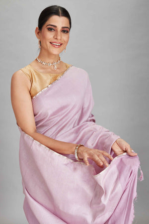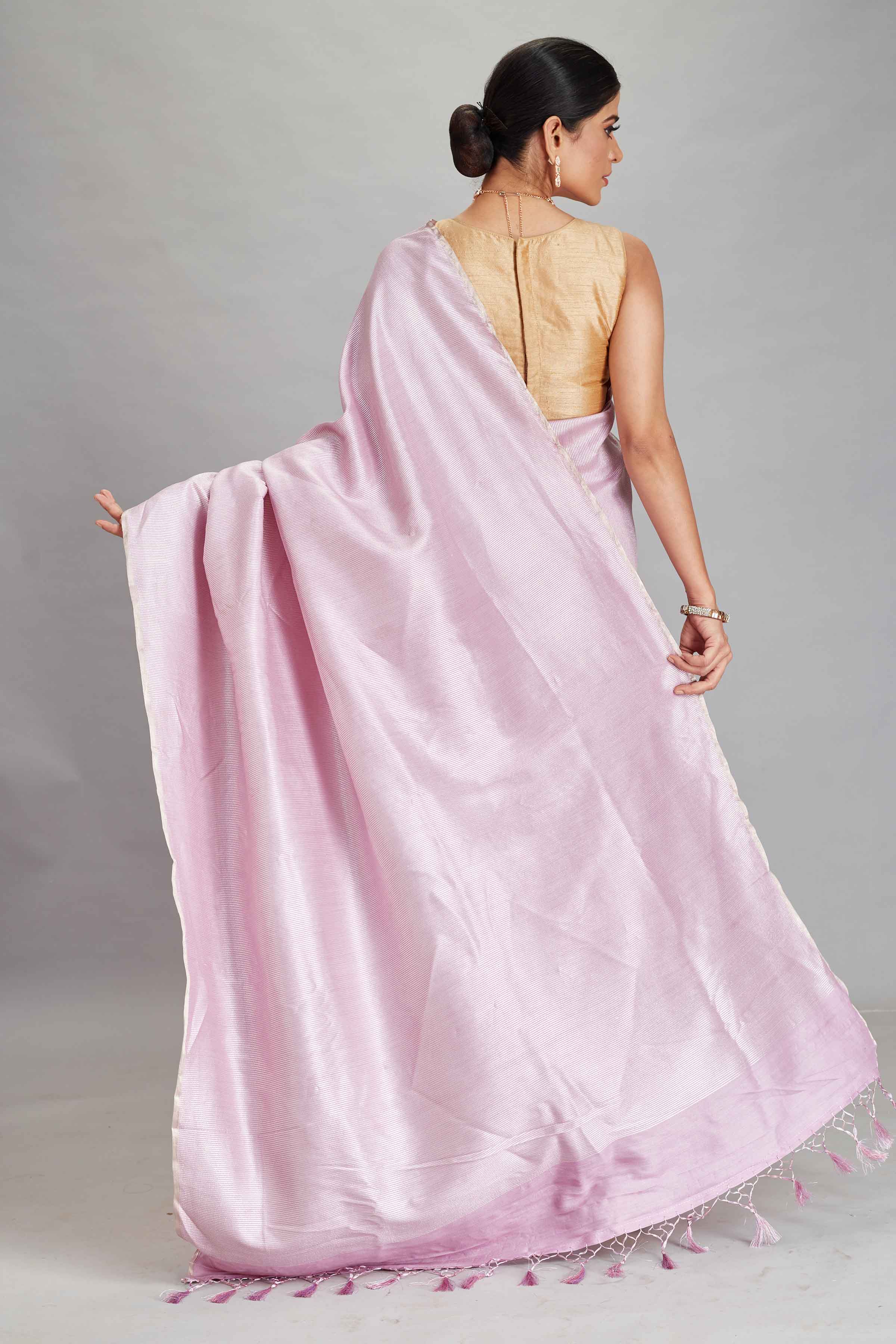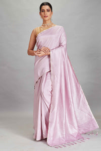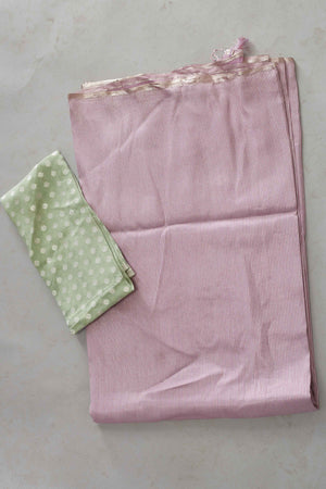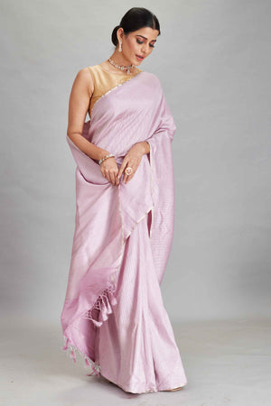 The charm of this lilac Muga Banarasi sari is sure to leave everyone awestruck! It is enhanced with zari stripes and comes with a pista green blouse piece.