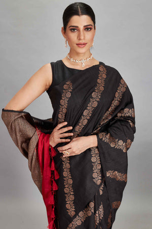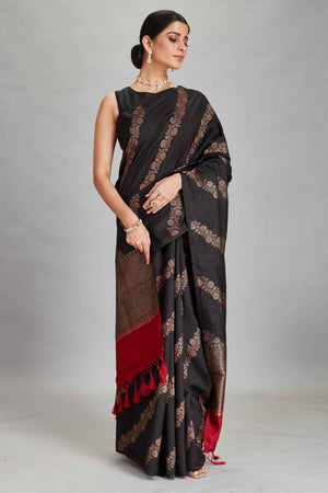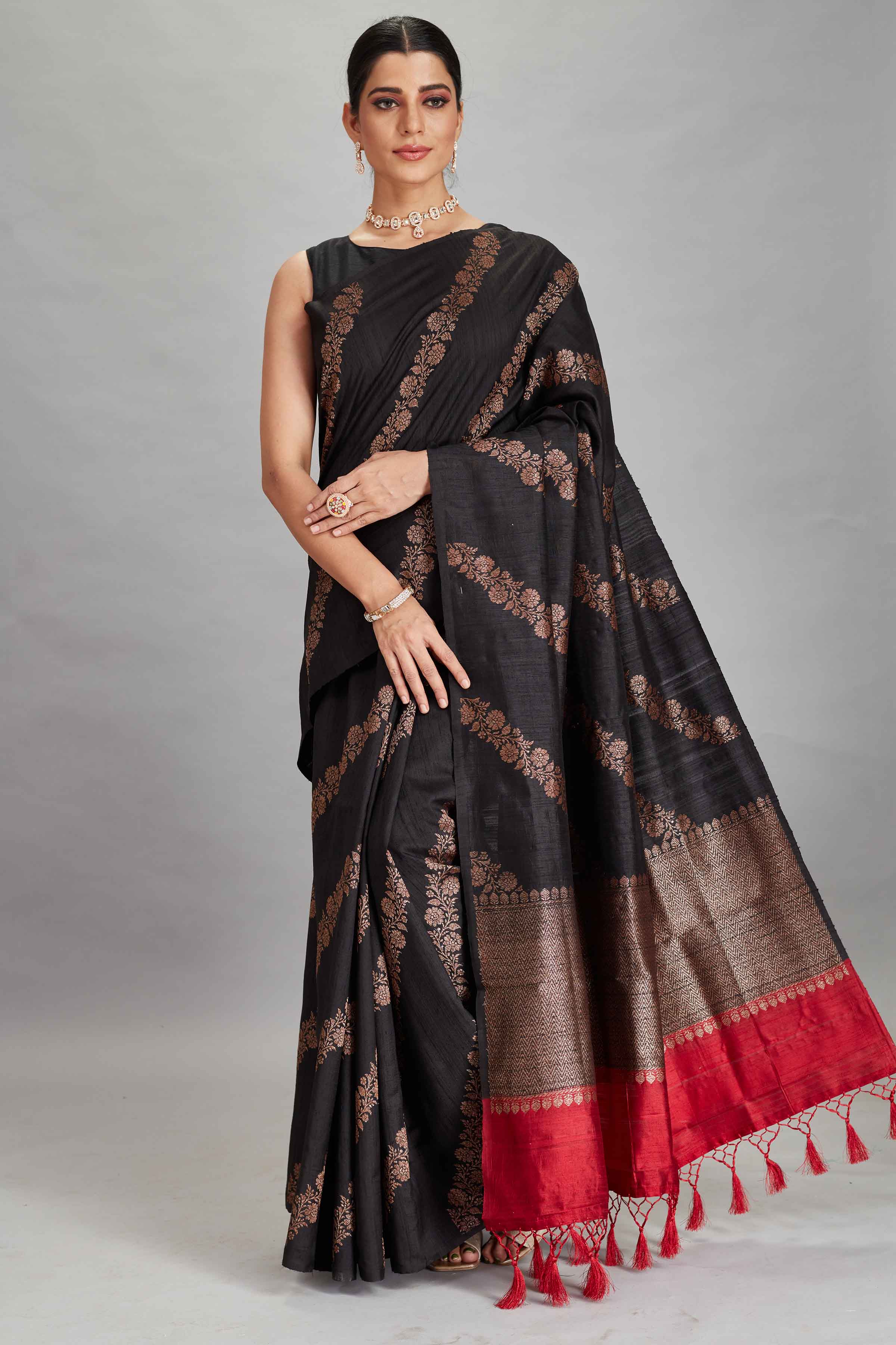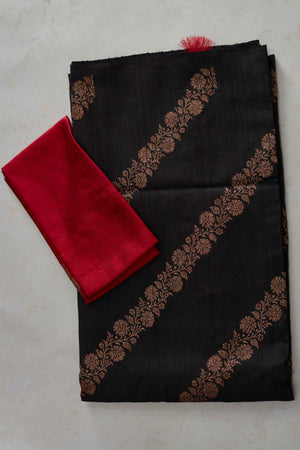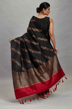 The charm of this black tussar Banarasi sari is sure to leave everyone awestruck! It is enhanced with zari creeper and comes with a red blouse piece.
