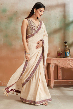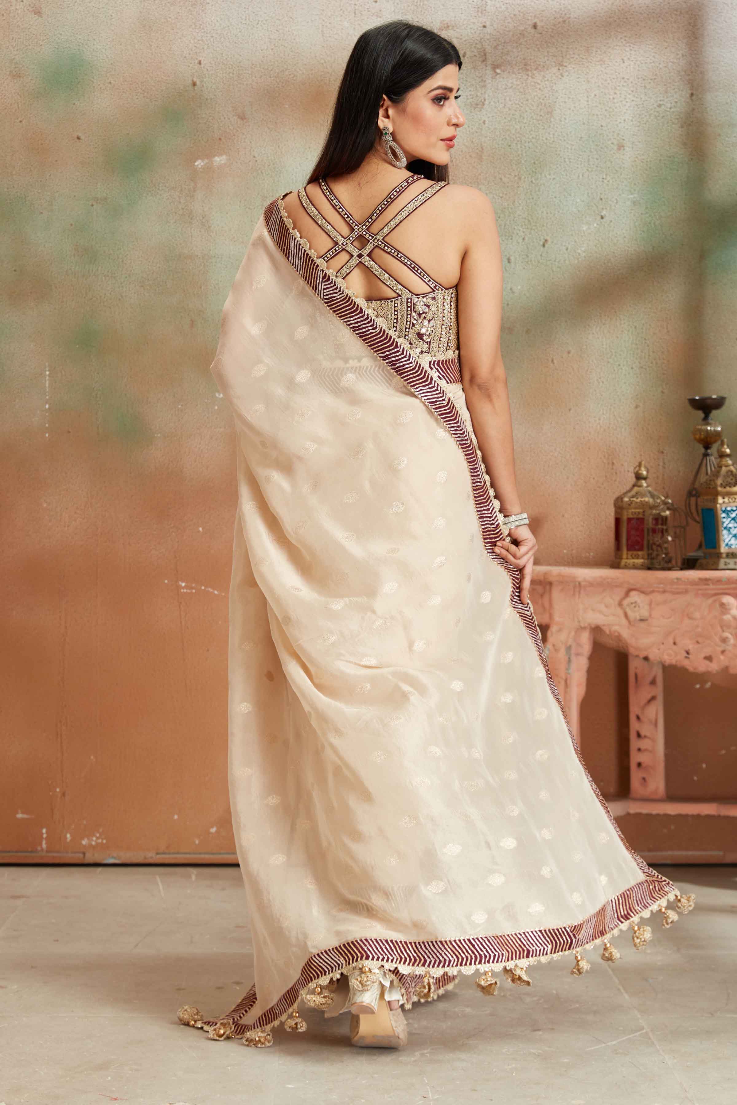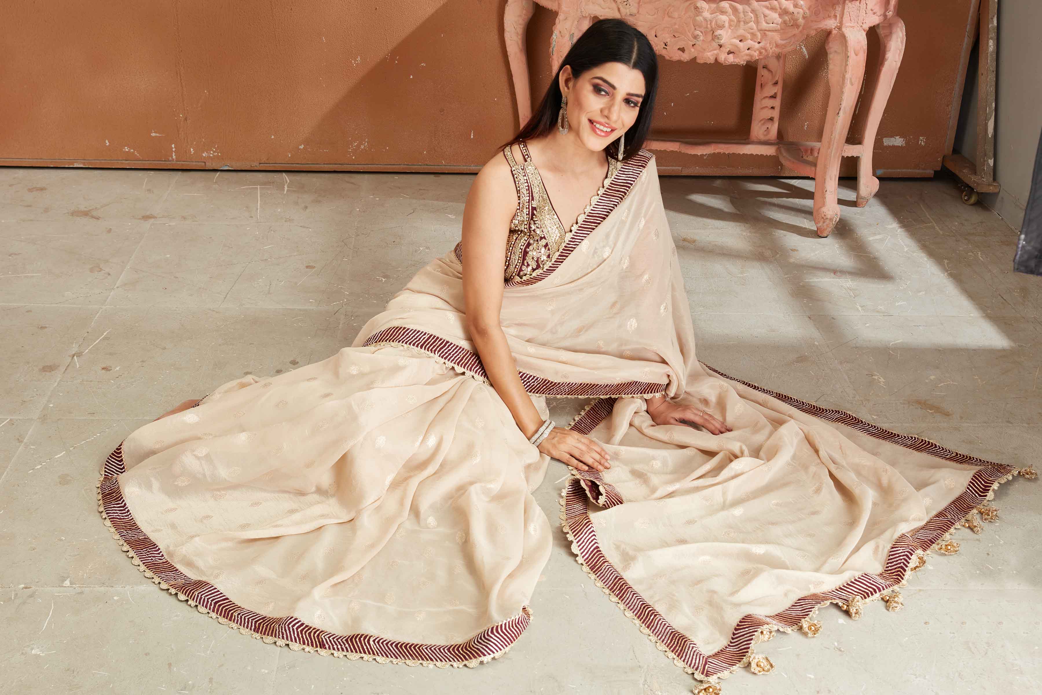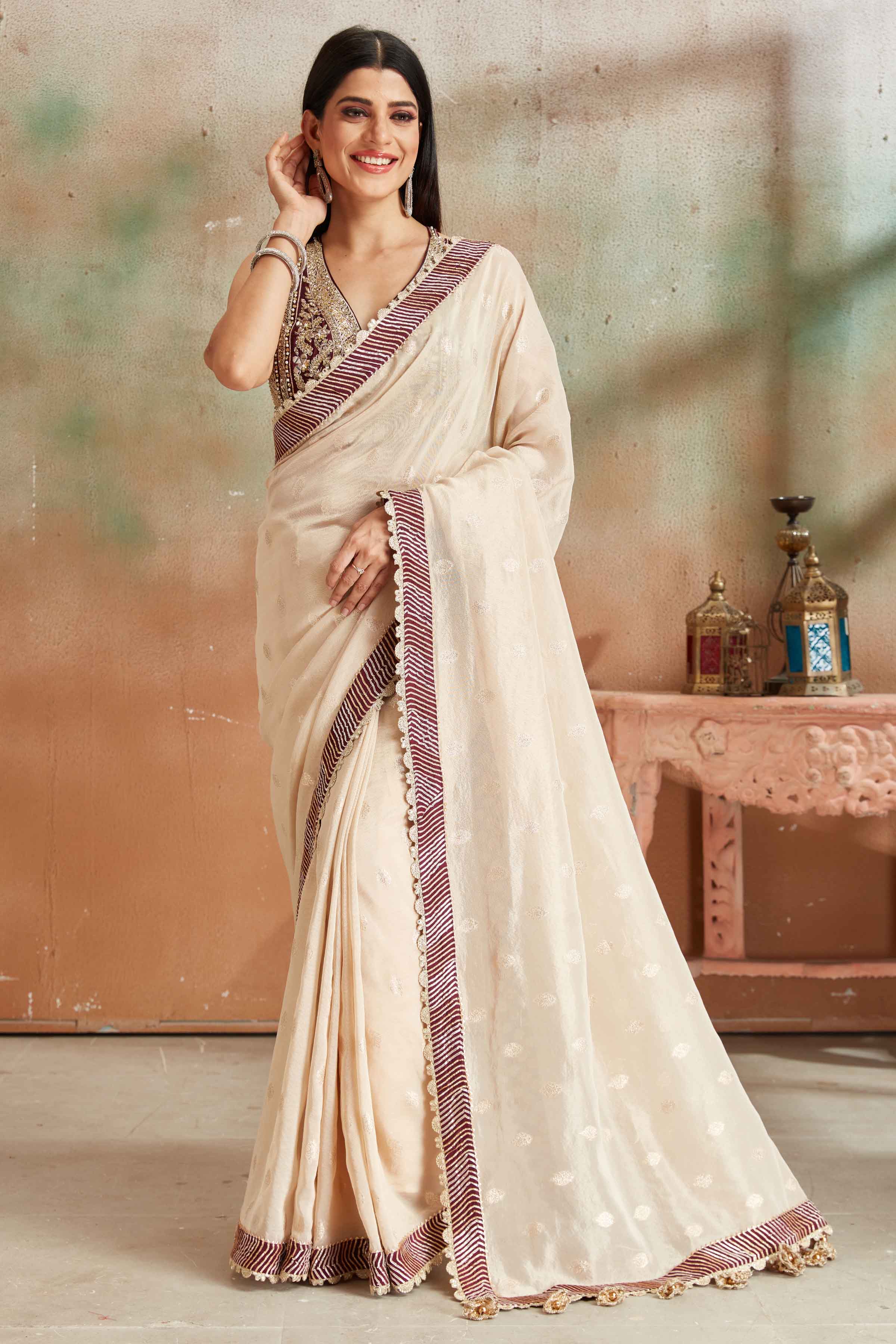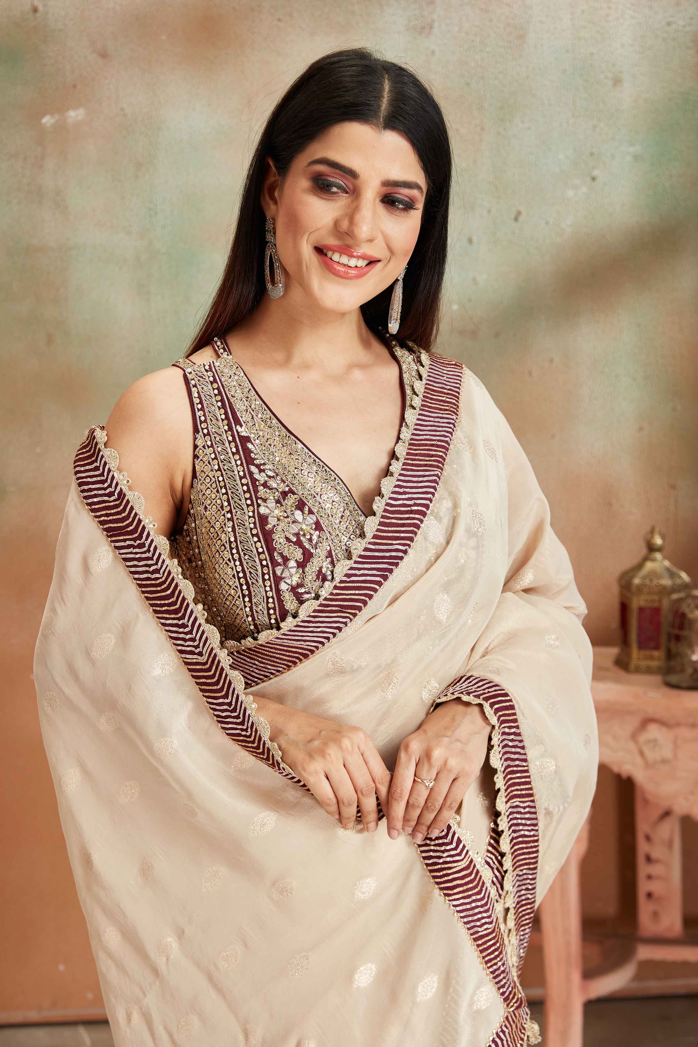 Go for a modern saree look on special occasions in this classy cream embroidered georgette saree with maroon scalloped border. The saree comes with an embroidered designer blouse.