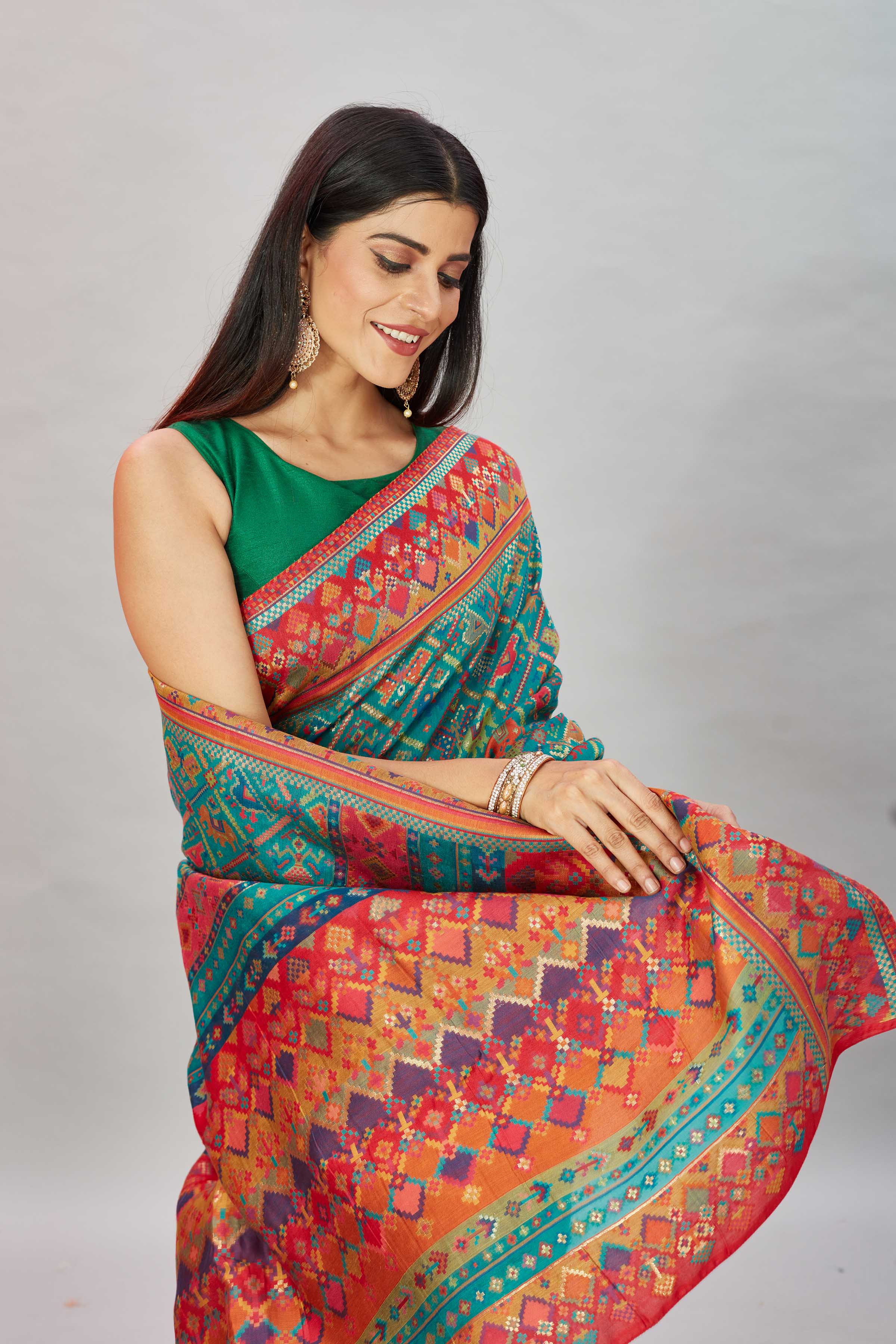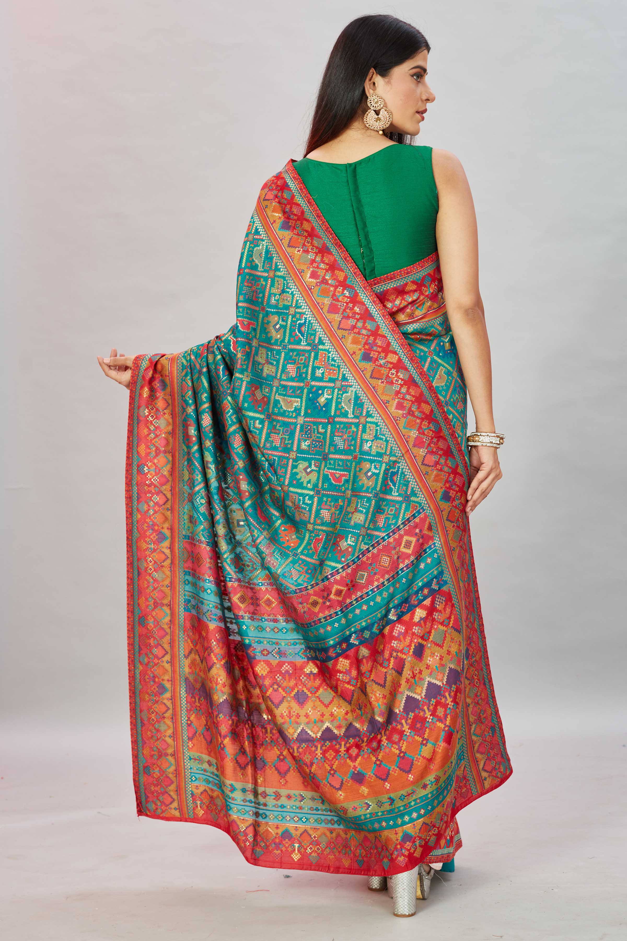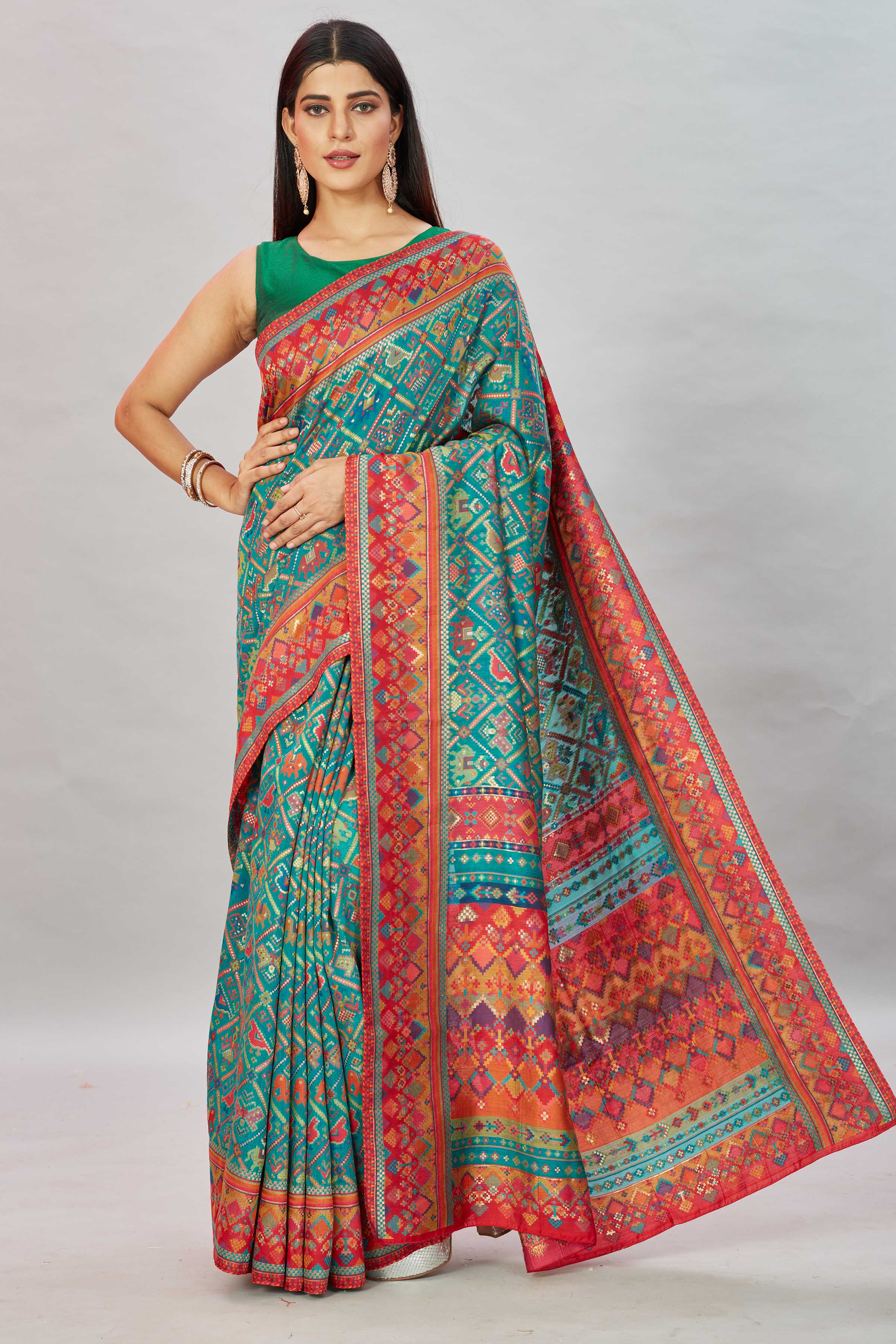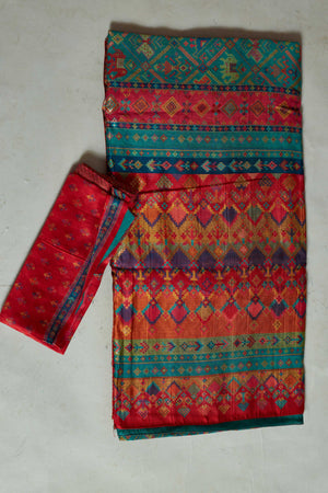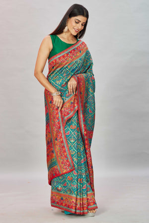 The elegance of this sea green Kani weave sari is sure to leave everyone awestruck! It has a contrasting multicolor border and multicolor pallu. It comes with a matching blouse piece.