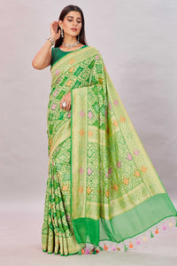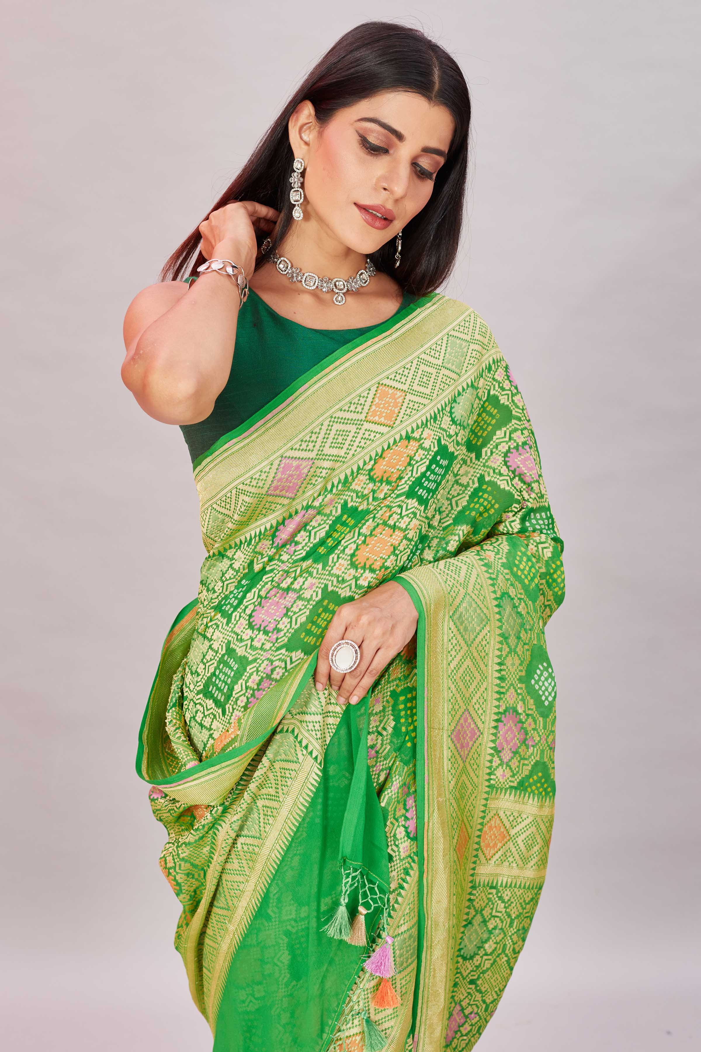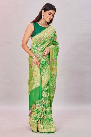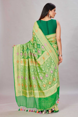 Elegant green georgette Banarasi saree is a perfect choice for festive occasions! It is enhanced with zari minakari jaal and comes with a matching blouse piece.