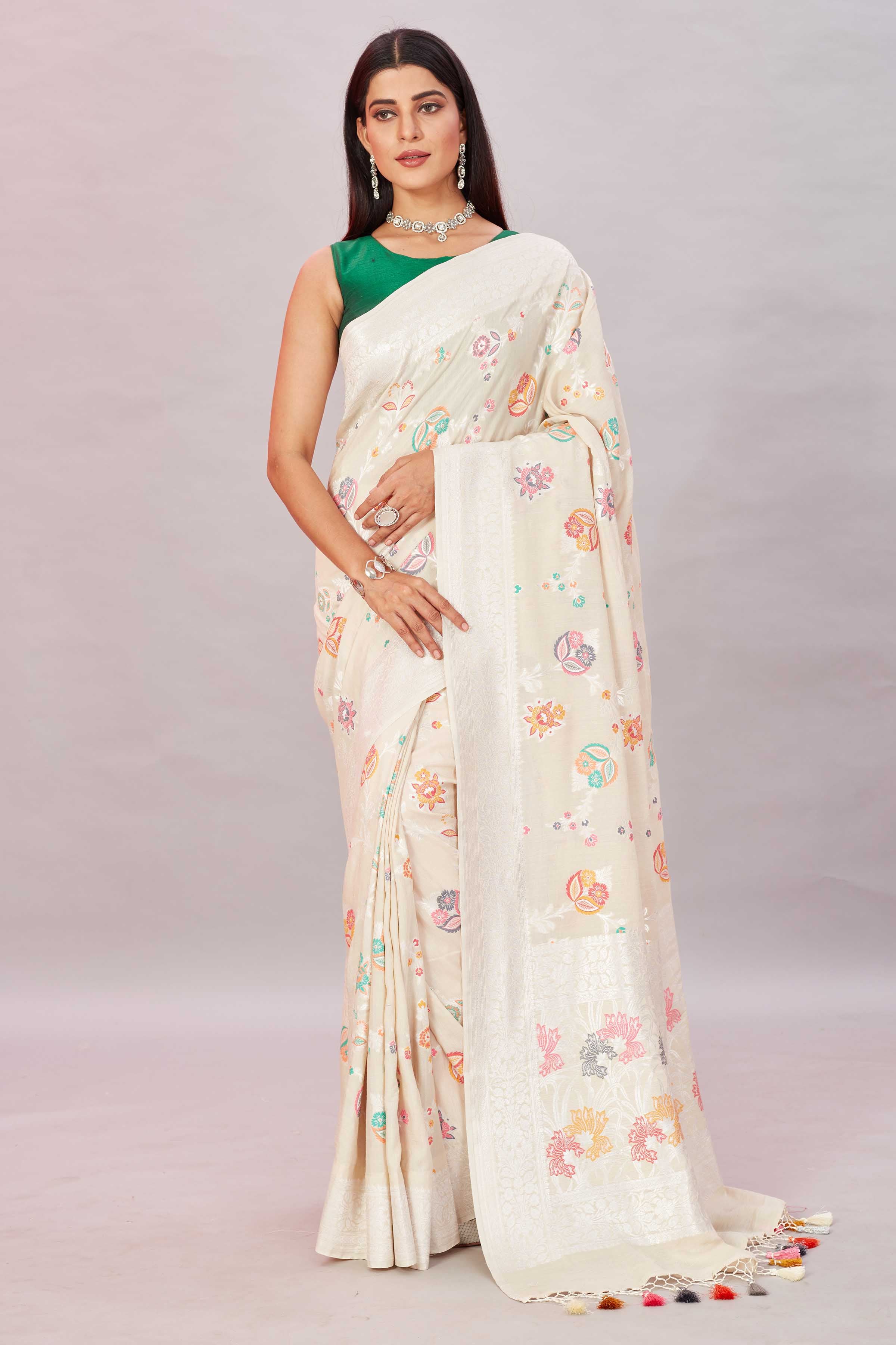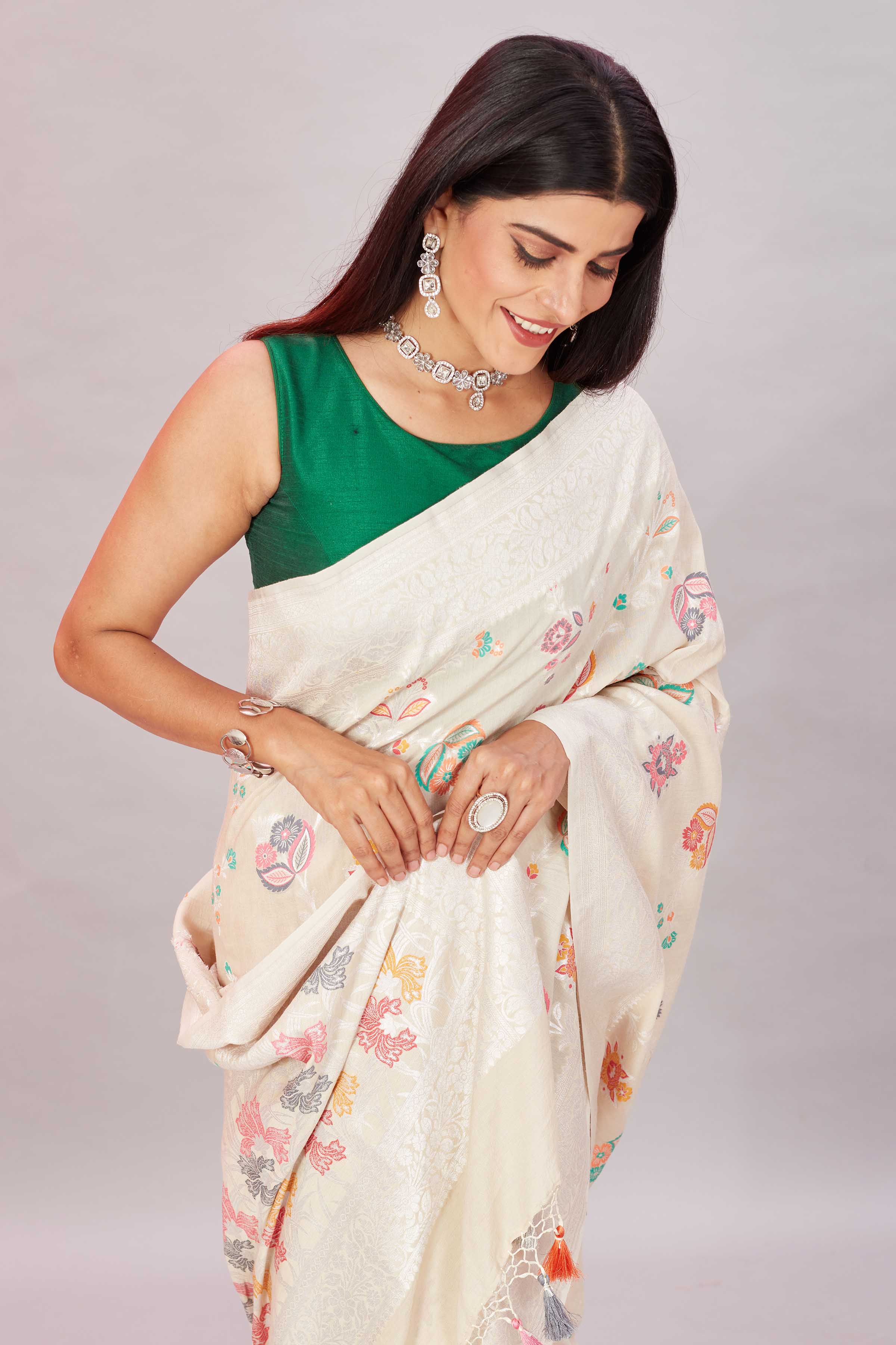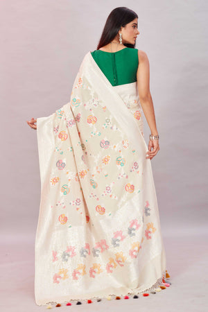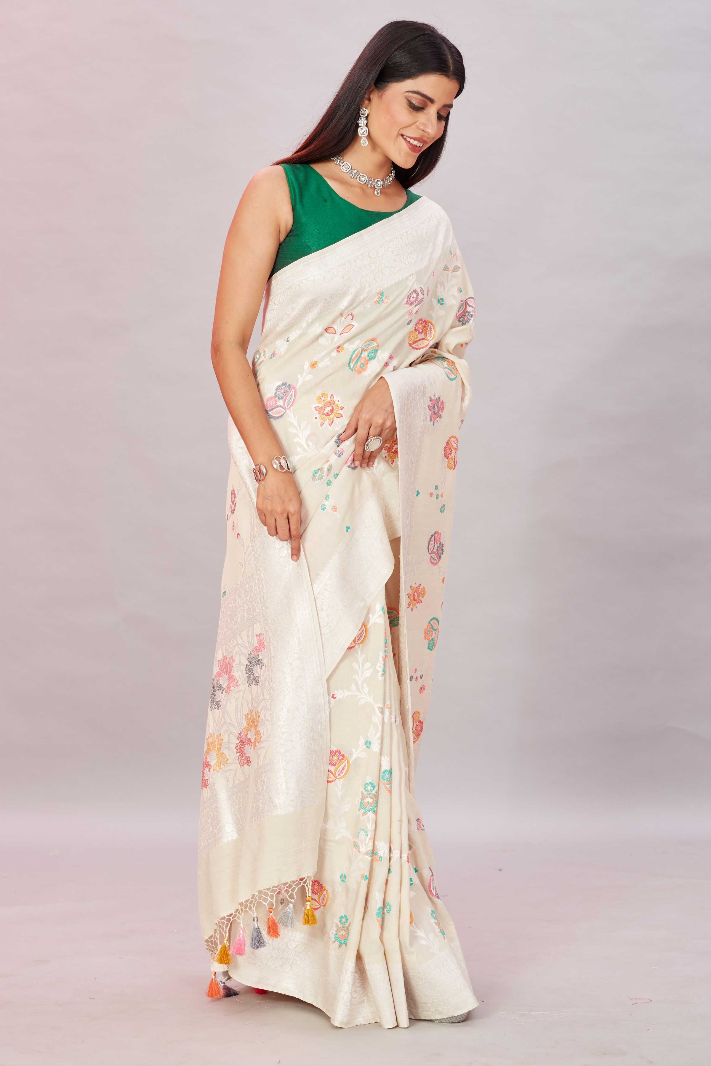 Elegant cream tussar Banarasi saree is a perfect choice for festive occasions! It is enhanced with zari minakari floral jaal. It comes with a matching blouse piece.