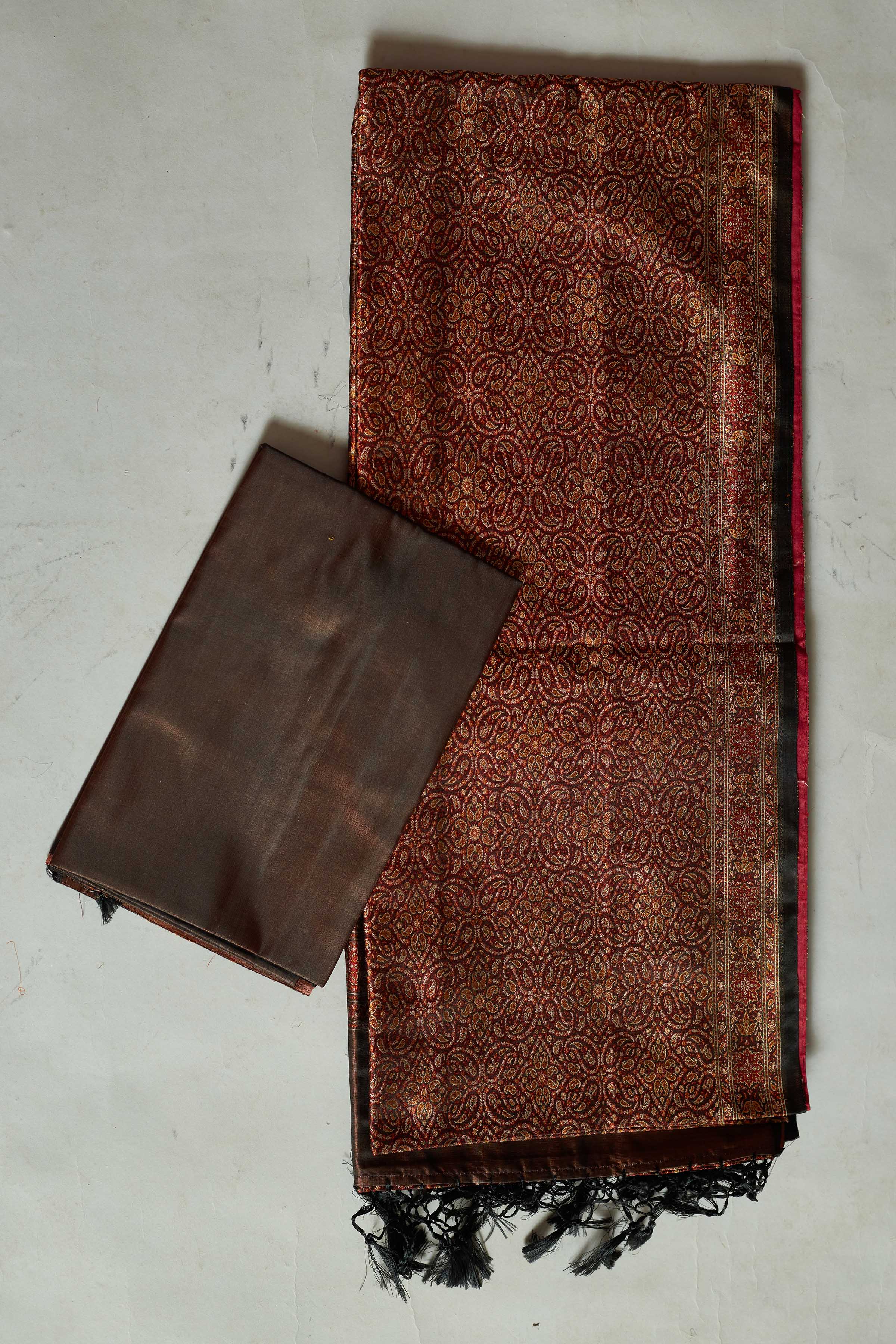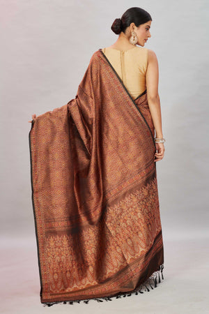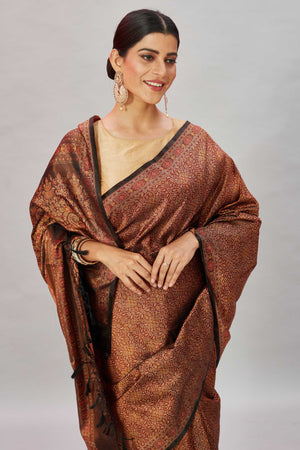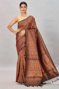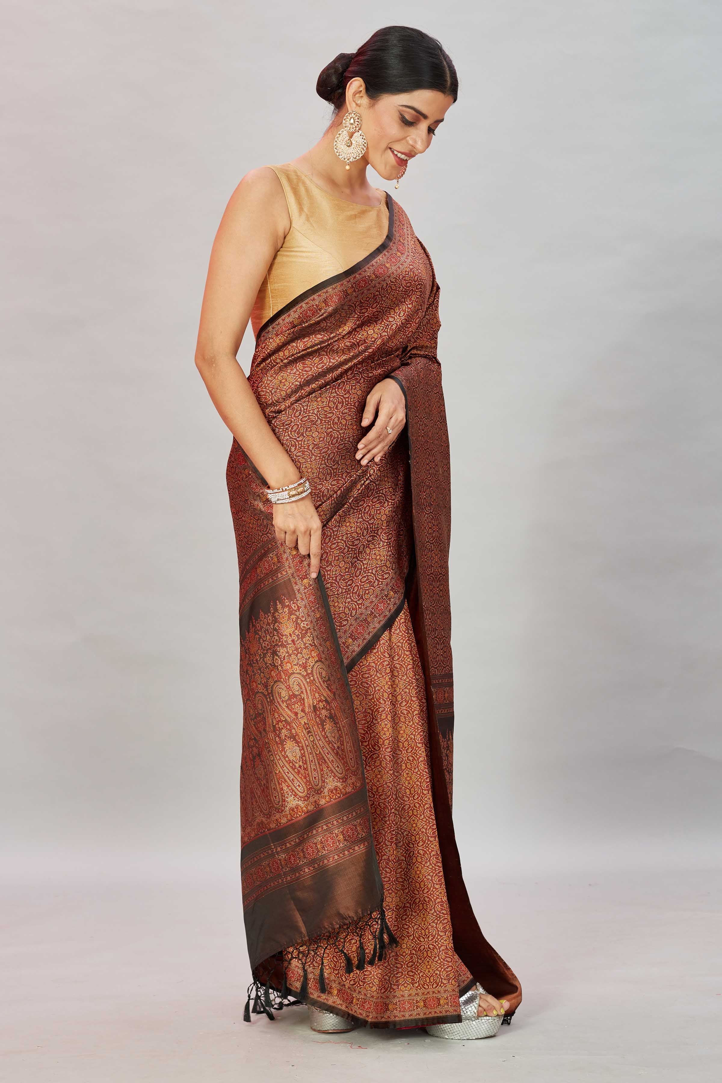 Look your ethnic best at weddings and special occasions in this brown Tanchoi Banarasi silk saree. It comes with a matching blouse piece.