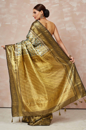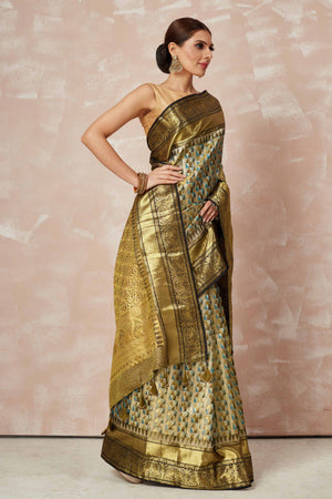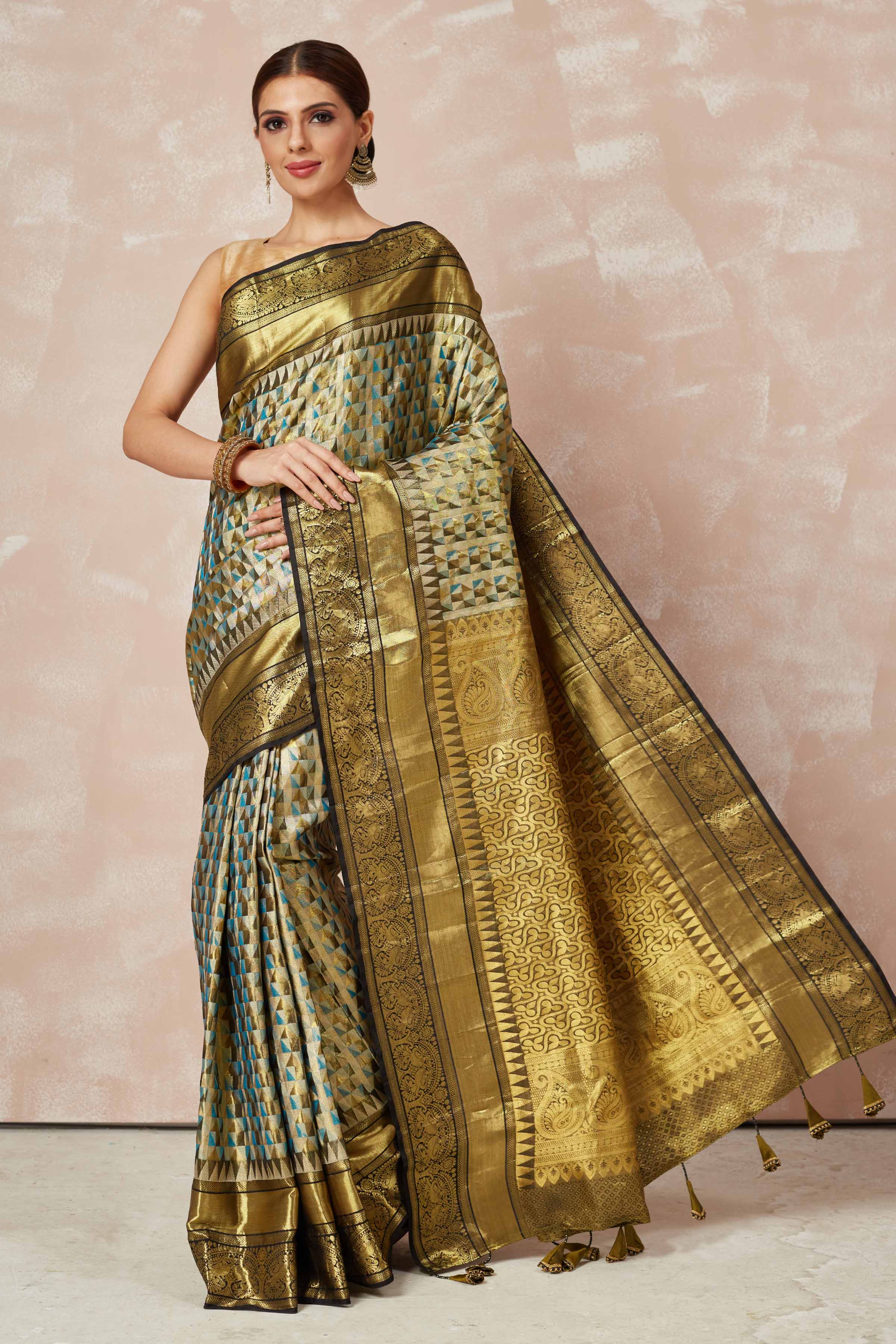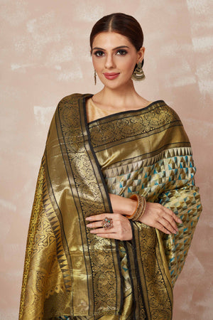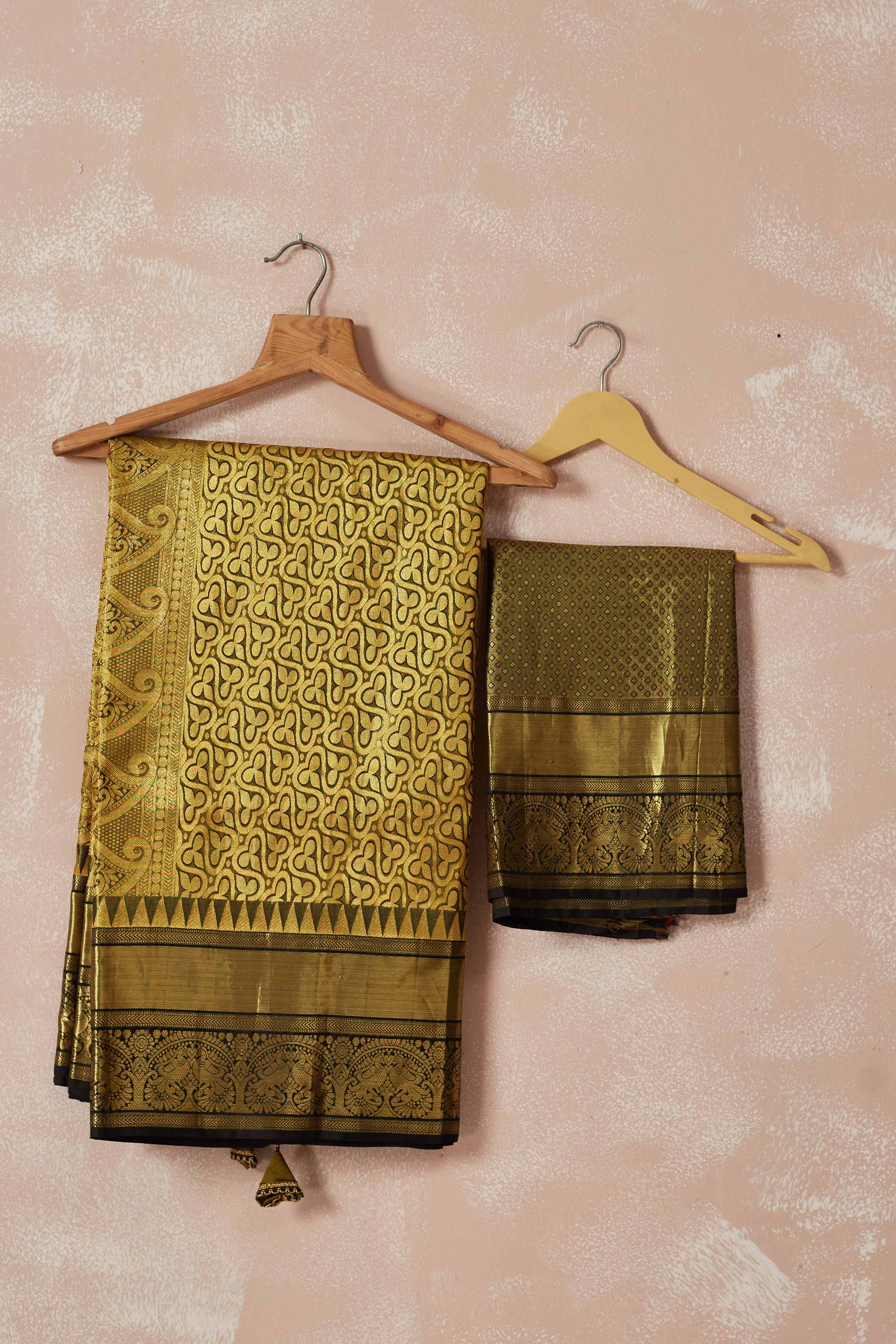 Elegant golden brocade Kanchipuram sari is a perfect choice for festive occasions! It is enhanced with a heavy zari border and pallu. It comes with a matching blouse piece.