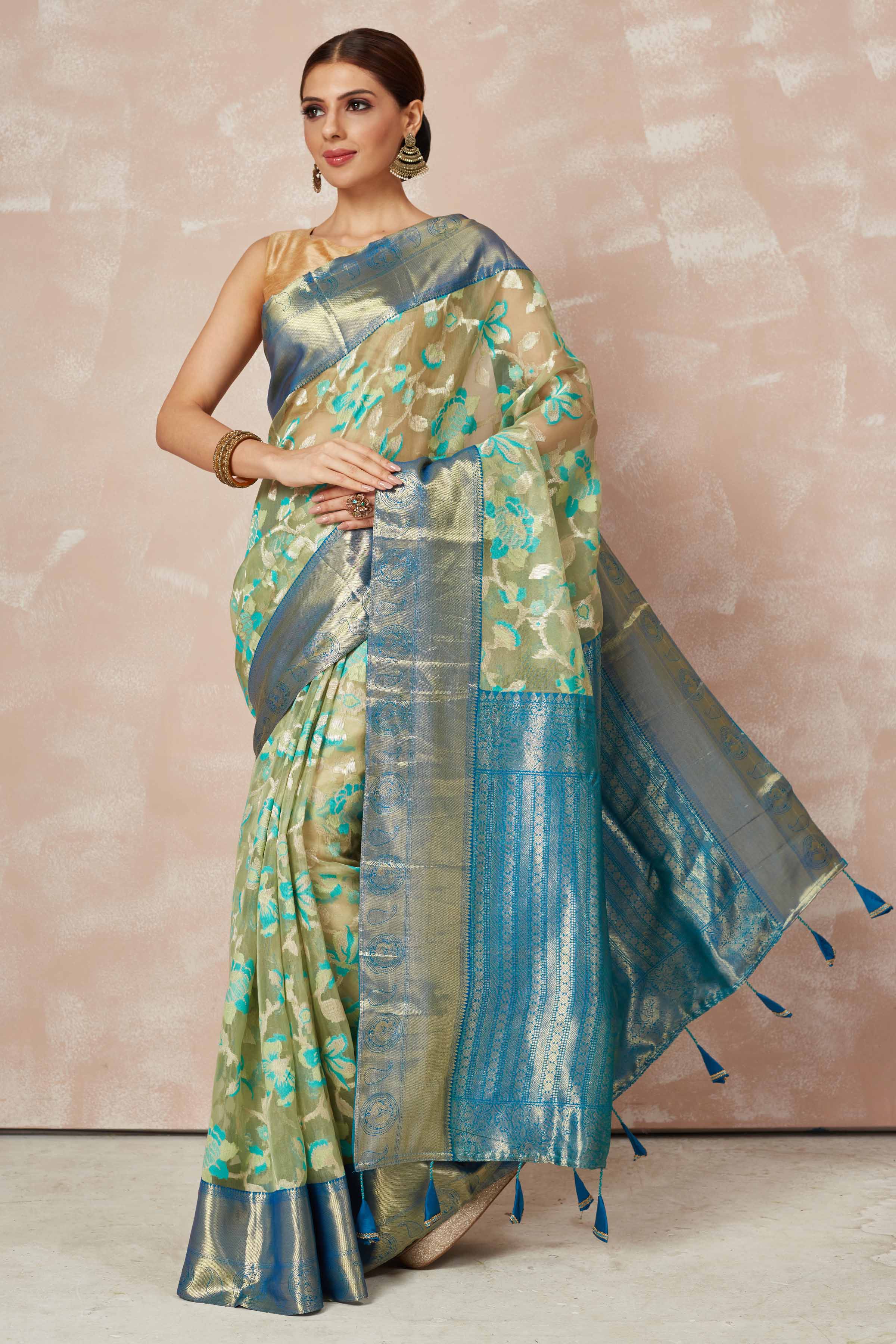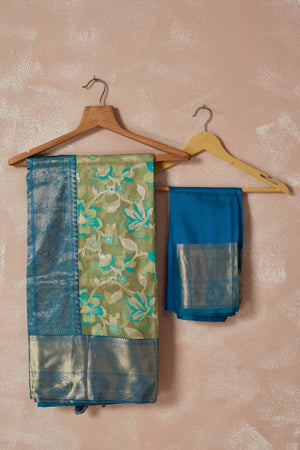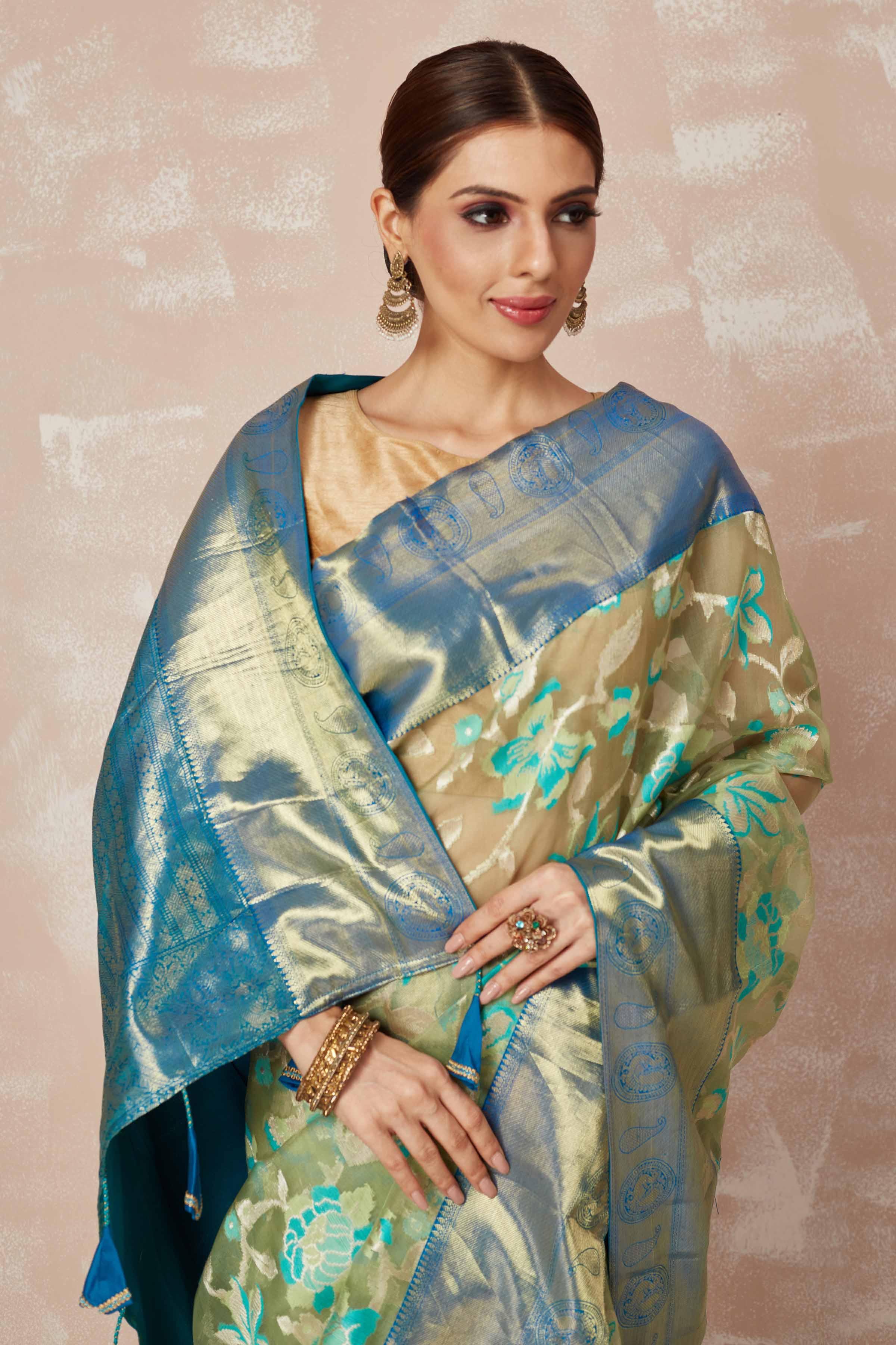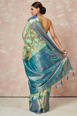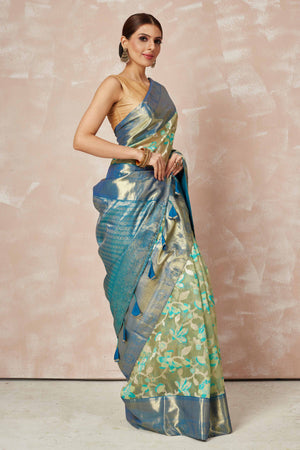 Elegant beige brocade Kanchipuram sari is a perfect choice for festive occasions! It is enhanced with blue zari border and pallu. It comes with a matching blouse piece.