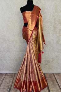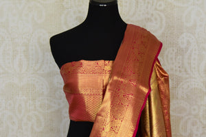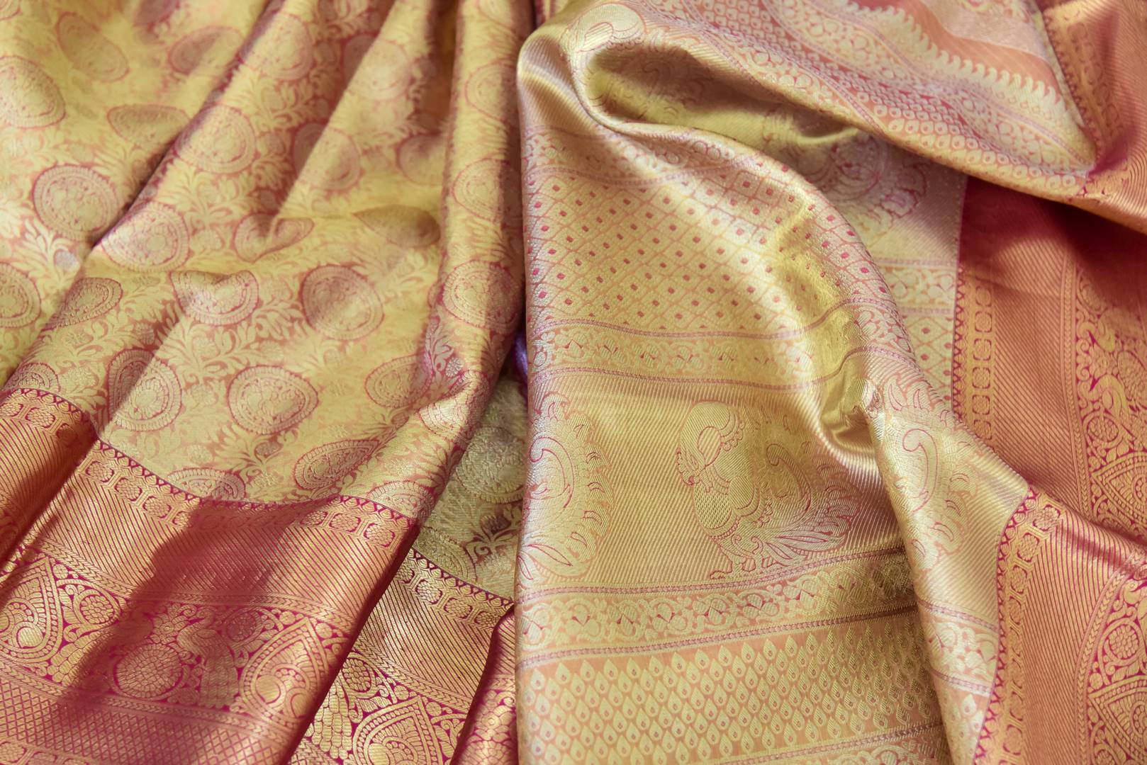 92A542 Golden Pink Kanjeevaram Saree With Pink Zari Border