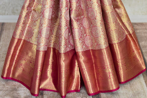 Elegant golden pink Kanjivaram silk sari is a perfect choice for weddings and festive occasions! It is enhanced with pink zari border and comes with a matching blouse piece.