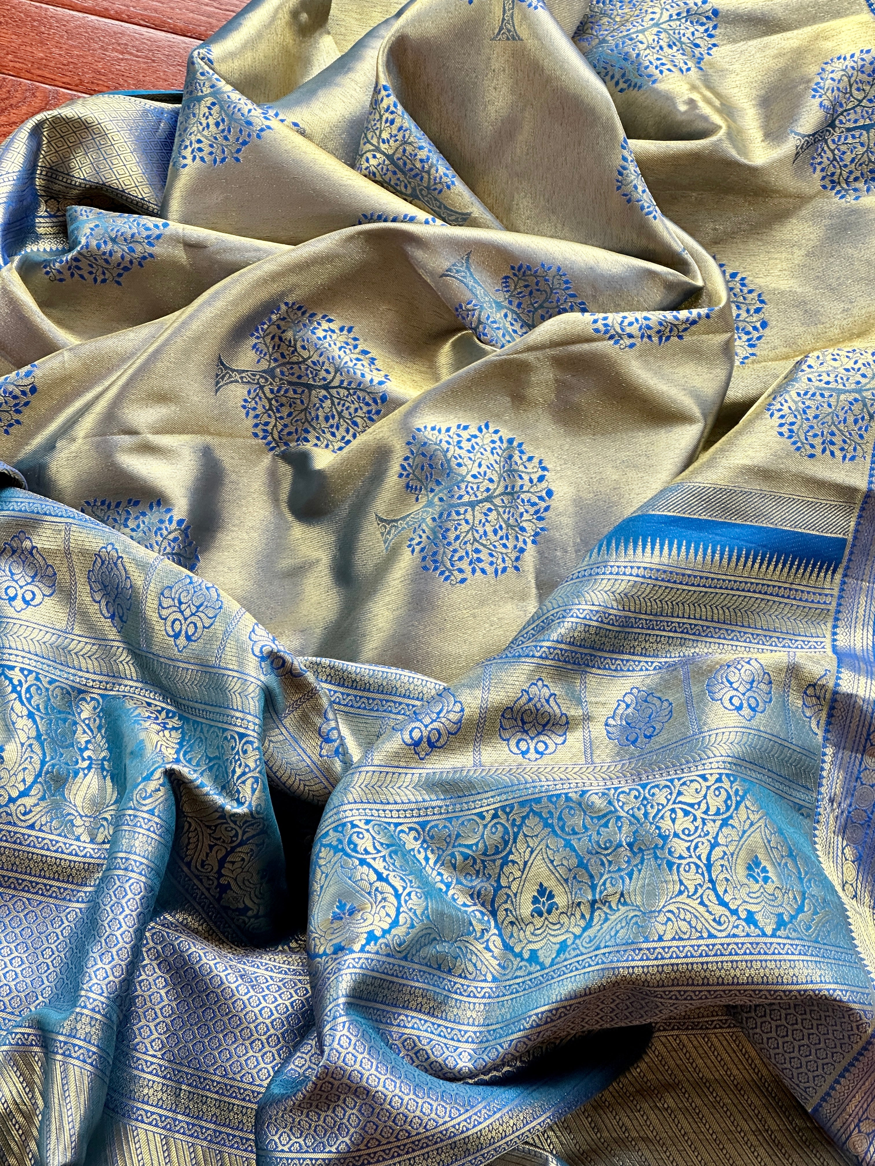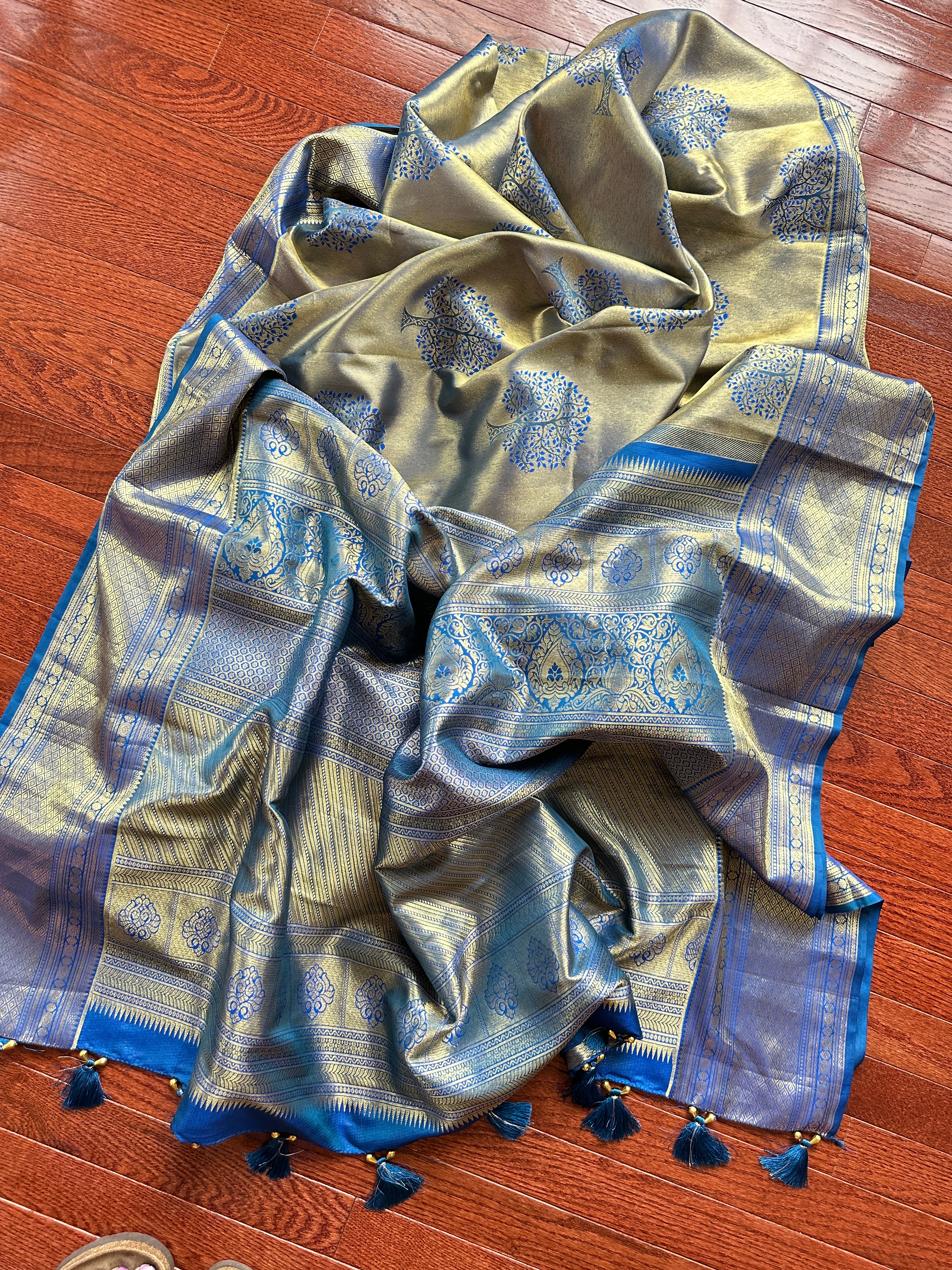 92A556 Golden Zari Blue Kanjivaram Saree With Tree Motifs