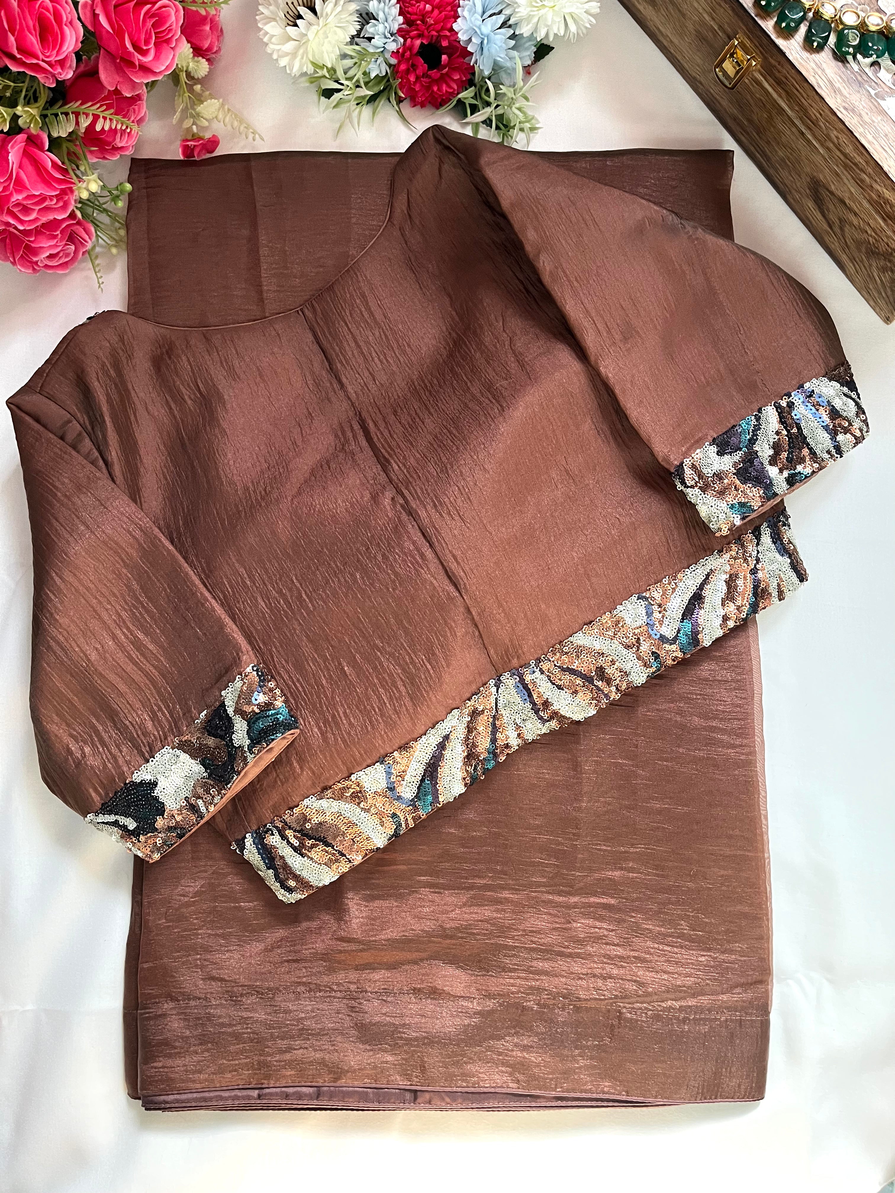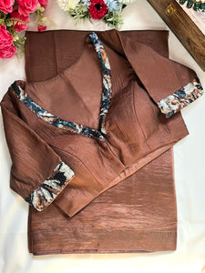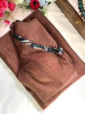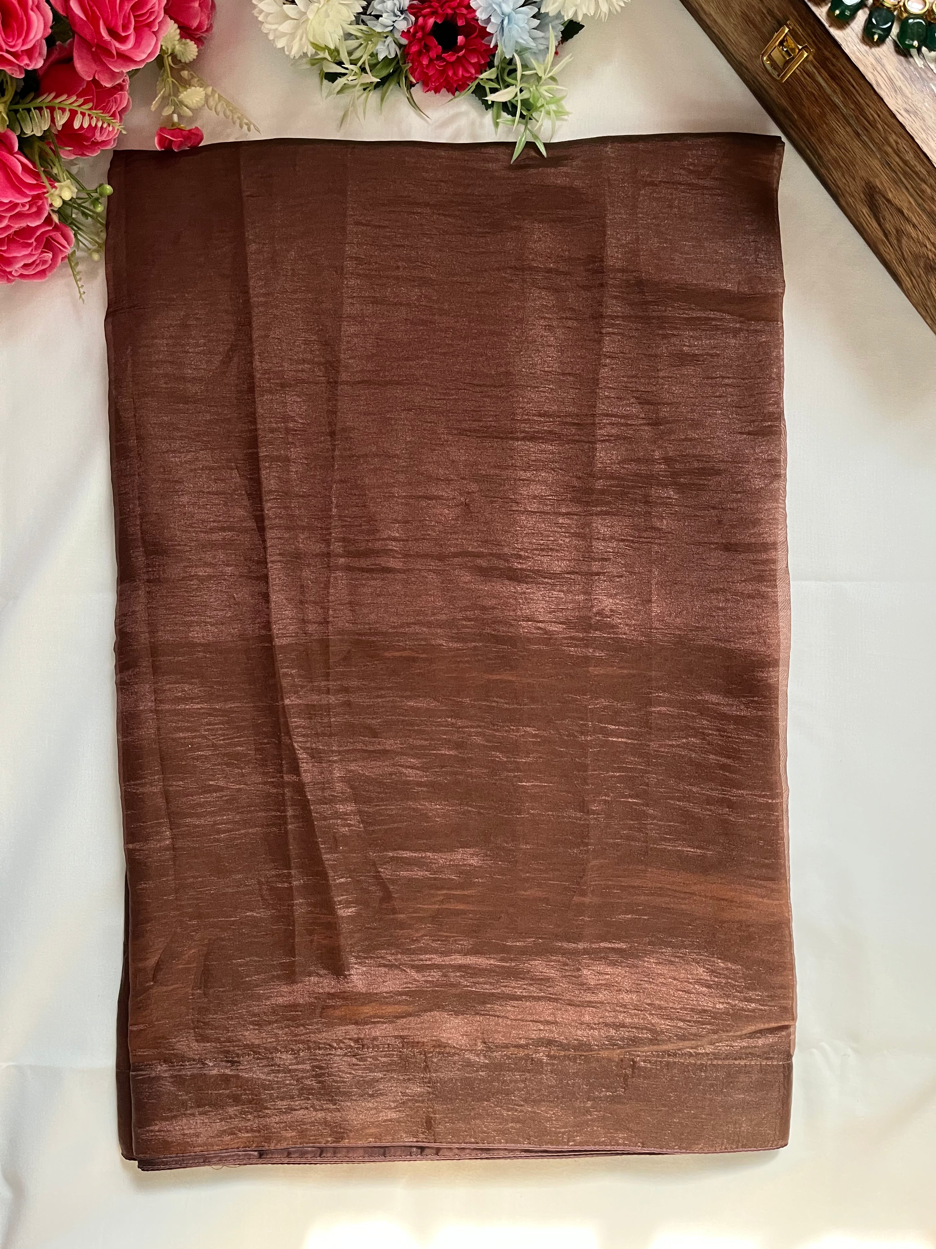 Be occasion ready in this beautiful solid brown tissue saree! It comes with an embroidered saree blouse.