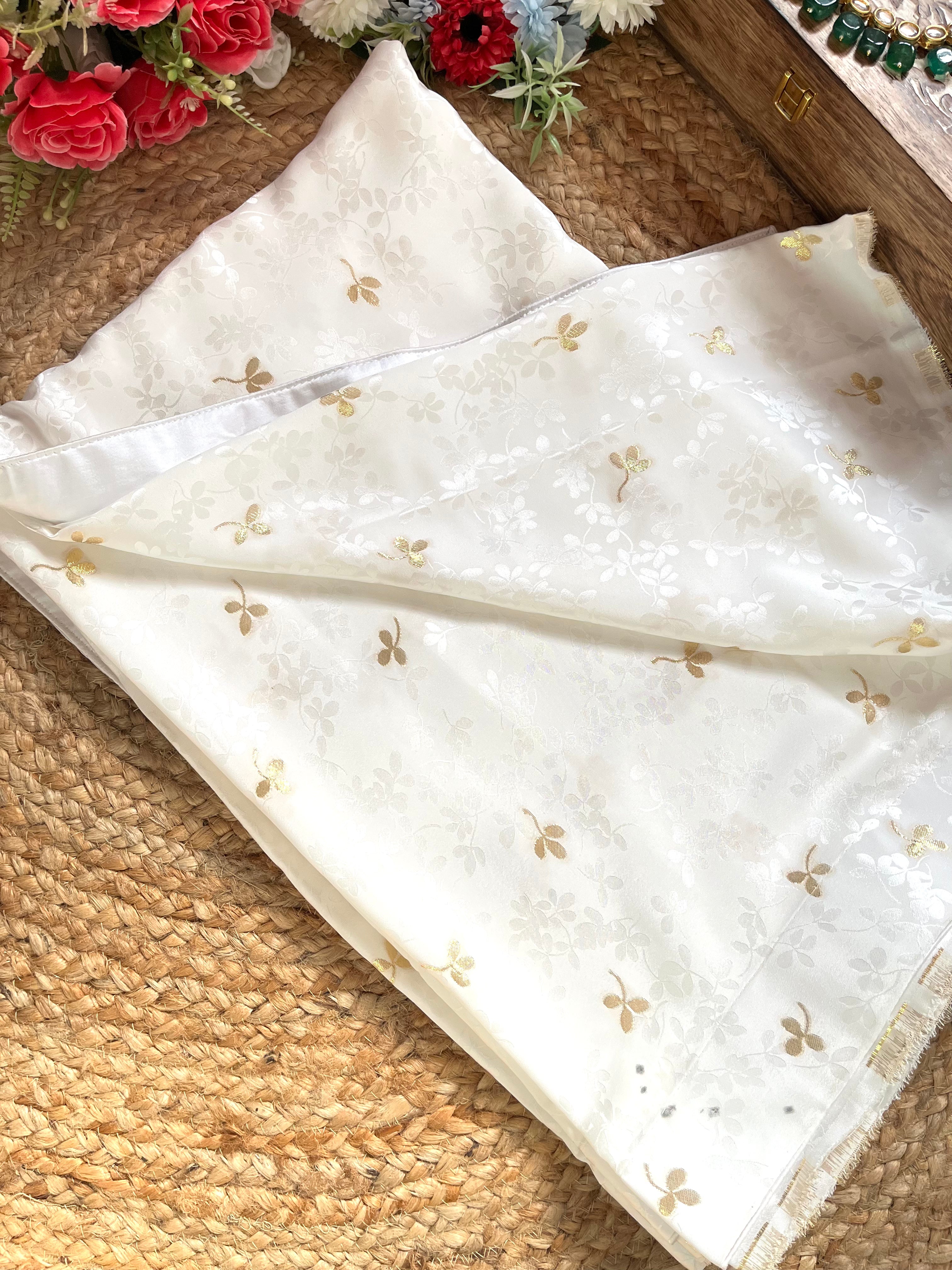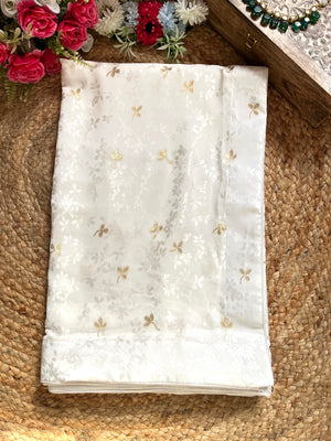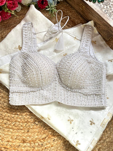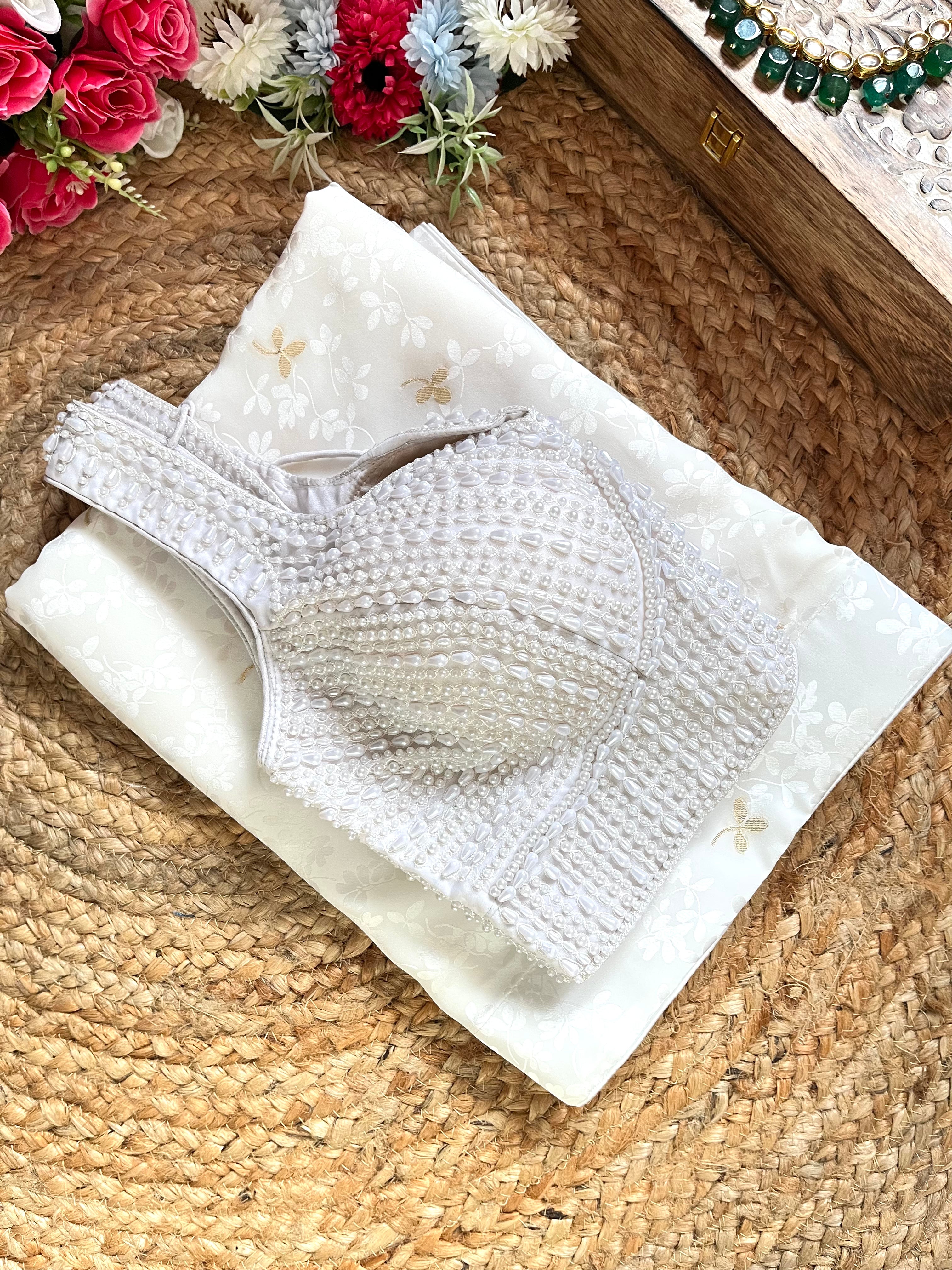 Be occasion ready in this beautiful white georgette crepe saree! It comes with a bead work sleeveless blouse.