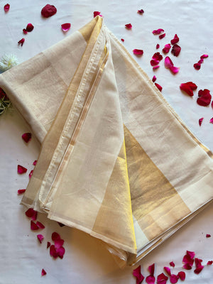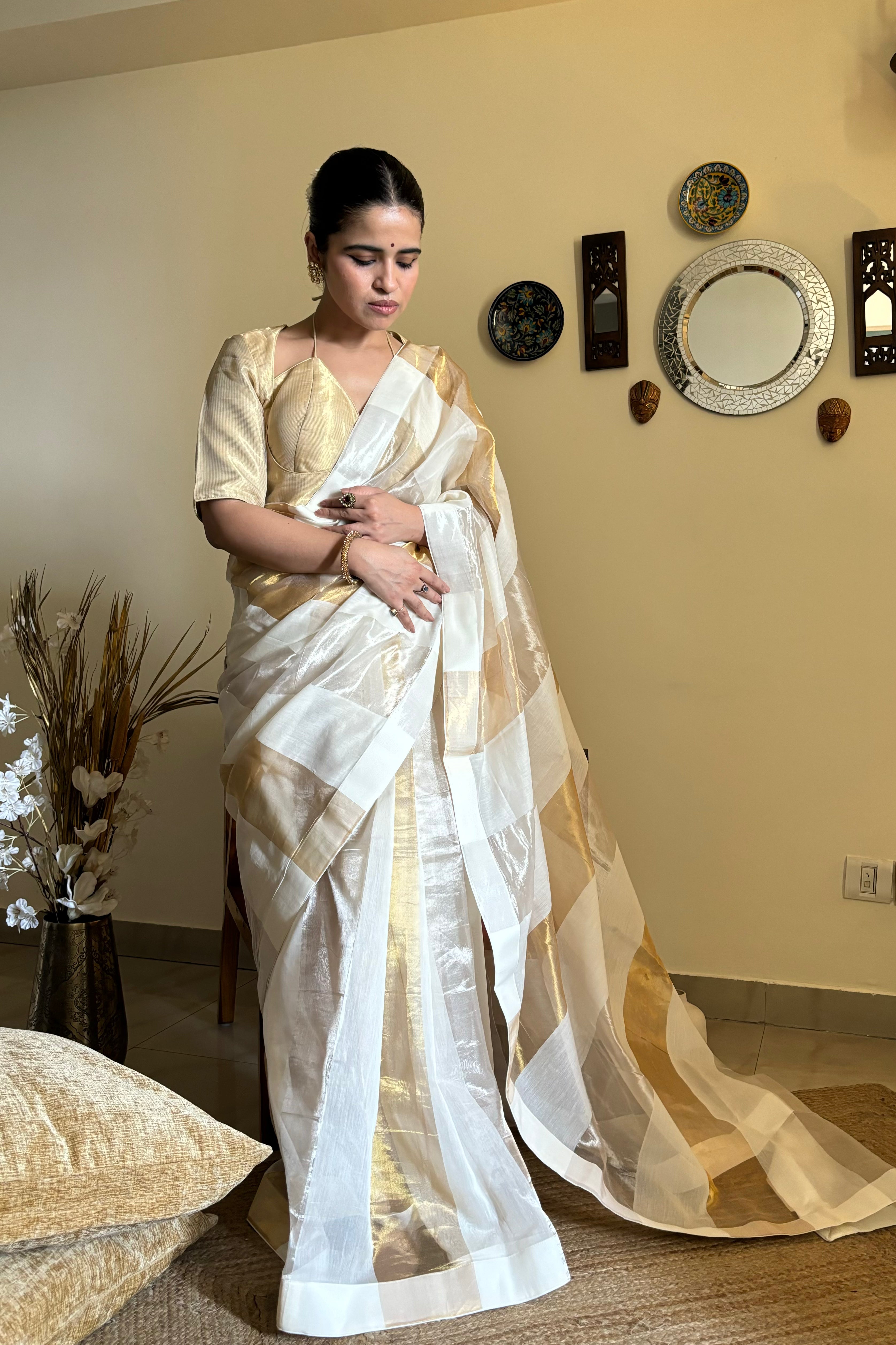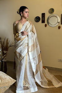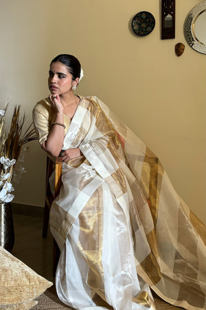 Be festive ready in this beautiful cream and golden chanderi saree! It comes with a golden designer blouse.