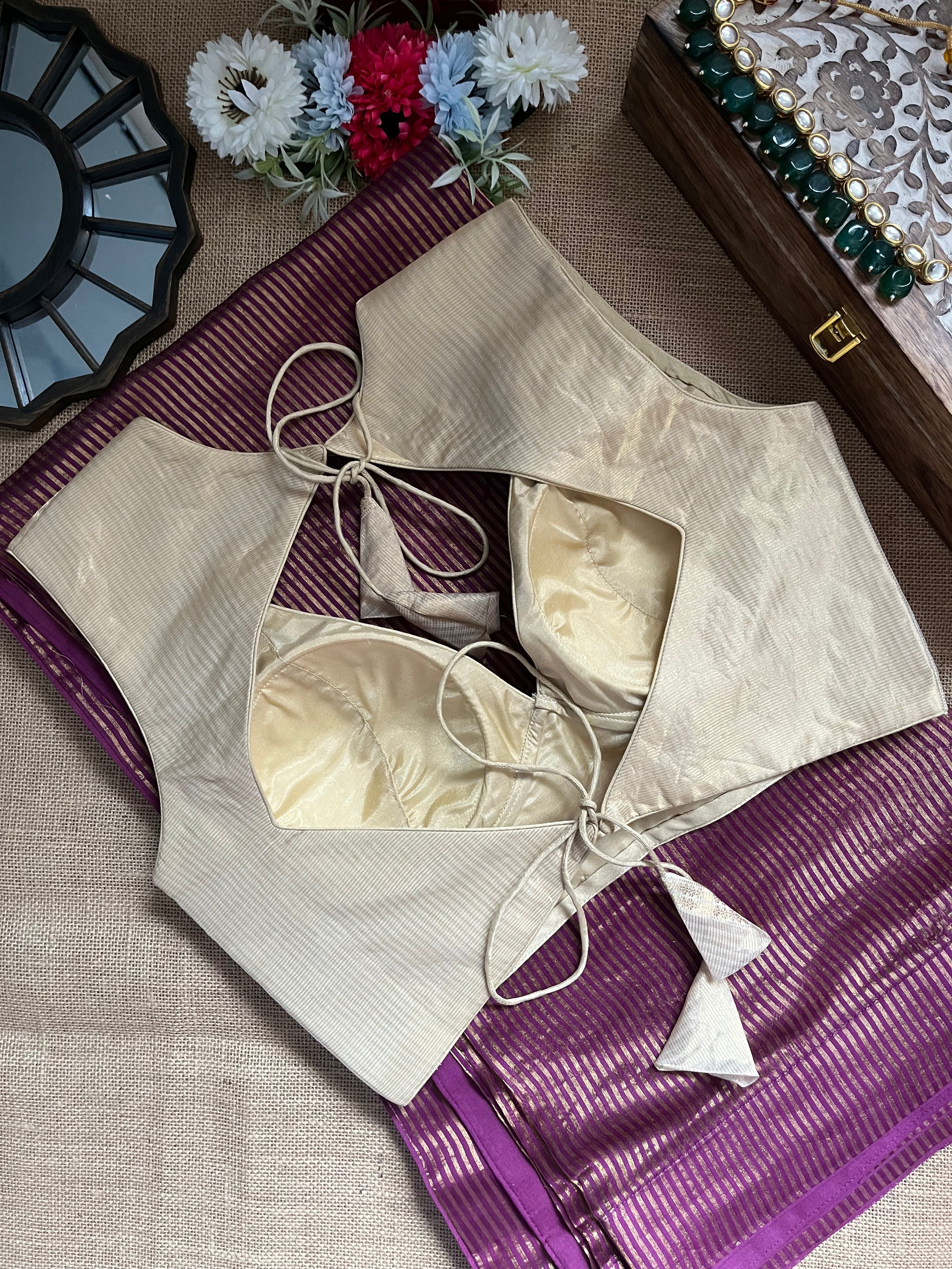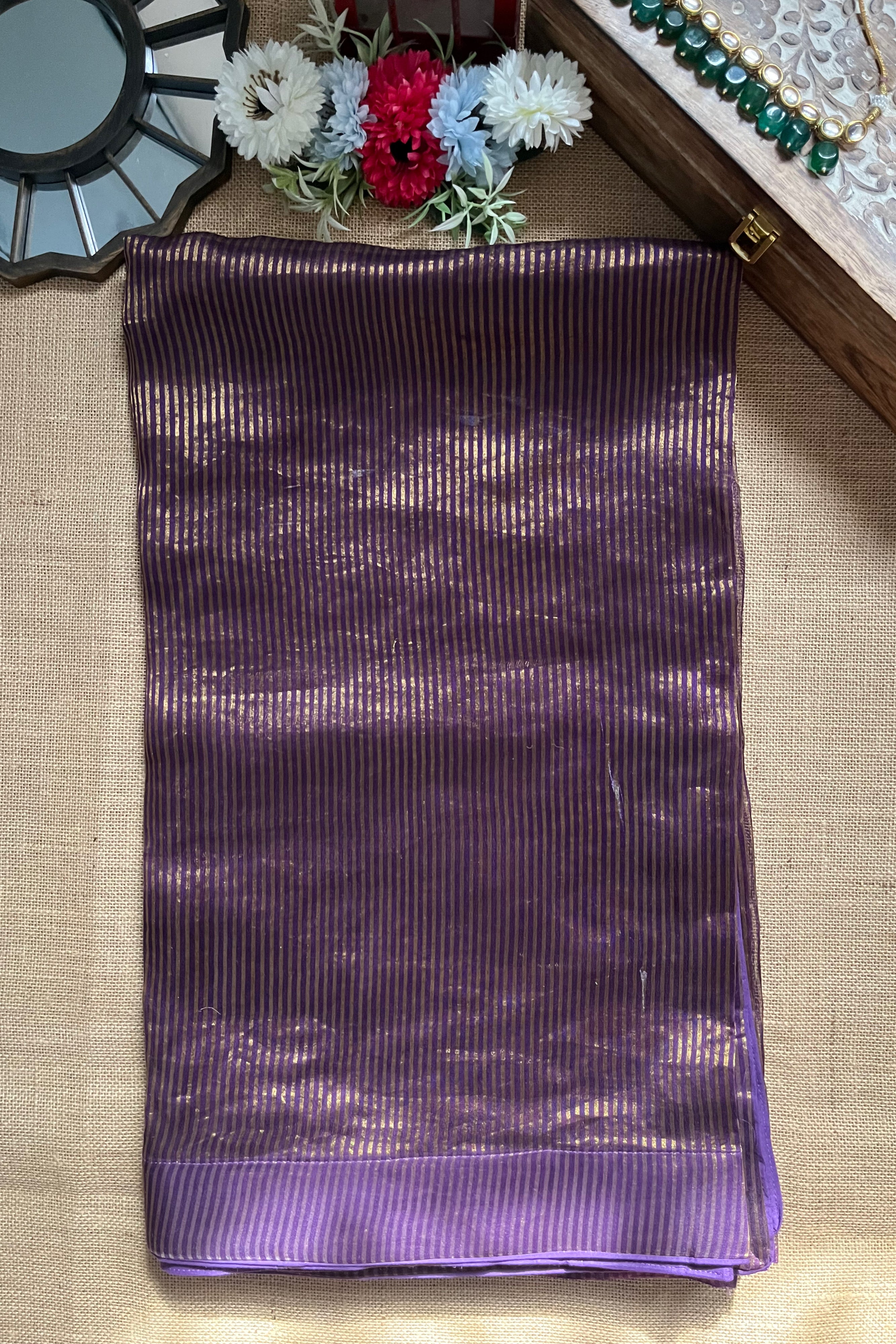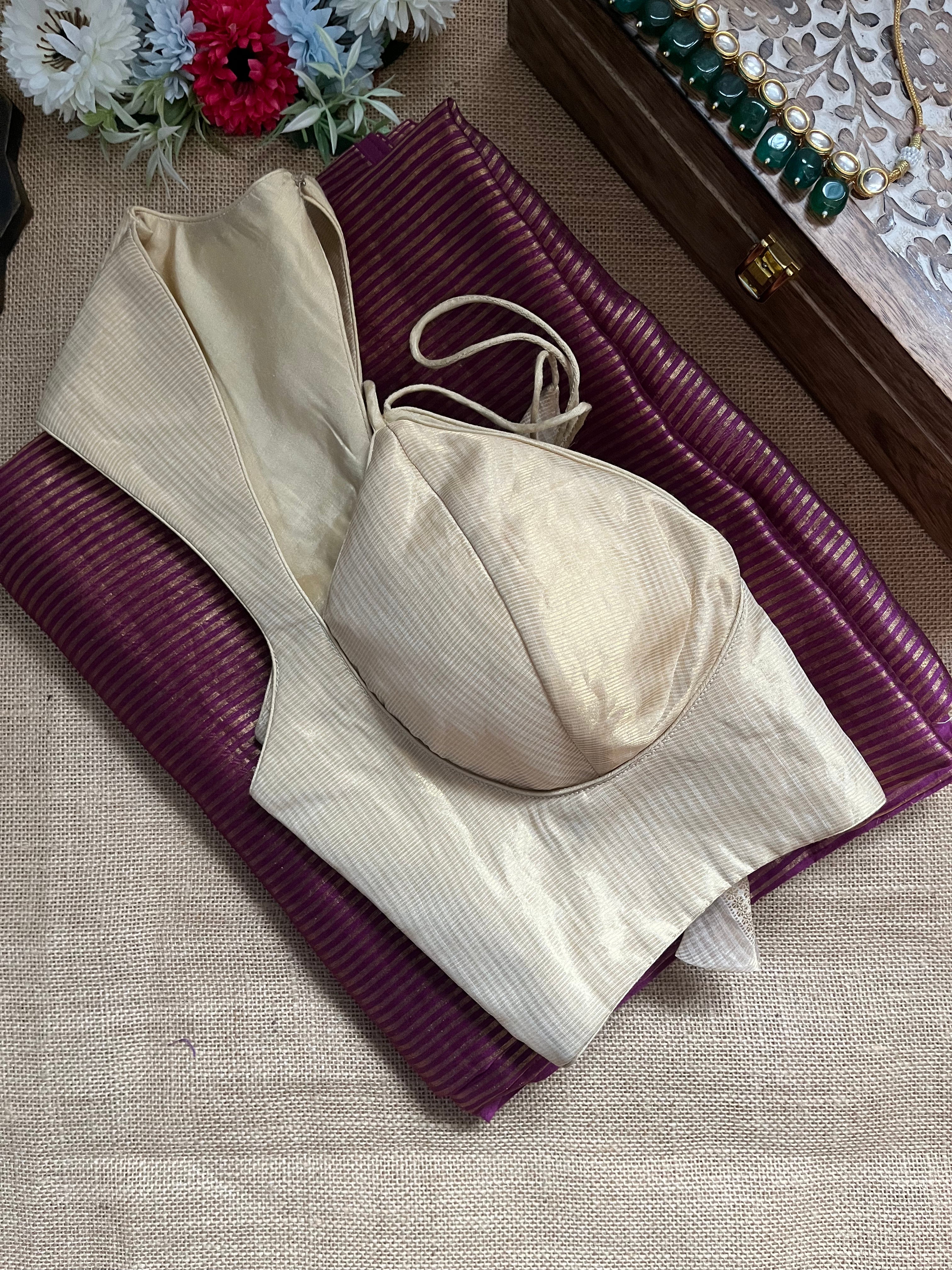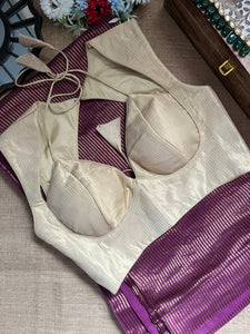 Be festive ready in this beautiful purple tissue zari saree! It comes with a cream designer blouse.