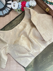 Be festive ready in this beautiful green tissue zari saree! It comes with a cream tissue blouse.