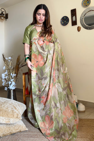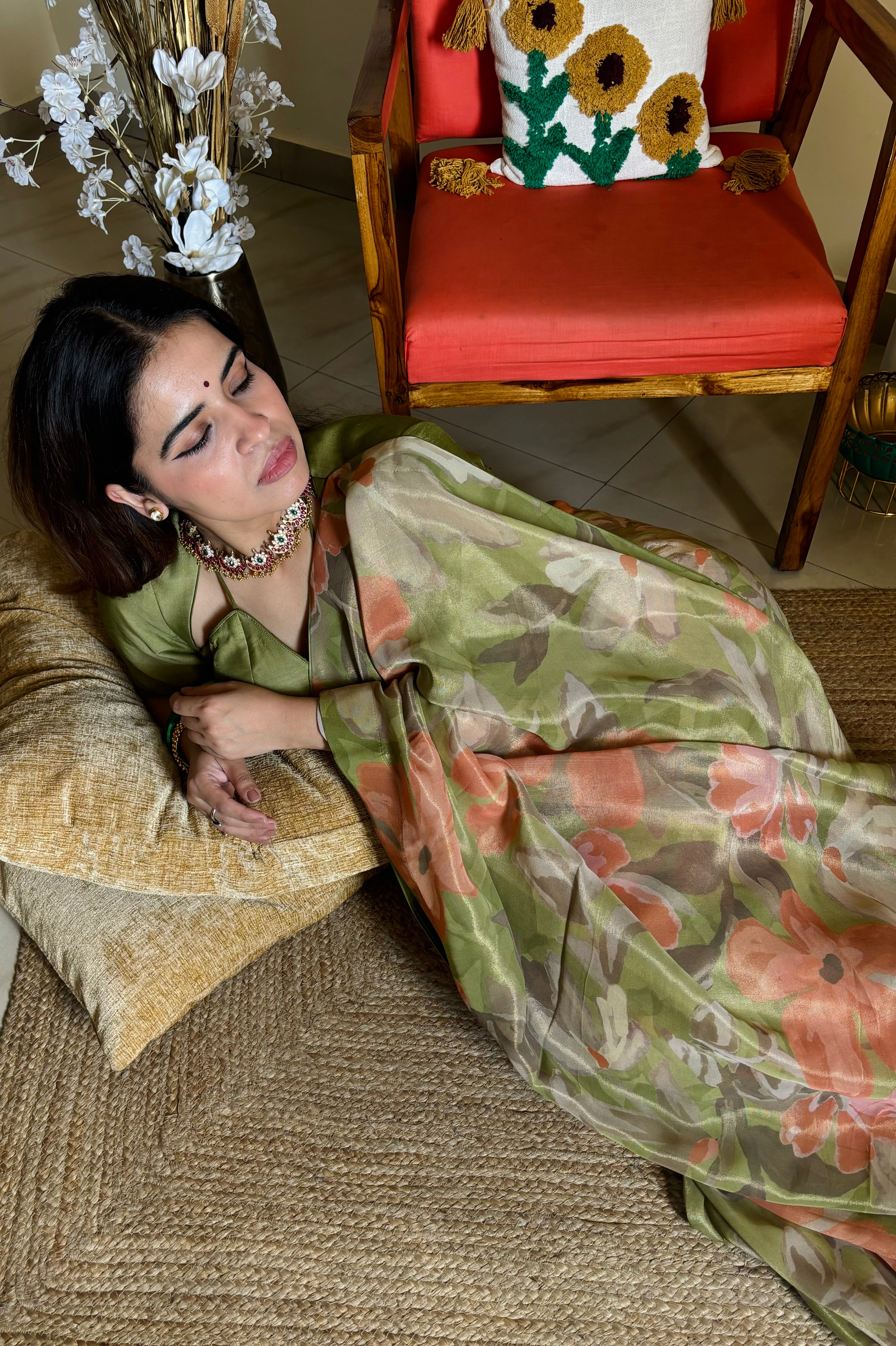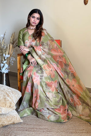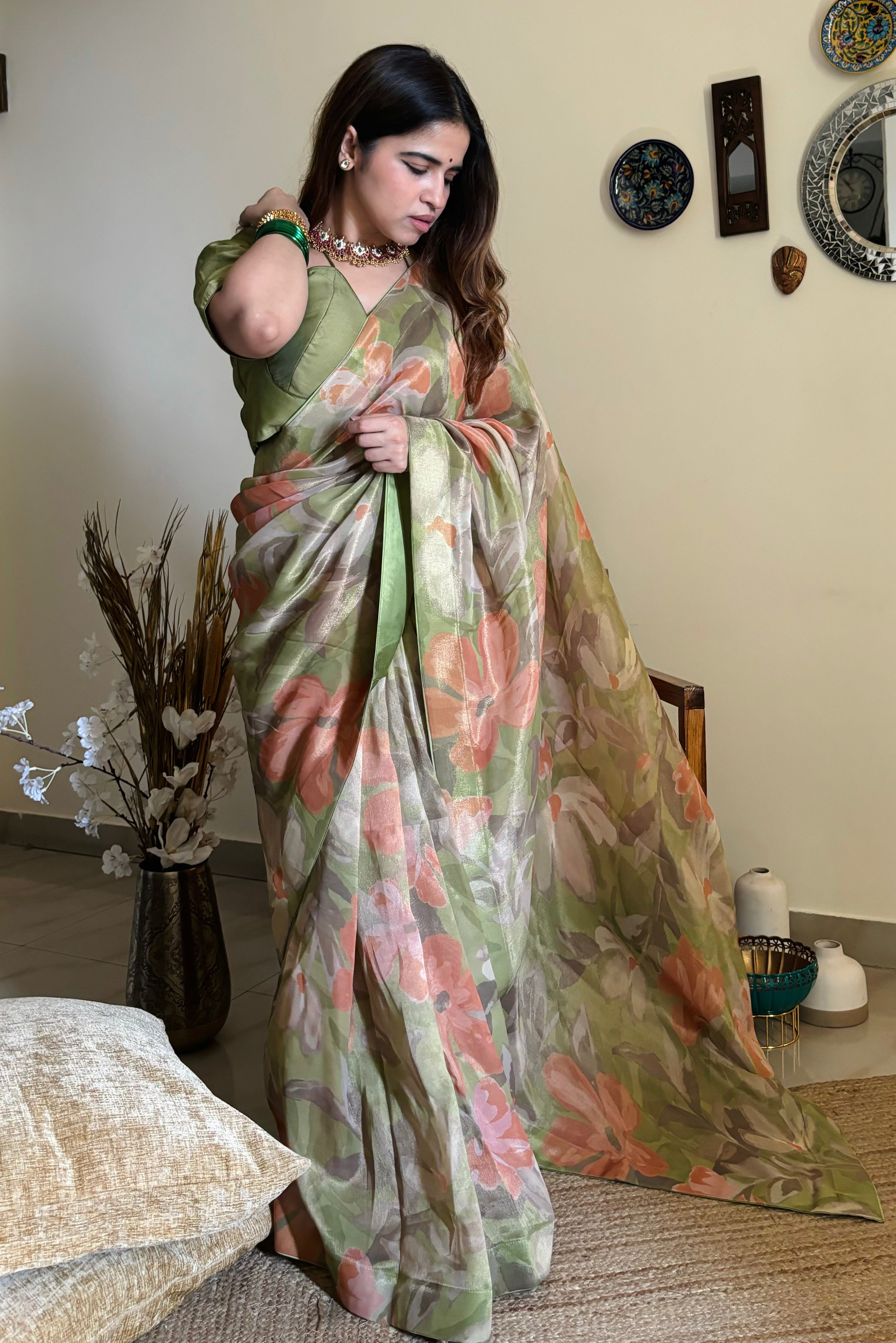 Be festive ready in this beautiful green floral shimmer georgette saree! It comes with a designer saree blouse.