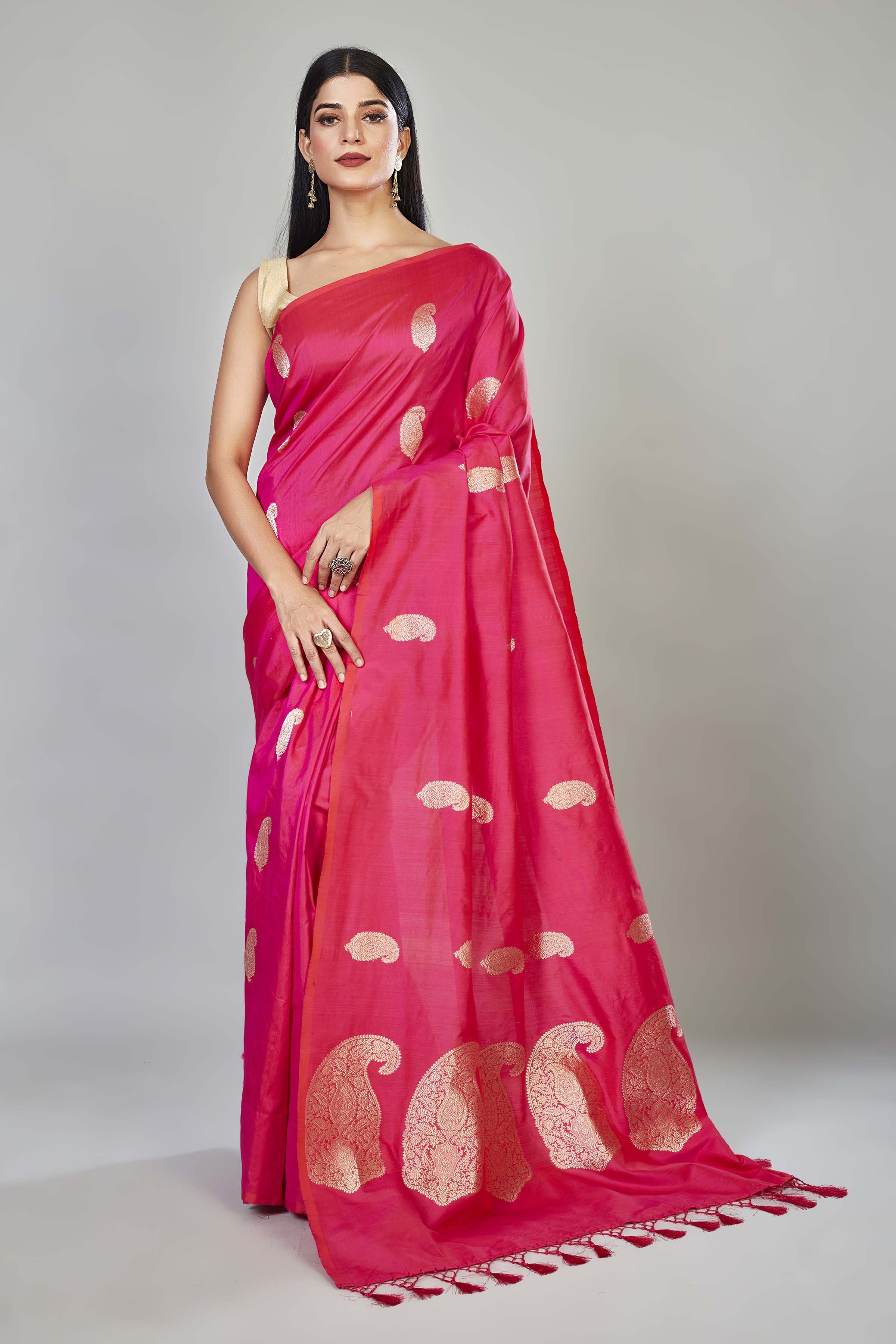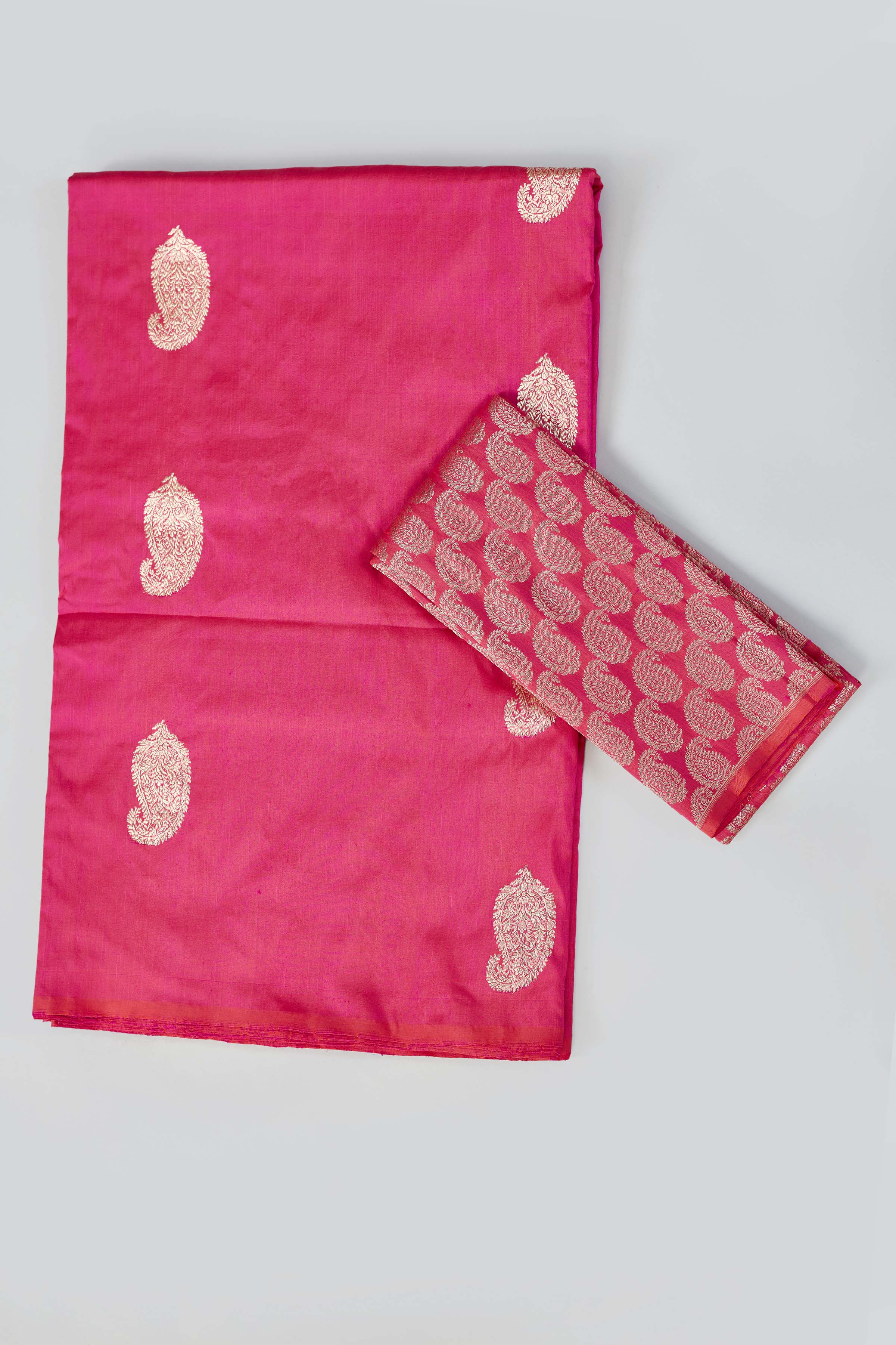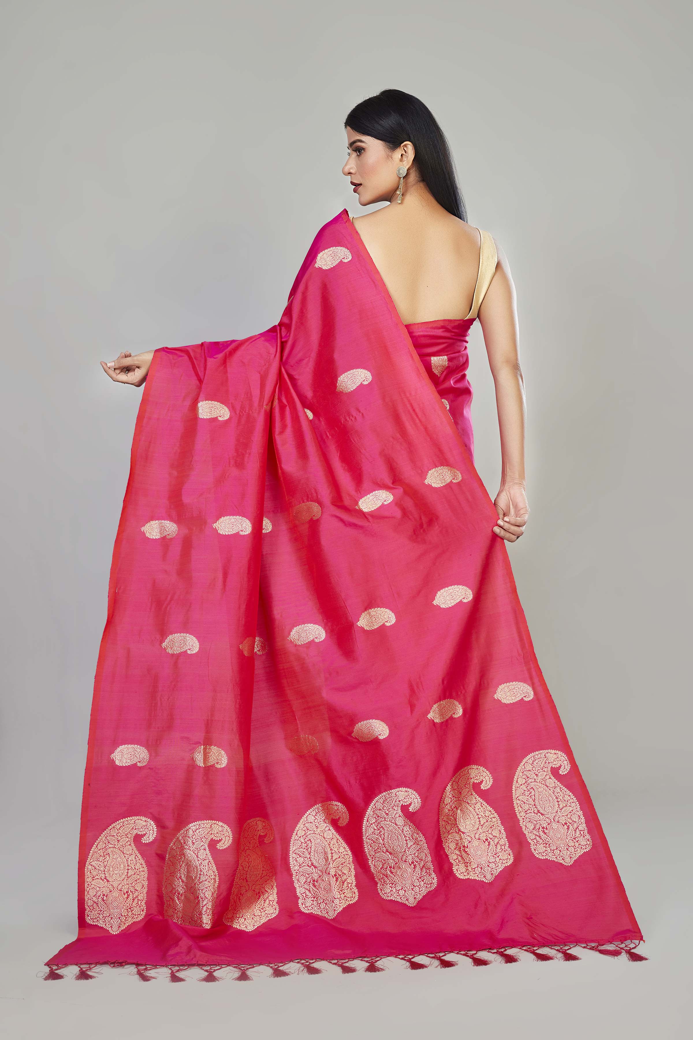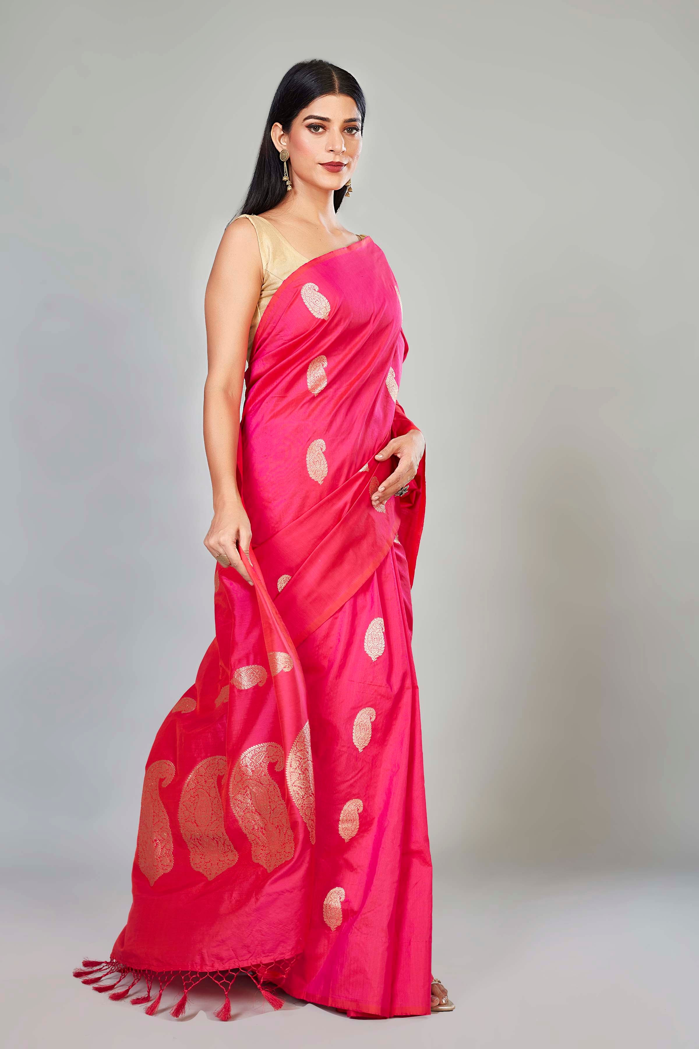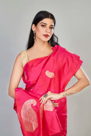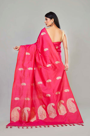 Look royal on festive occasions in this beautiful pink Katan silk Banarasi sari with paisley zari buta. It comes with a matching blouse piece.