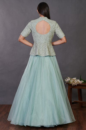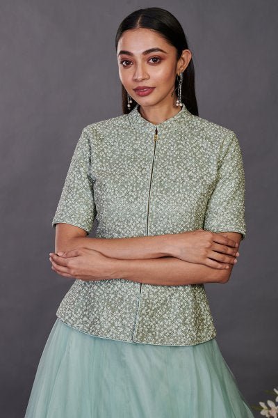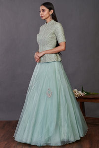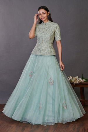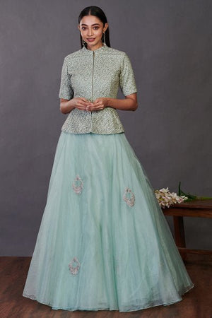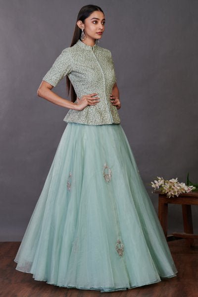 Beautiful aqua blue lehenga with embroidered katan jacket blouse. The lehenga is perfect for mehandi and sangeet parties. Shop online from Pure Elegance.