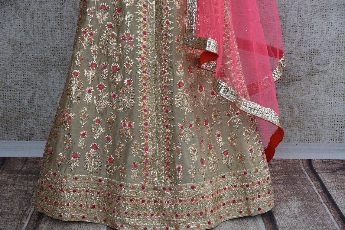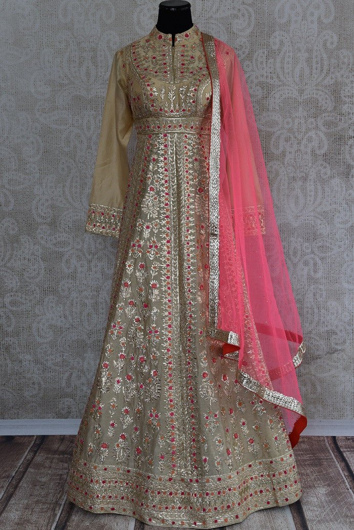 Beige fully embroidered designer anarkali suit comes with pink net dupatta . Perfect for wedding party and festivals.