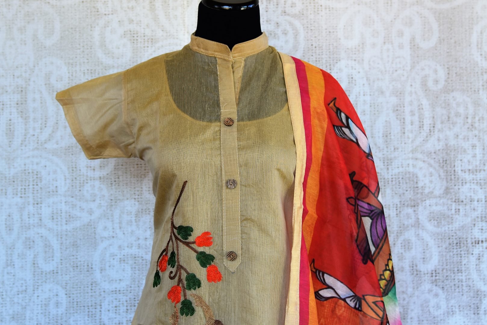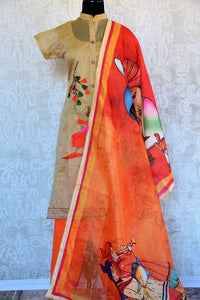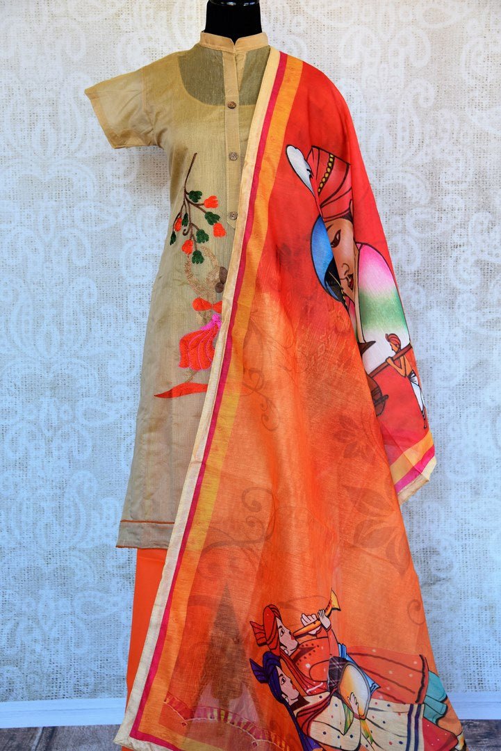 Elegant beige embroidered chanderi suit is a perfect choice for a cool summer look! It comes with a printed orange dupatta for completing your ethnic look. Buy online from Pure Elegance or visit our store in USA!