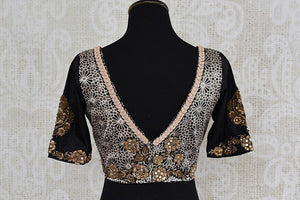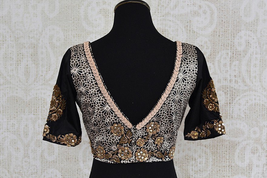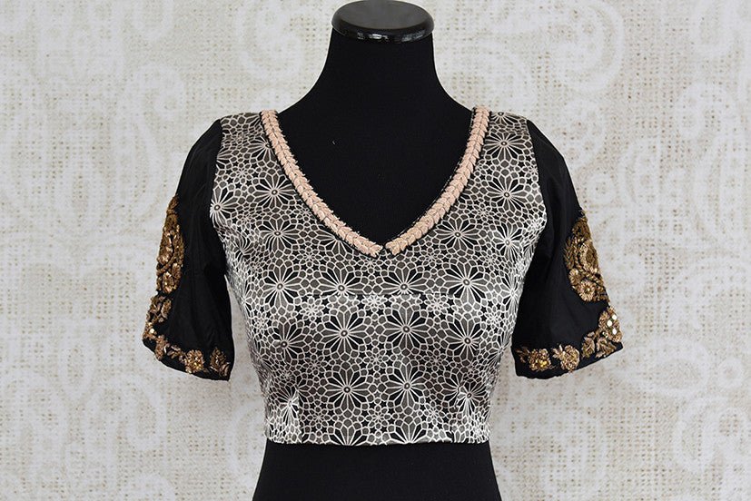 Black and white printed body with solid black embroidered sleeve blouse. Perfect blouse for any silk saree.