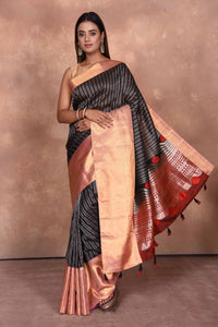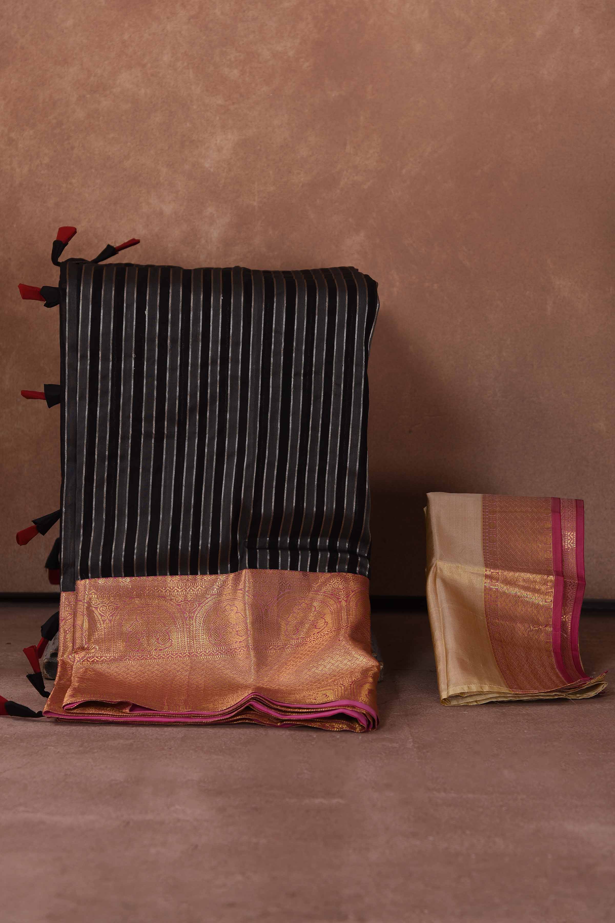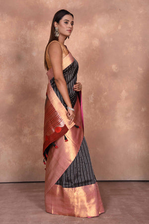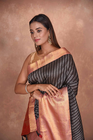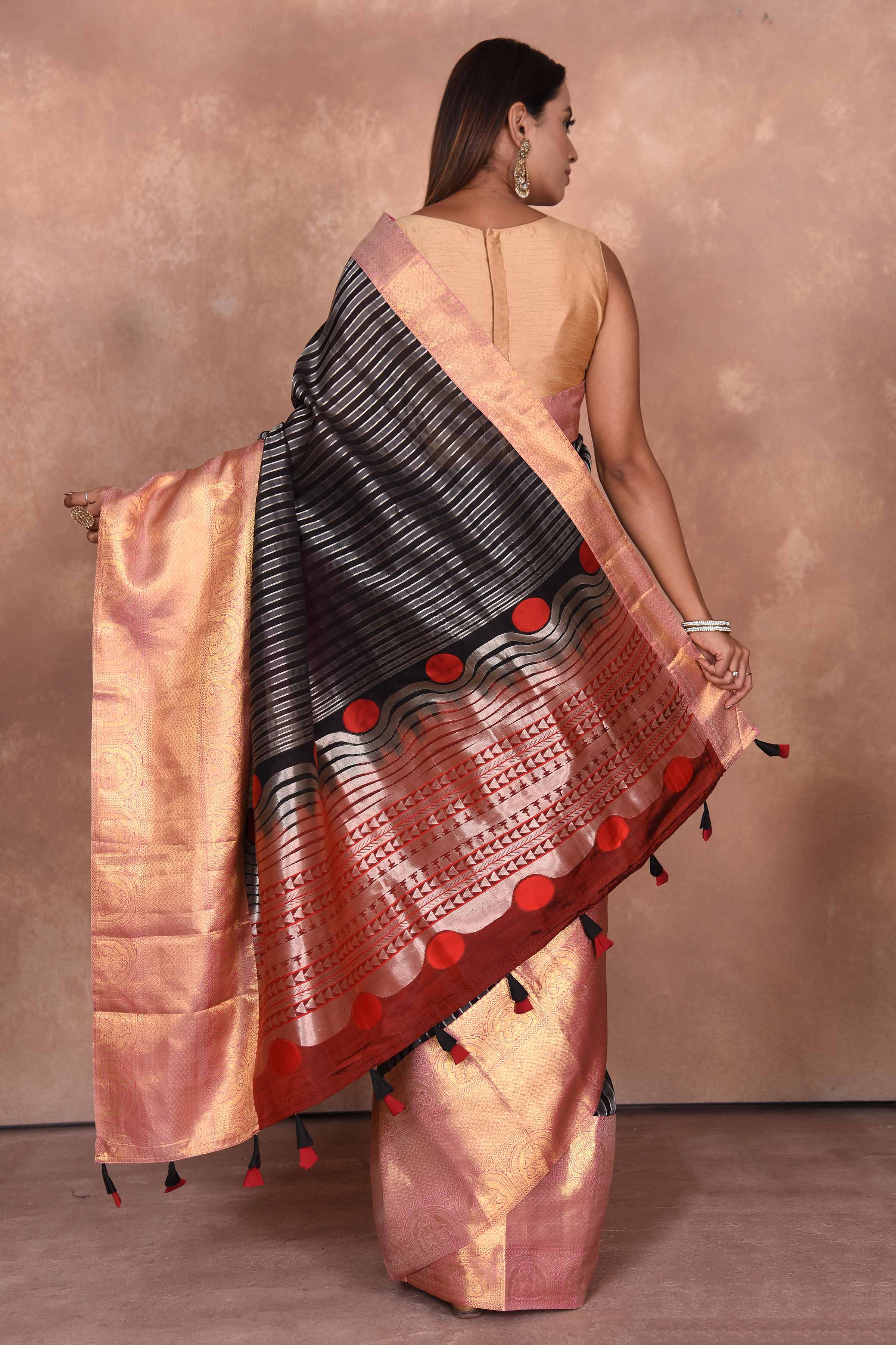 Beautiful black striped Kanjeevaram Kora saree with red zari border is perfect for light festive occasions. It comes with a matching blouse piece. Shop Indian sarees in USA from Pure Elegance.