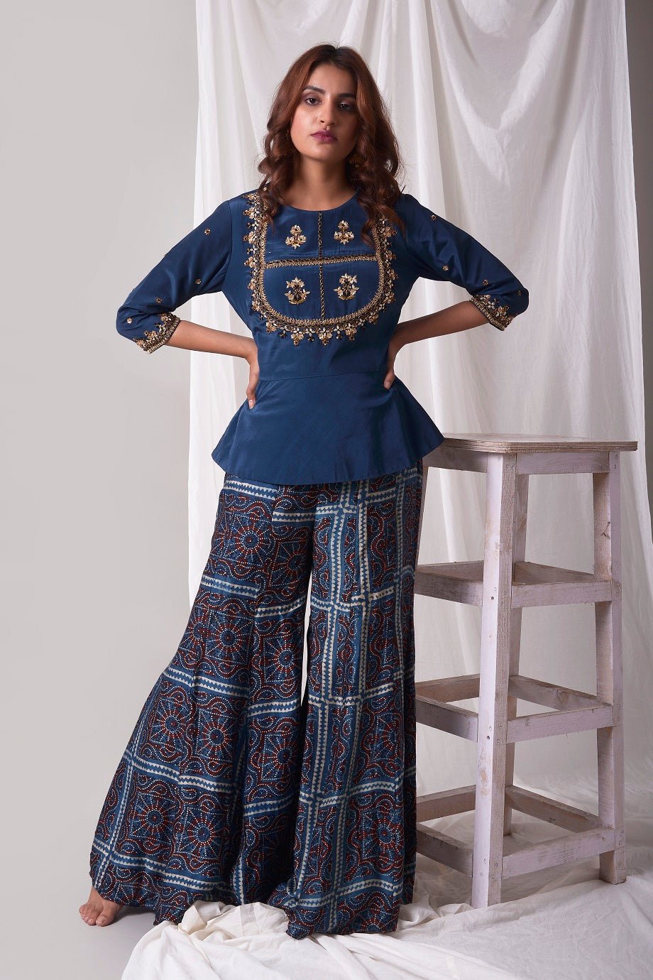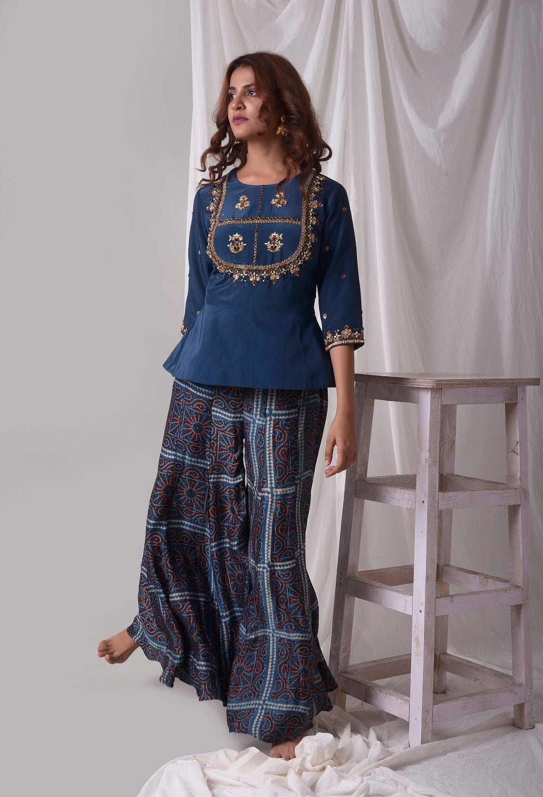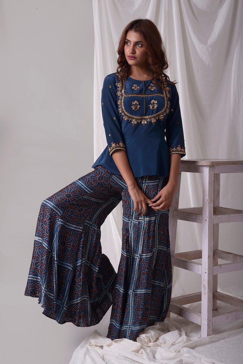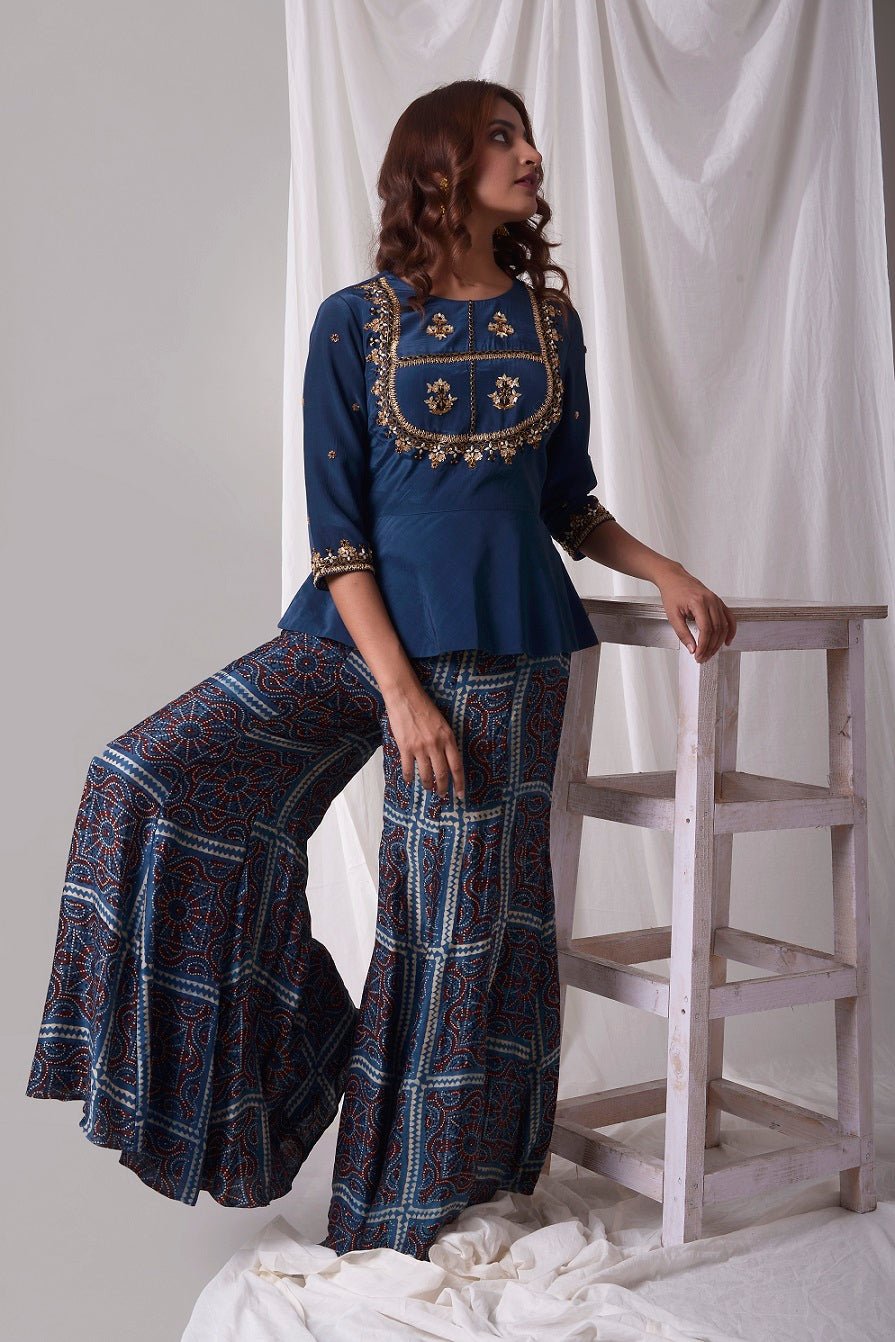 Beautiful blue modal suit is a stunning choice for weddings and festive occasions! The suit is crafted with fine simple gold and blue design work. The blue kurta is has 3/4 length sleeves and it has heavy design work at neckline. It comes with a matching blue palazzo. The suits simplicity gives it a unique and lovely look. Buy online from Pure Elegance.