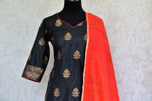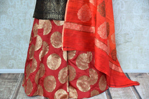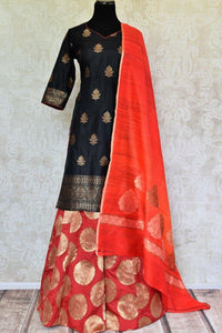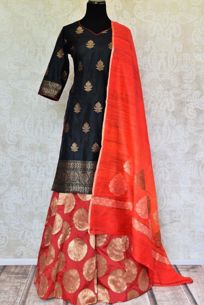 Traditional black Banarasi kurta with red Banarasi palazzo makes an absolutely striking outfit for wedding, festivals and many other occasions. The outfit is an alluring combination of a buta kurta and bright gold zari buta palazzo. It comes with a beautiful red dupatta. Add this rich traditional outfit to your wardrobe now!