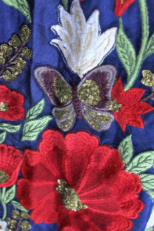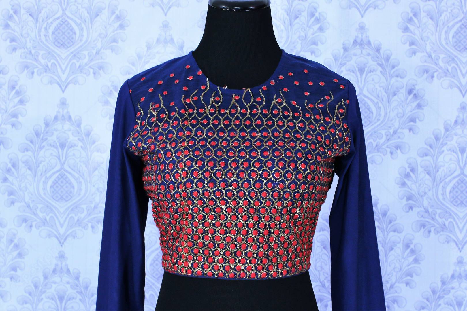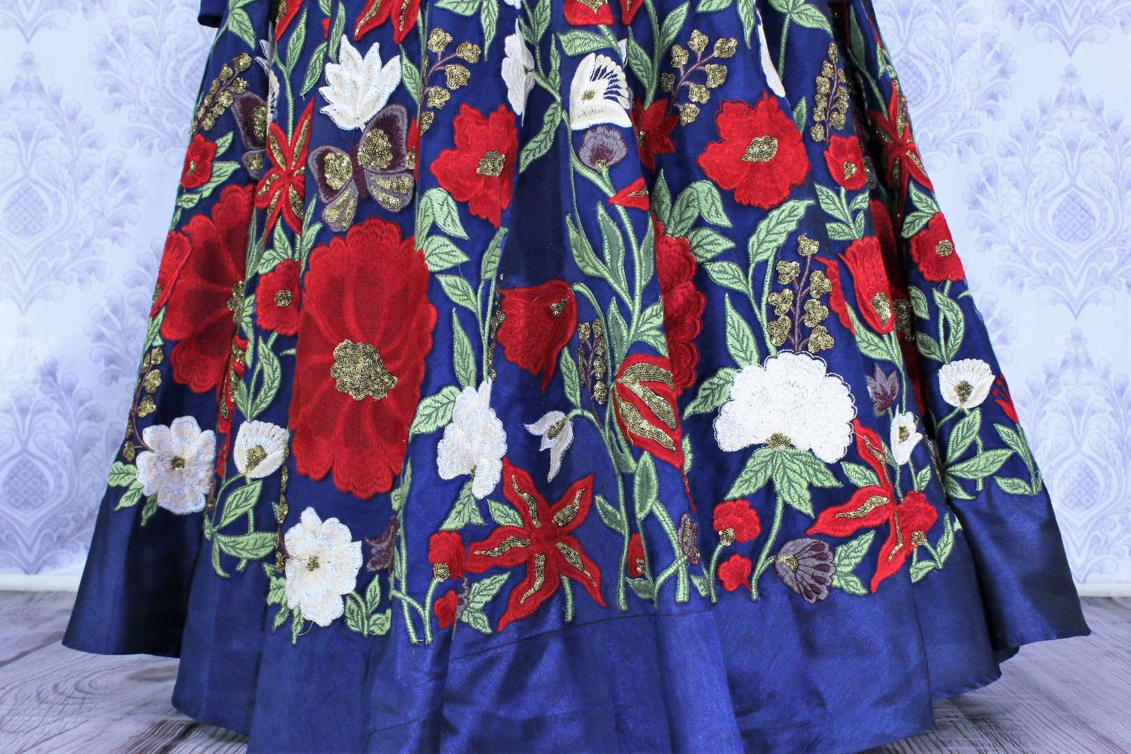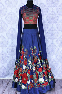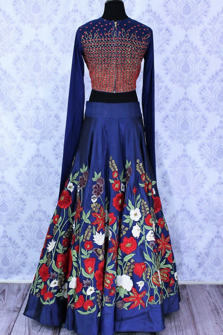 Striking blue embroidered designer lehenga is a beautiful pick for wedding or wedding functions like sangeet or cocktail. The dress is perfectly ornated with red floral embroidery and has a long sleeves design which makes it a dazzler. Buy online from Pure Elegance or visit our store in USA.
