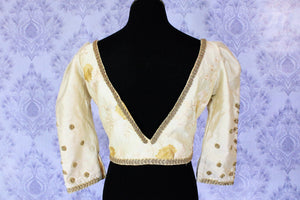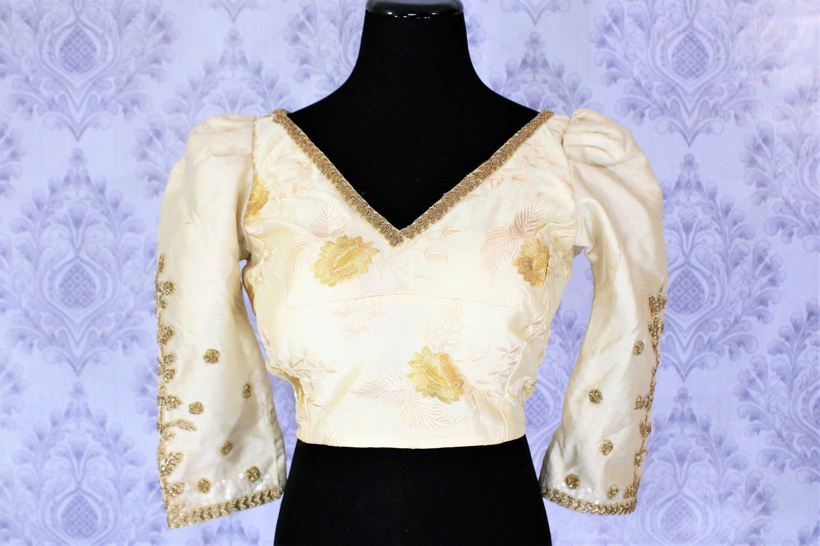 Cream Embroidered designer saree blouse for an alluring saree look. The blouse has puffed sleeves and stylish v-neckline. Shop online at Pure Elegance or visit our store in USA!