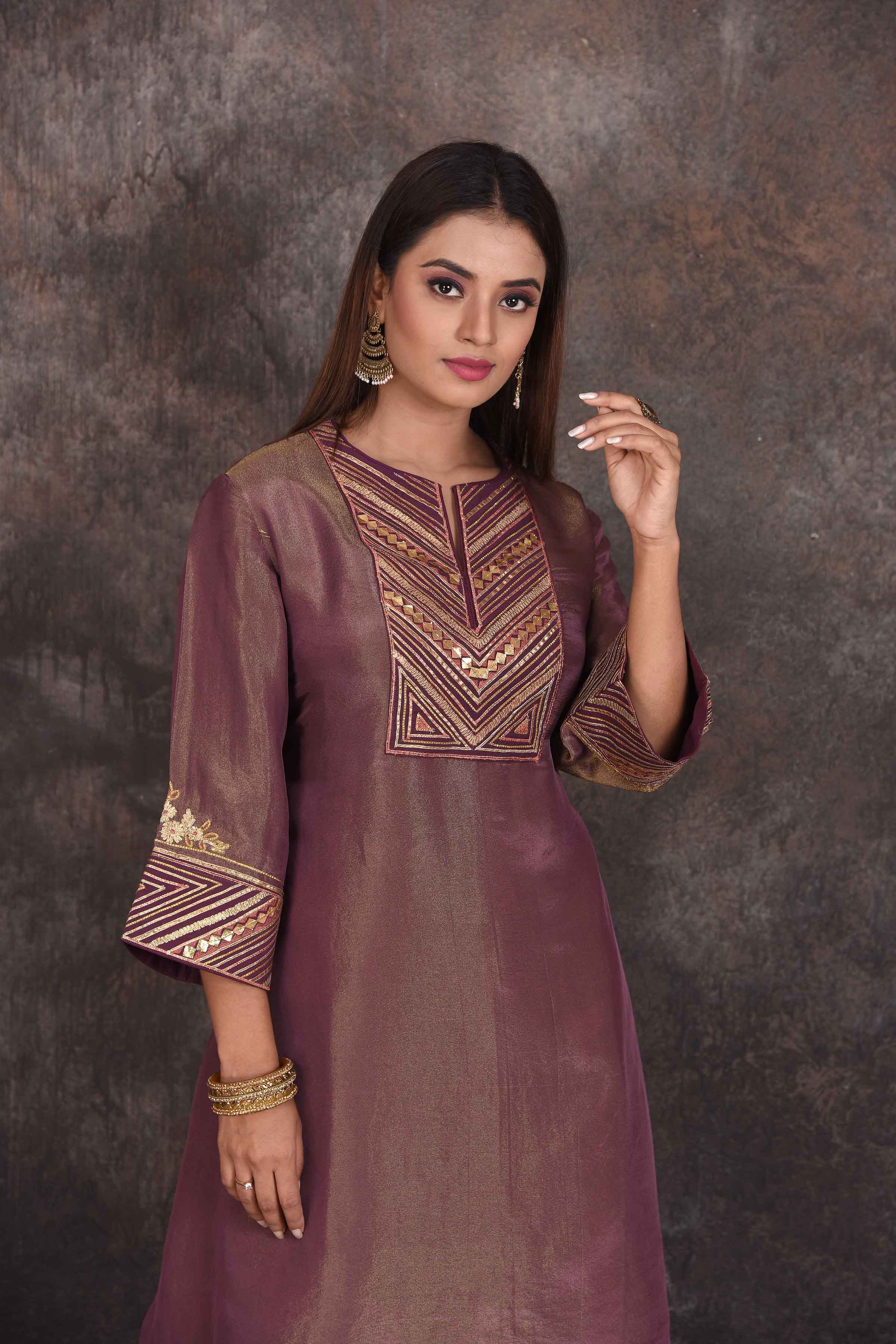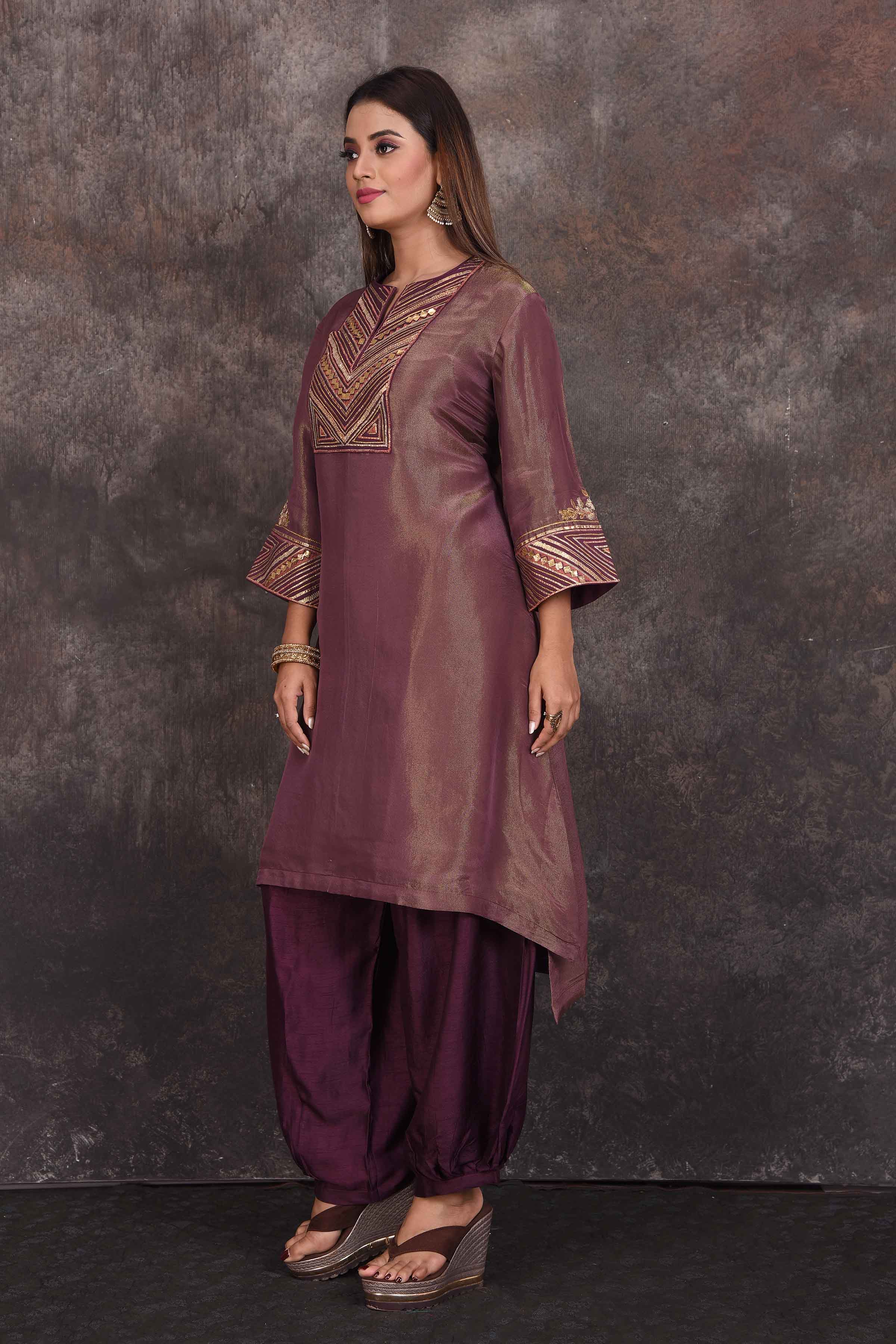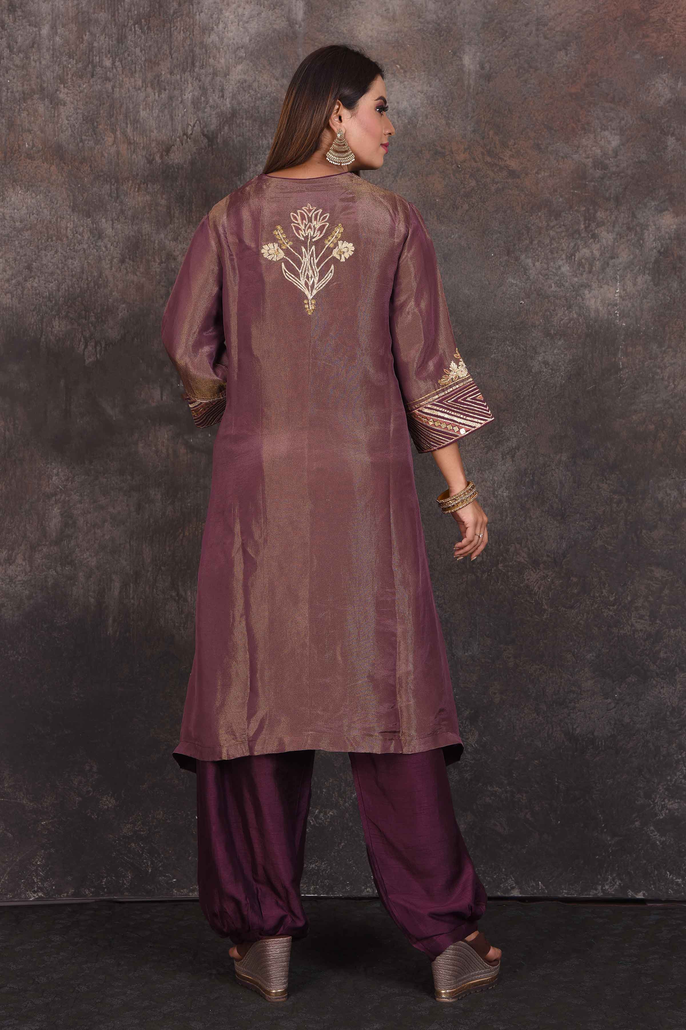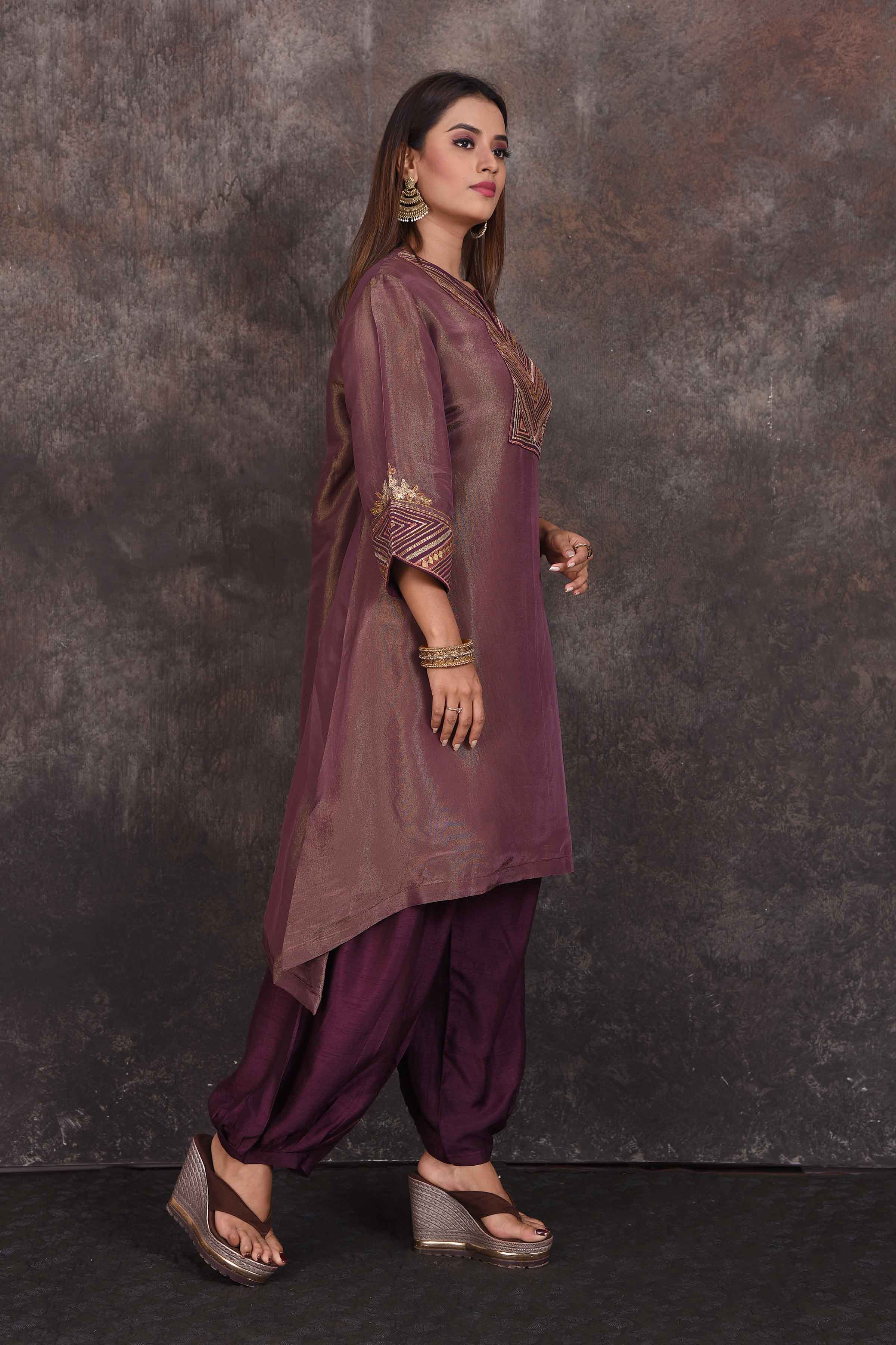 Look simple yet stylish in this beautiful golden purple embroidered salwar suit. Shop designer dresses in USA from Pure Elegance.