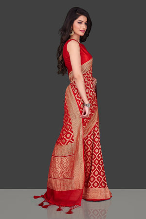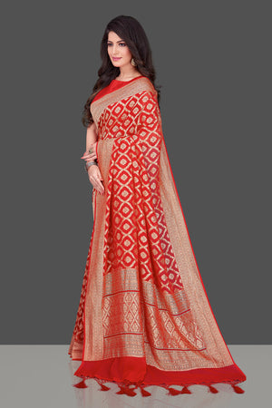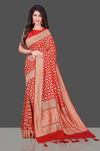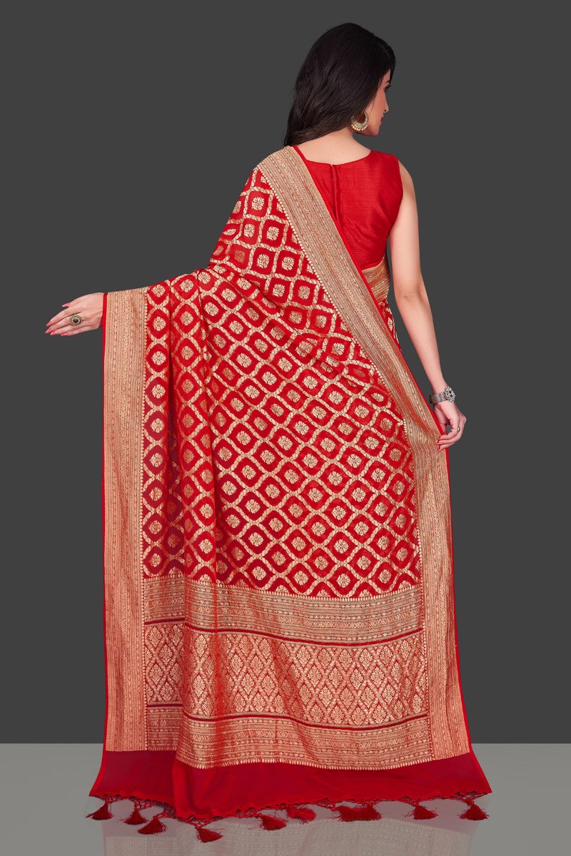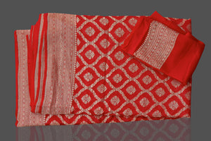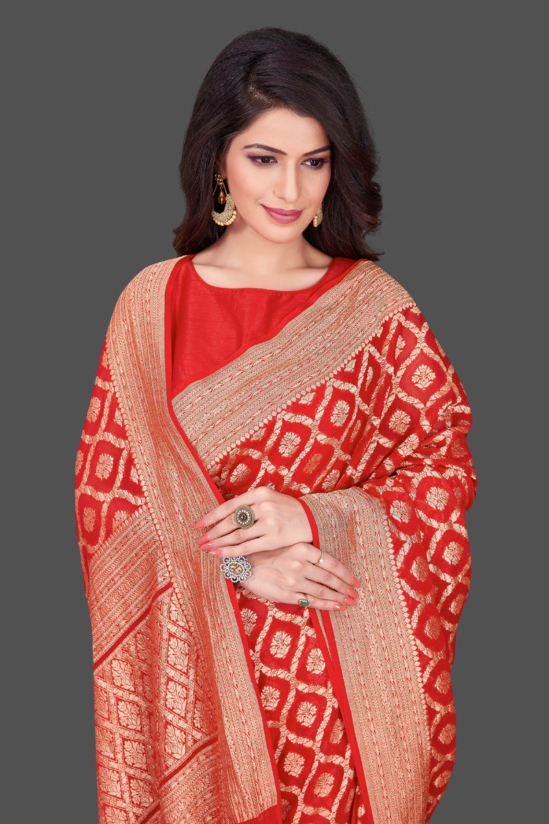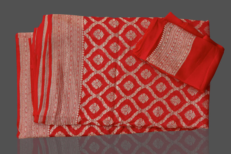 Beautiful red Banarasi georgette sari for weddings and festive occasions. The saree is enhanced with floral zari jaal work throughout. It comes with a matching blouse piece. Buy online from Pure elegance.