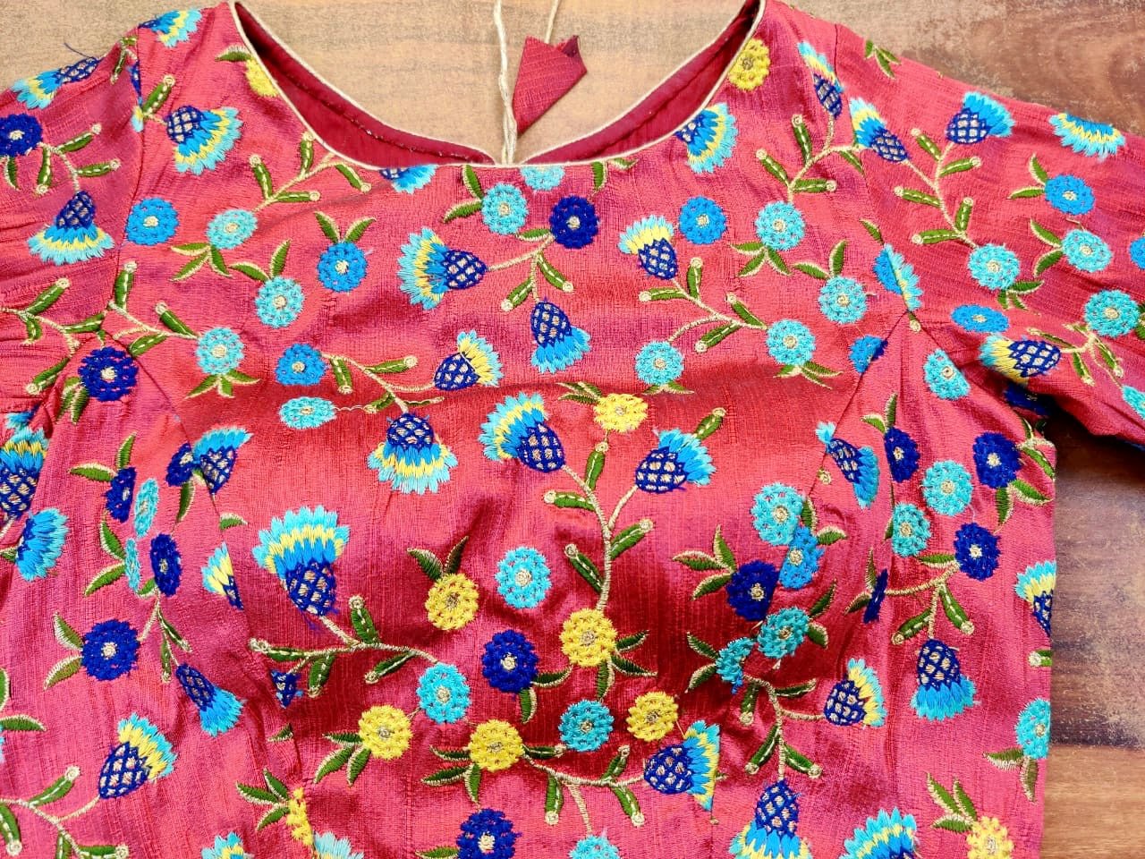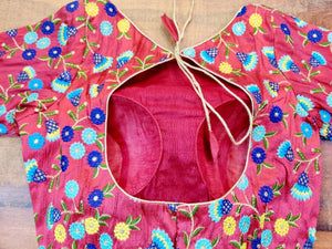 Gorgeous red embroidered silk designer saree blouse. Buy online from Pure Elegance.