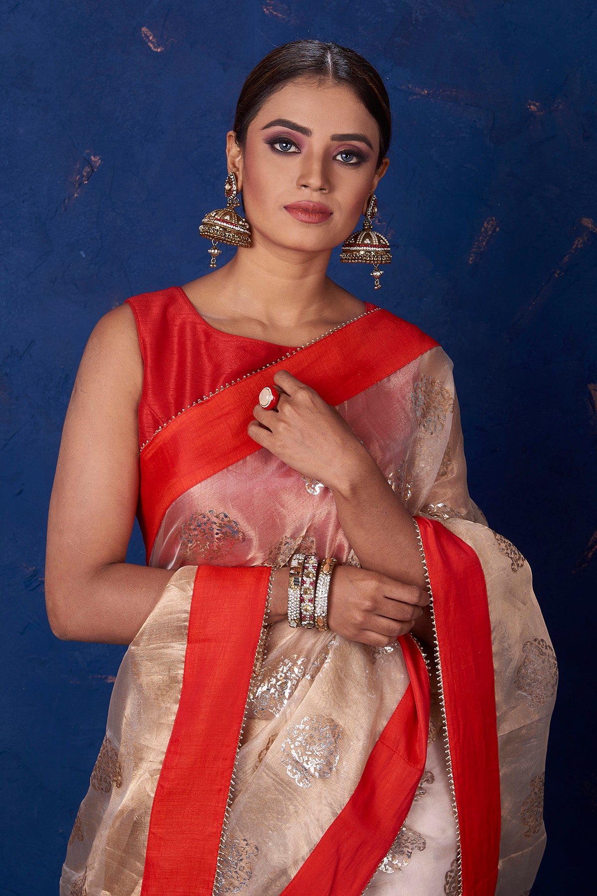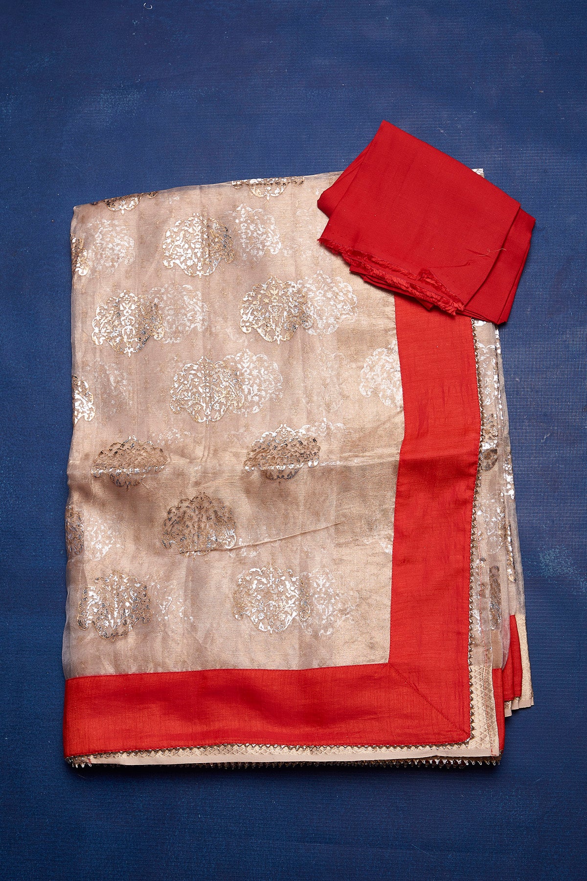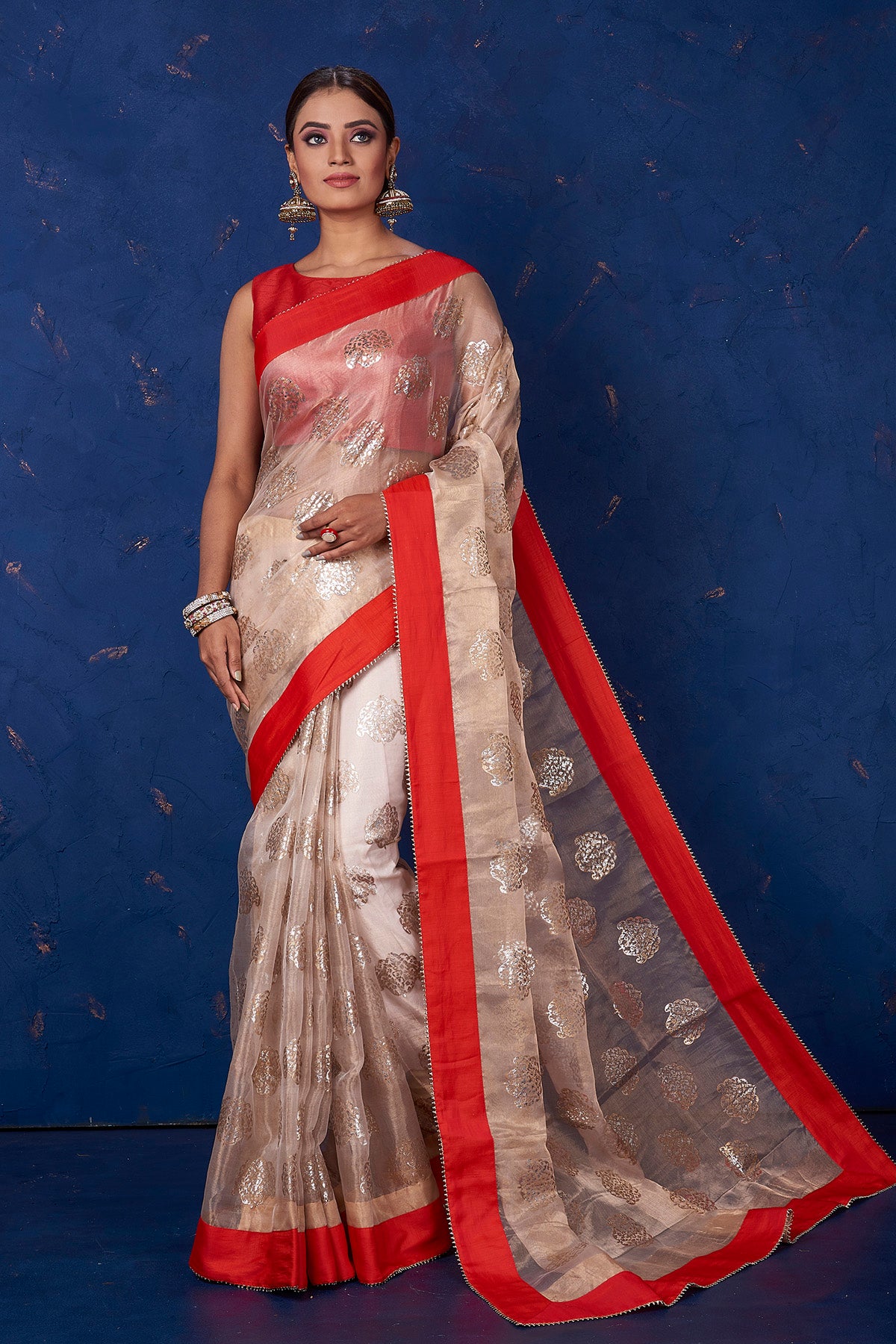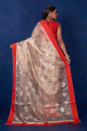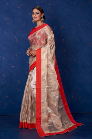 Be the center of attraction in this beige foil print organza saree with solid red border on festive occasions and intimate family soirees. It comes with a matching blouse piece.