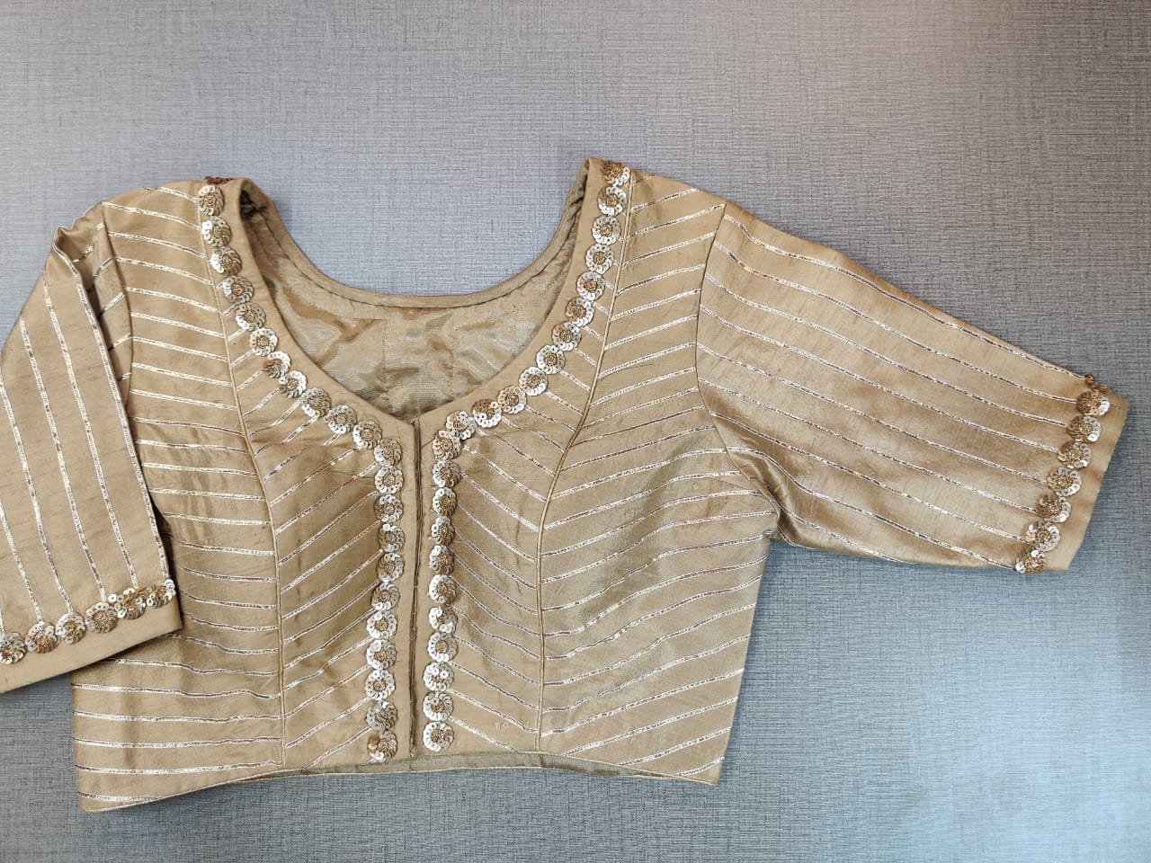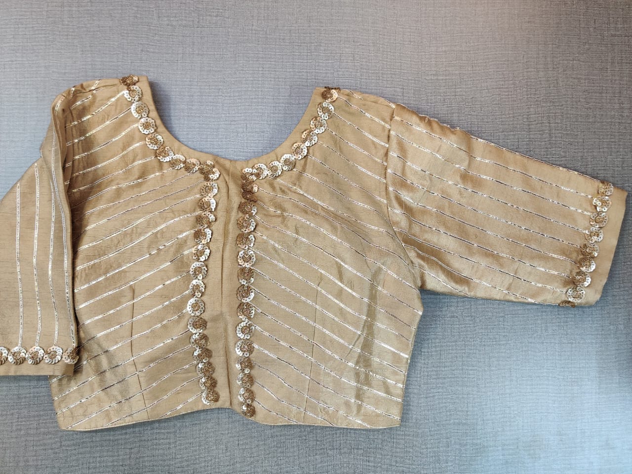 Beautiful beige gota work sari blouse with sequin work. Buy designer blouse in USA from Pure Elegance.