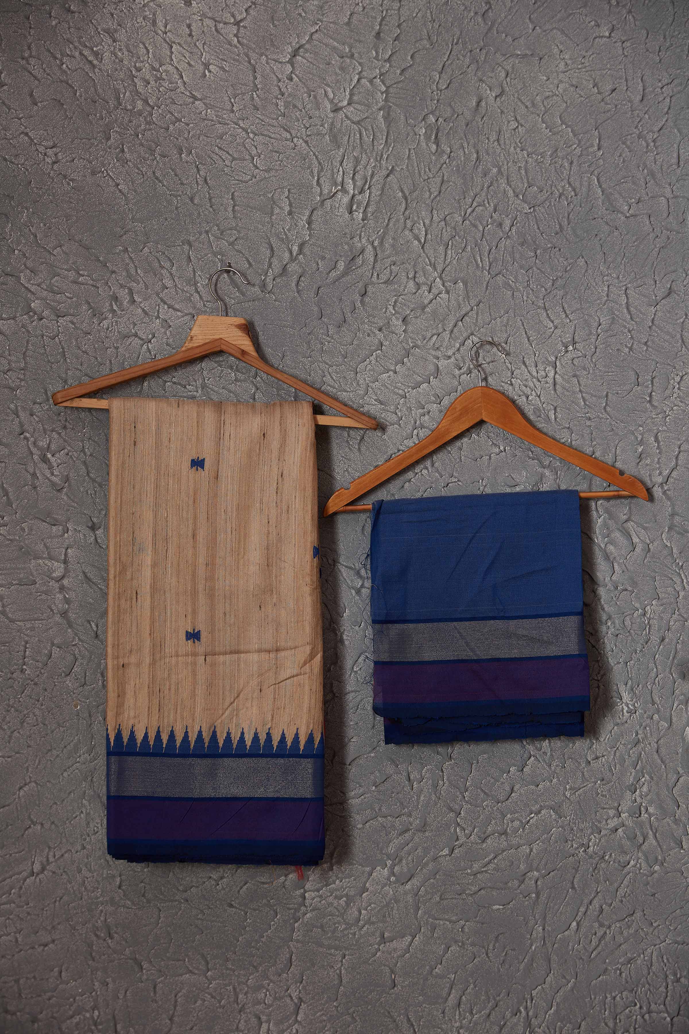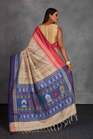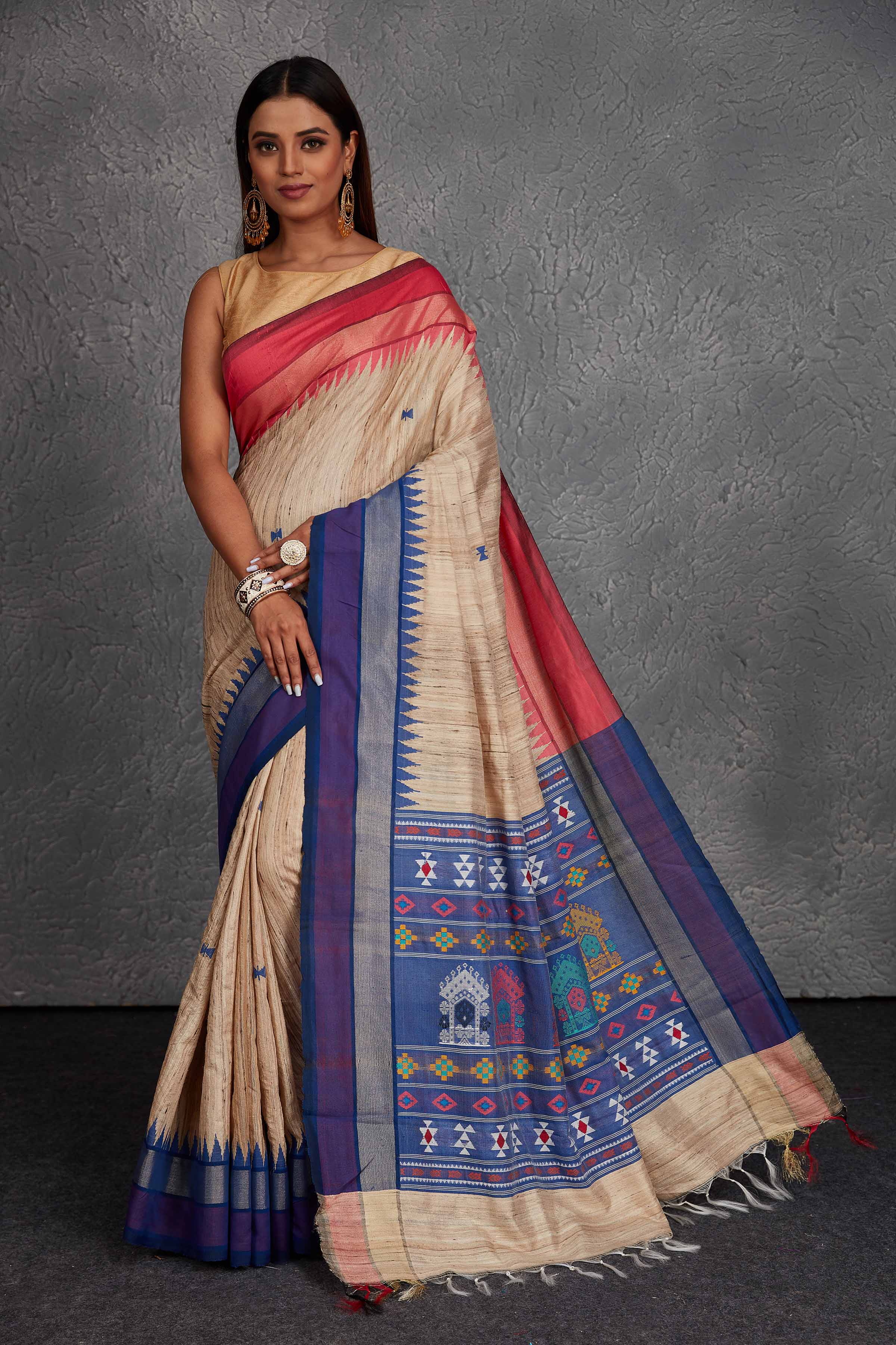Be the highlight of the occasions in this stunning beige tussar silk sari with blue multicolor weave pallu. It comes with a matching blouse piece.