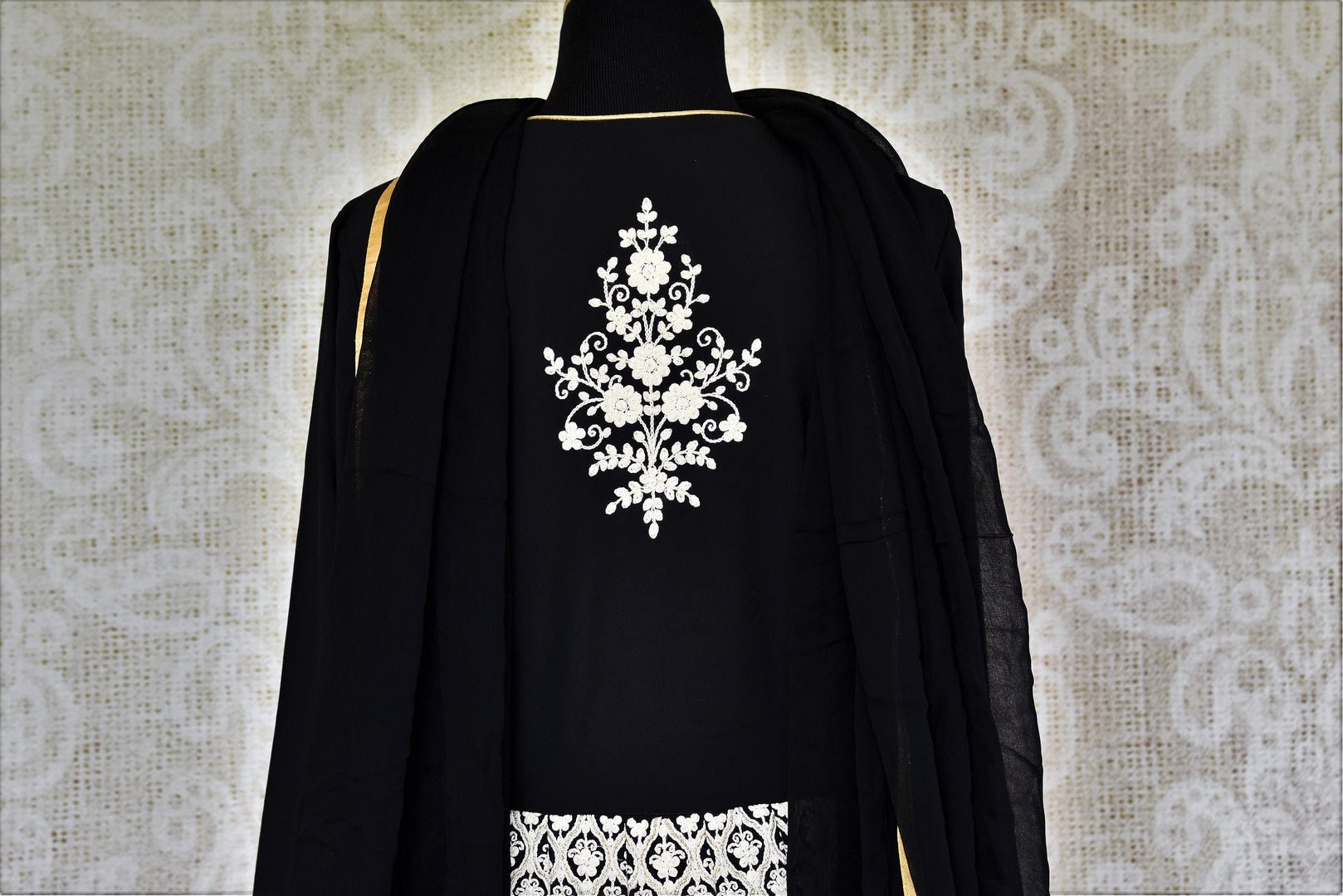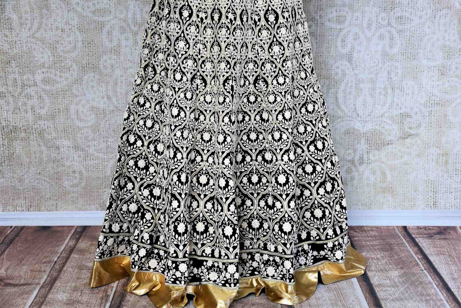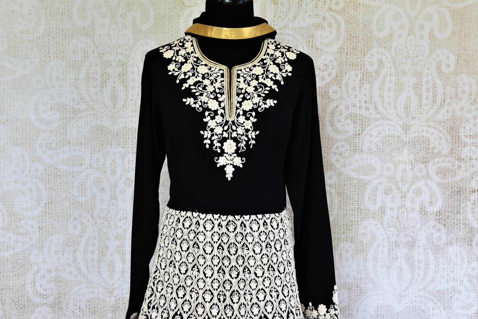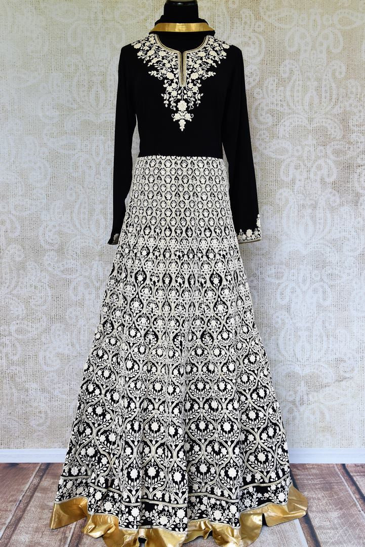 Make a style statement with this designer black georgette embroidered Anarkali floor length suit. From weddings to parties this suit is your go-to choice for a stunning Indian look. It is decorated with overall white thread embroidery and gold gota lace which makes the design absolutely alluring. It comes with a matching black dupatta. Buy online from Pure Elegance or visit our store in USA!