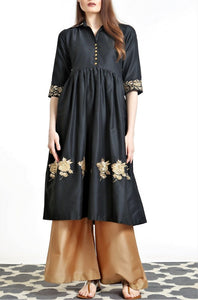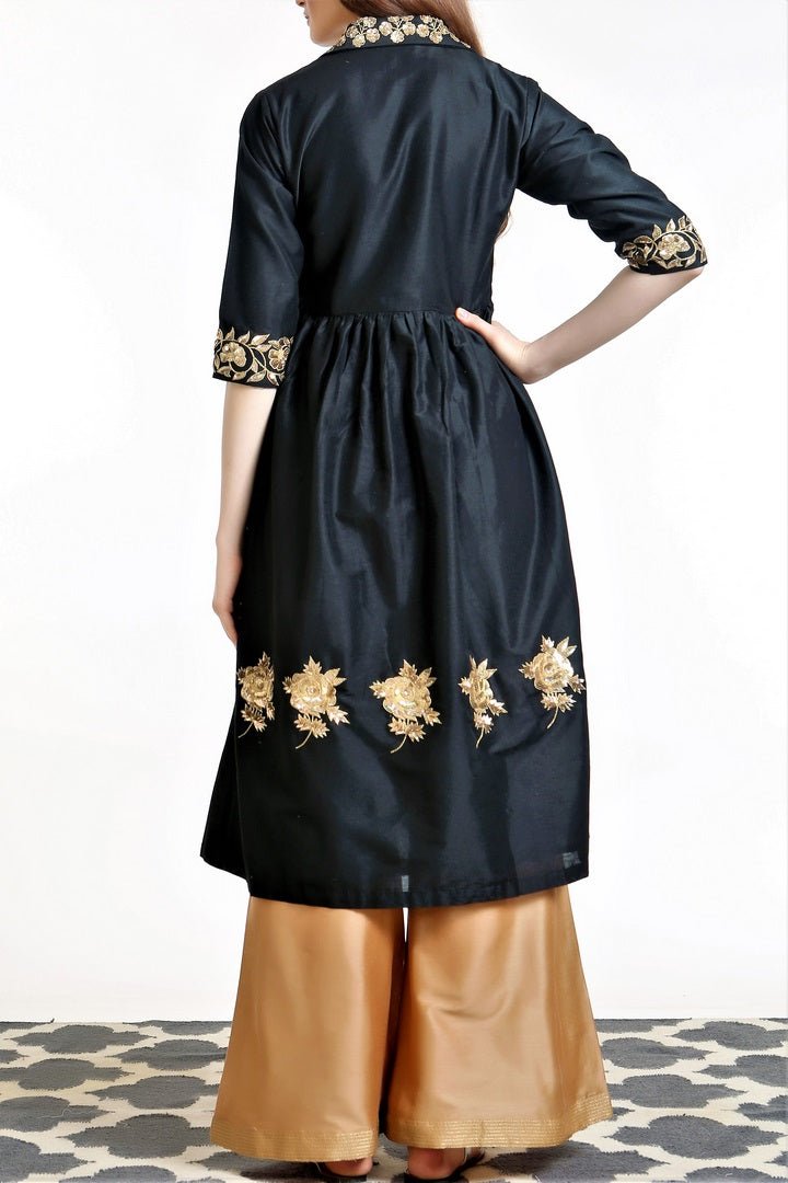 Gorgeous black silk blend hand embroidered tunic with collars for festive occasions. It comes with gold palazzo. Shop online at Pure Elegance or visit our store in USA.