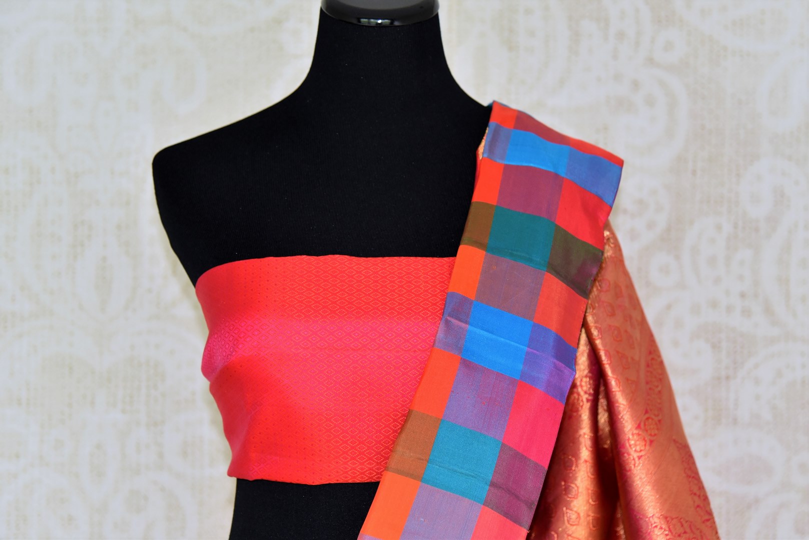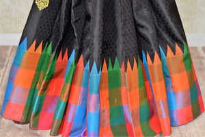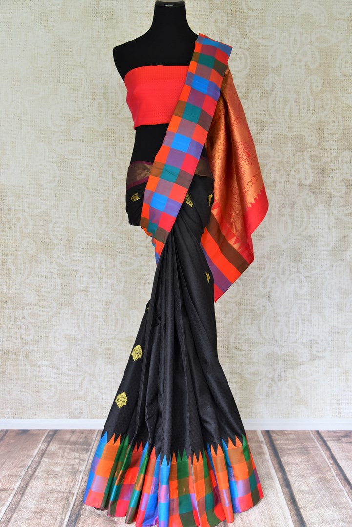 Beautiful and unique design black Kanjivaram silk sari for wedding occasions! The saree has a multicolor check border and red zari pallu and buta. It comes with a red blouse piece. Shop online at Pure Elegance or visit our store in USA.