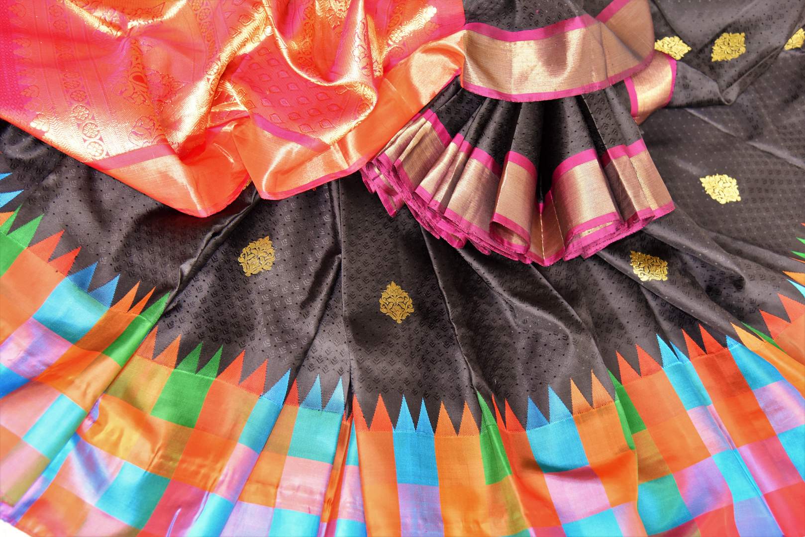 90G609 Black Kanjivaram Saree with Multicolor Check Border and Zari Buta