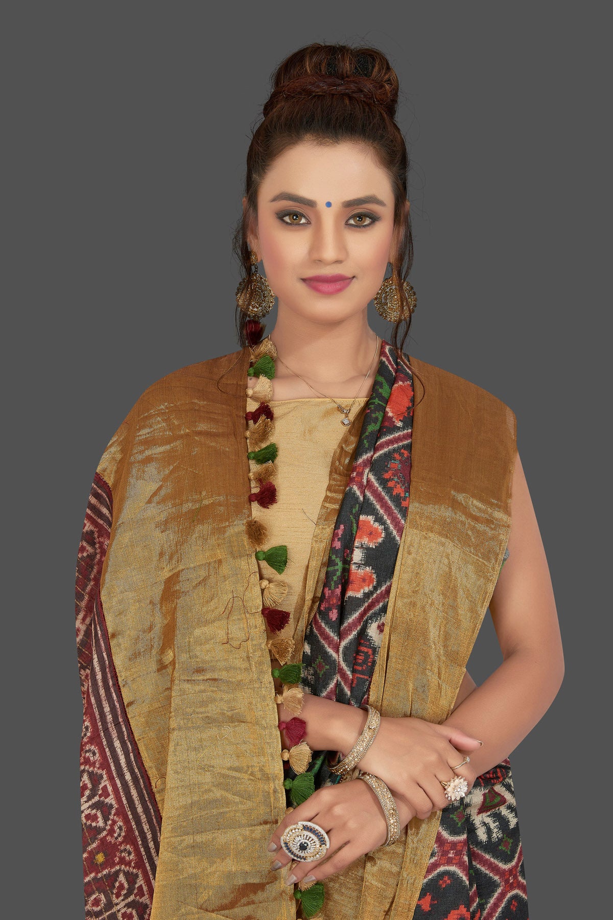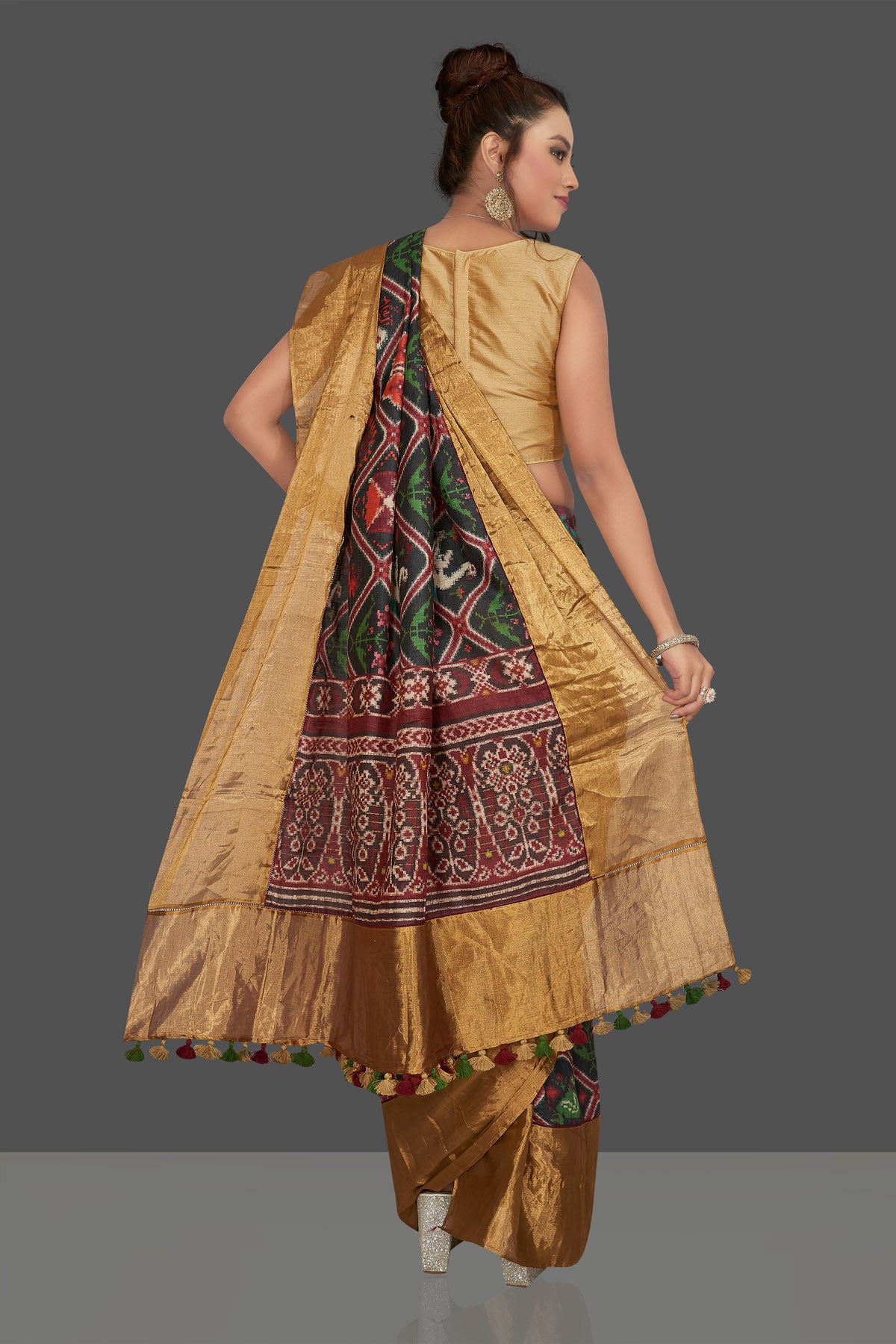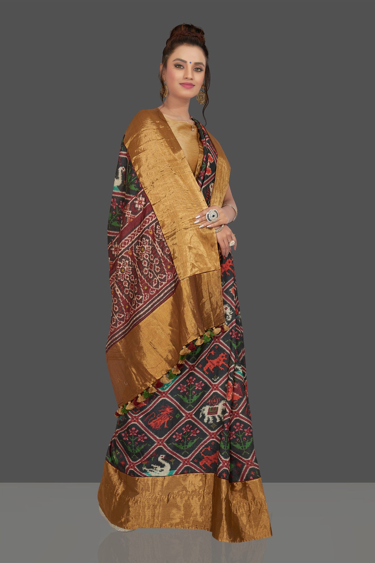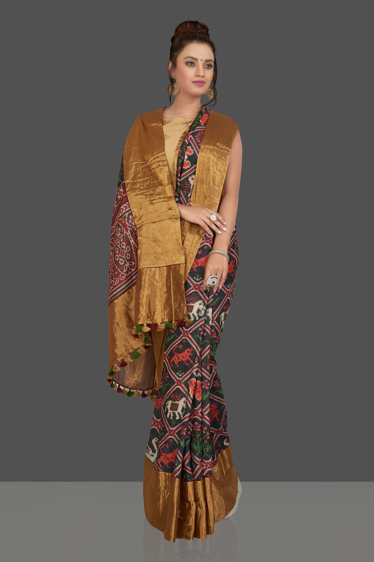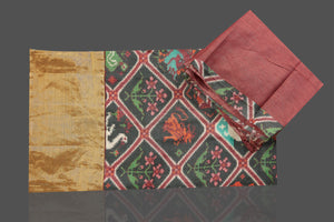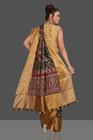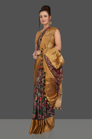 Look striking on special occasions in this attractive black printed Patola tussar saree. The saree is enhanced with golden border and pallu . It comes with a matching blouse piece. Shop designer sarees online in USA from Pure Elegance.