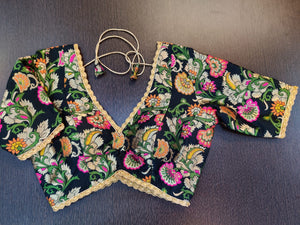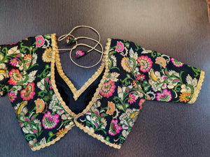 Gorgeous black zari minakari saree blouse with golden lace. Shop designer saree blouse online in USA from Pure Elegance.