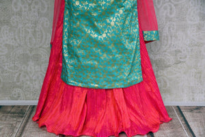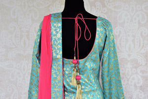 A simple yet striking outfit for festivals and family occasions. Beautiful blue Banarasi kurta has subtle embroidery on the front and sleeves, the back design is ornated with dori and latkans. It comes with a pink skirt and a matching dupatta. Buy online from Pure Elegance in USA!