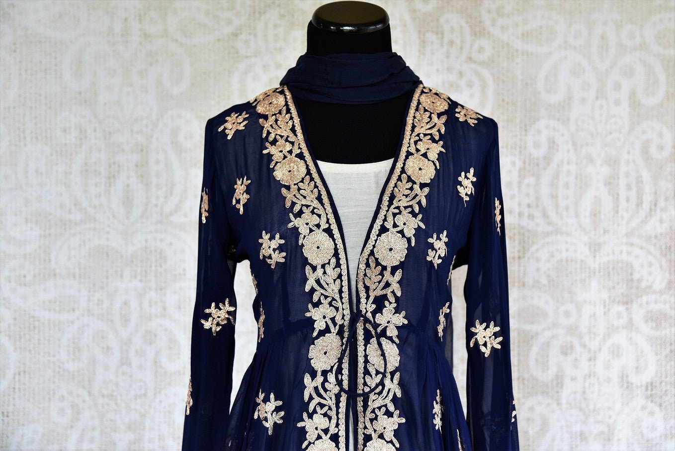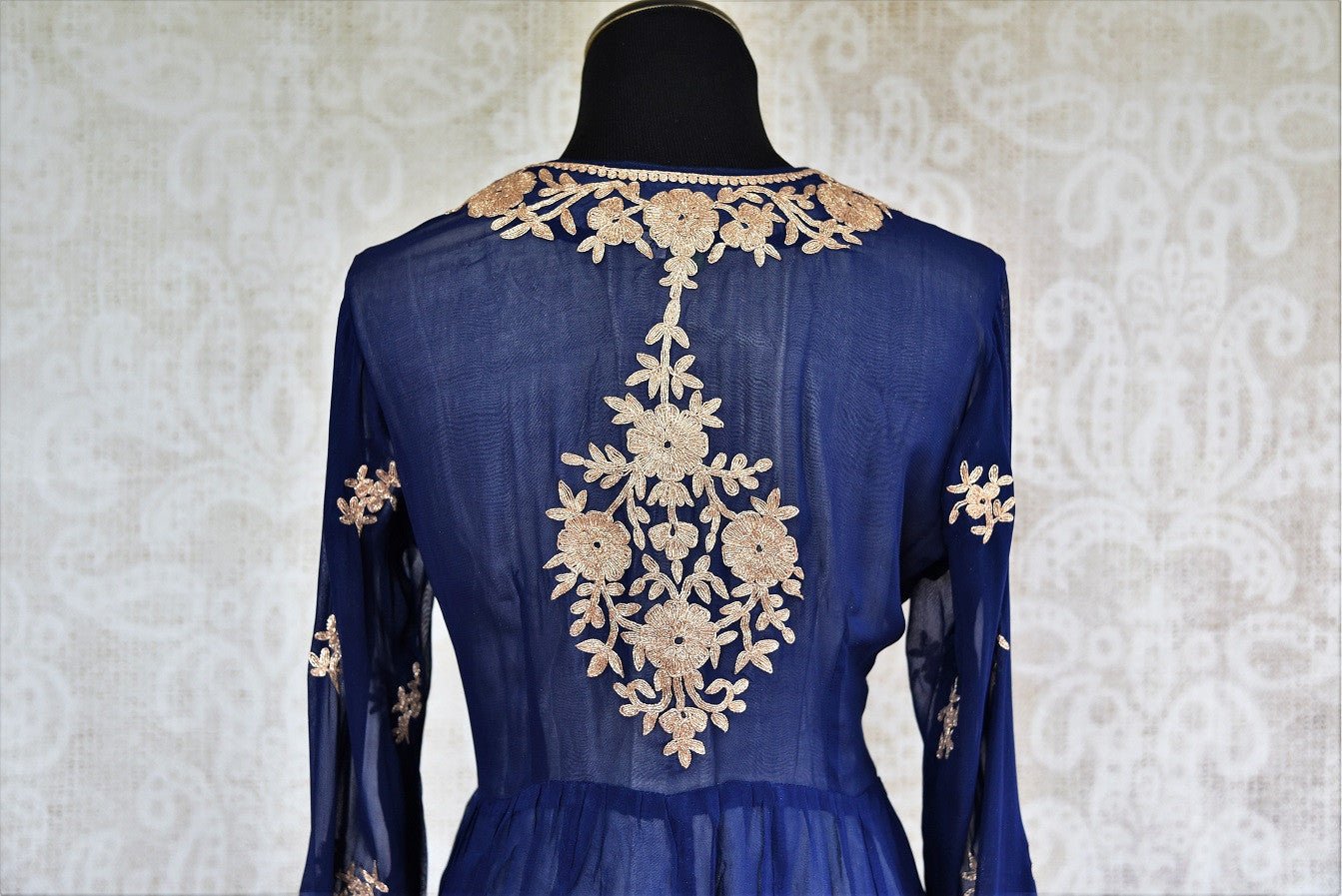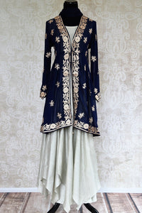 This stylish Indowestern dress is a great choice for festivals or family celebrations. The white chanderi palazzo is beautifully layered with an embroidered blue chiffon kurta. This is a unique and one of a kind dress, add it to your wardrobe now!