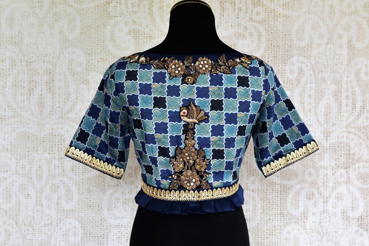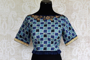 Stylish Blue Embroidered Blouse with boat neck can amp up any simple saree. The delicate zardozi work ornates the blouse beautifully. Little frill detail in the blouse makes it visually interesting. Wear it with a black cotton saree and you are good to go!
