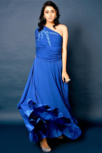 Shine like a red carpet diva in this bright blue embroidered one-shoulder gown by Chhavvi Aggarwal. Shop online at Pure Elegance or visit our store in USA.