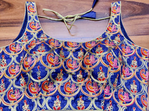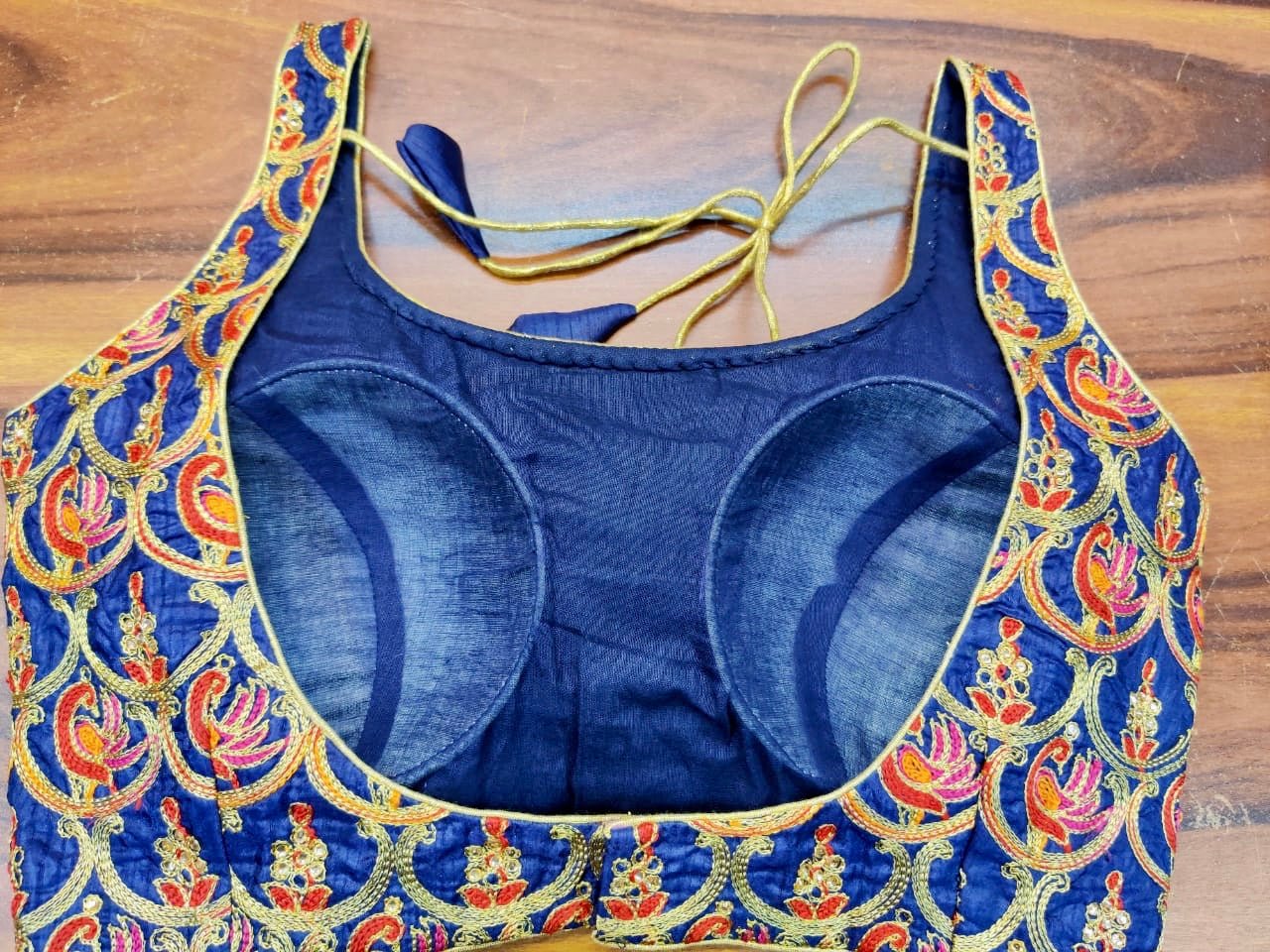 Elevate your ethnic saree look with this stunning blue embroidered silk sleeveless designer saree blouse. Buy online from Pure Elegance.