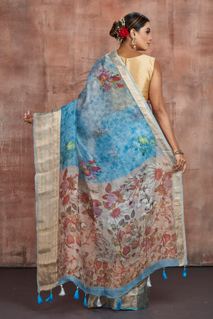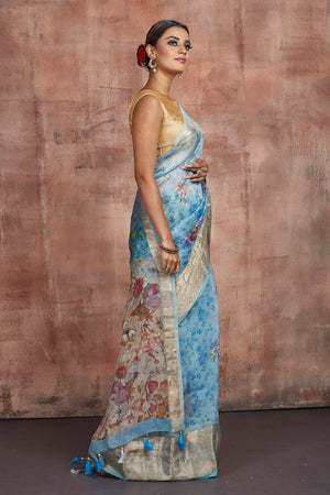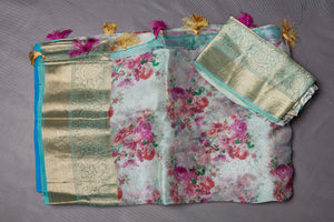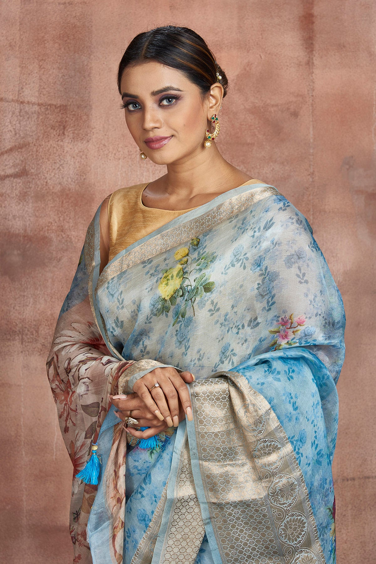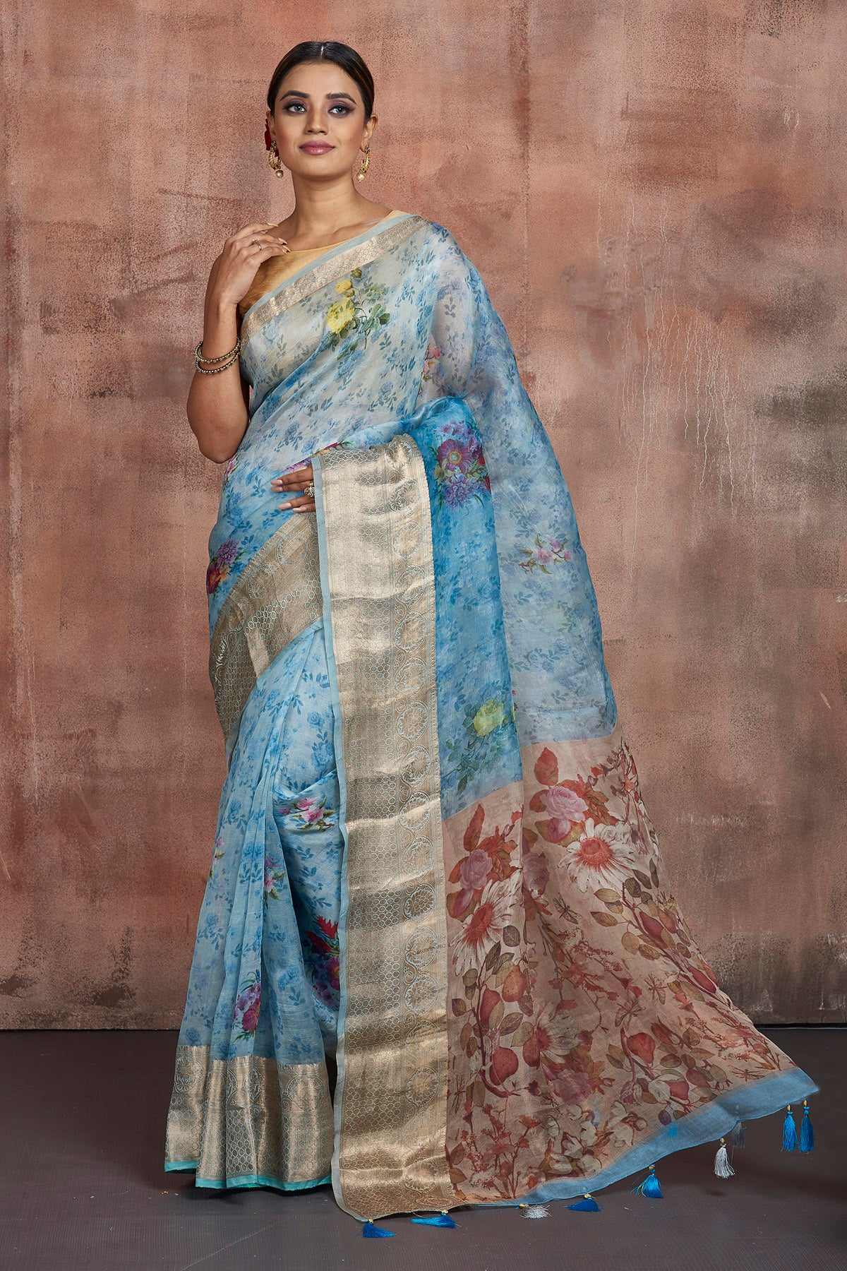 Beautiful blue floral organza sari is a perfect drape for festivals! The saree is enhanced with a golden zari green border and contrasting pallu. It comes with a matching blouse piece. Shop organza sarees in USA from Pure Elegance.