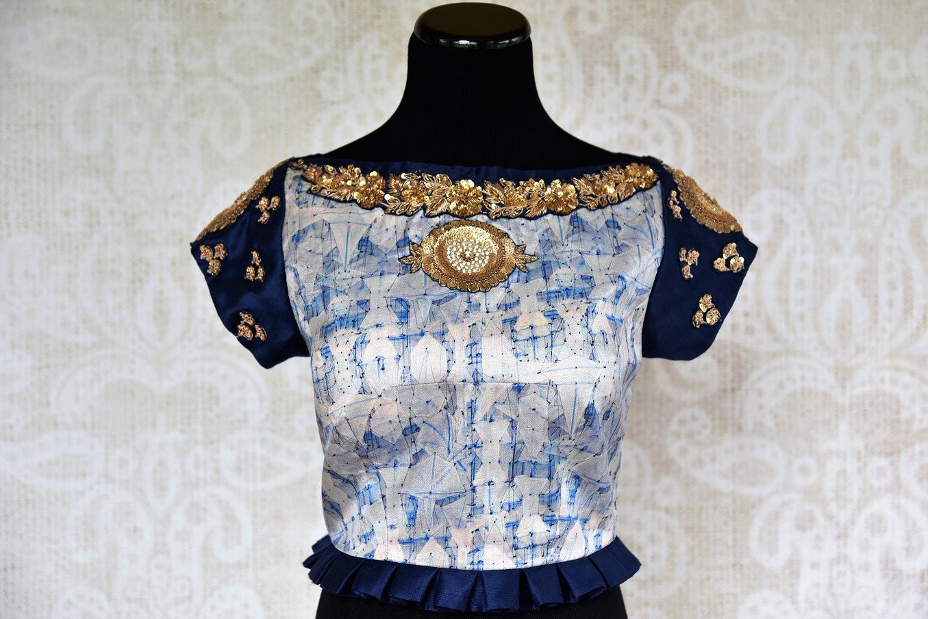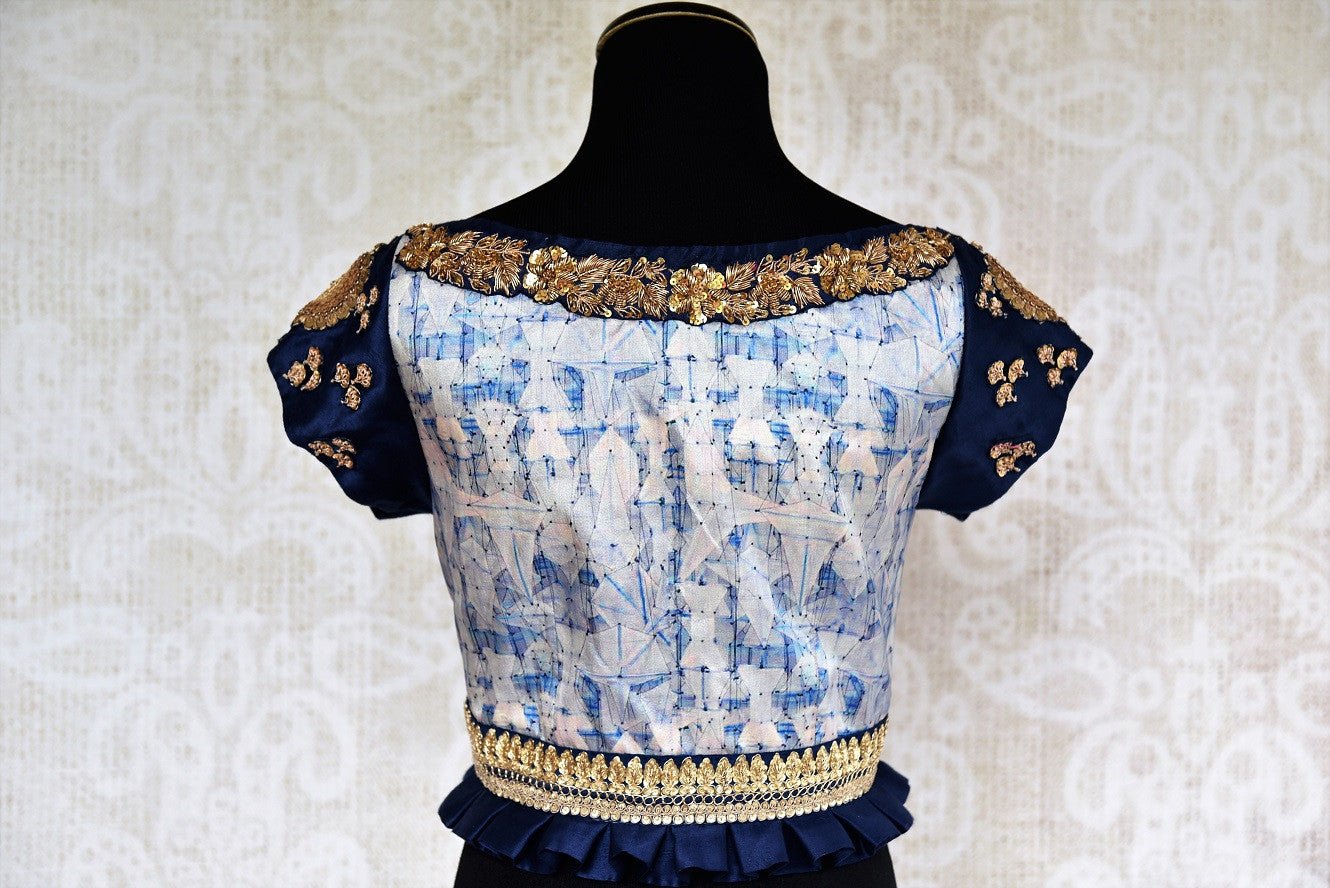 Stylish silk sari blouse in blue color and a unique print looks one of a kind. The blouse has a fine zardozi embroidery on the boat neckline, sleeves, and back which highlights it perfectly. The frill detail adds a quirky twist to the blouse. Wear a stylish black silk sari to complement this unique blouse! Add it to your wardrobe now.